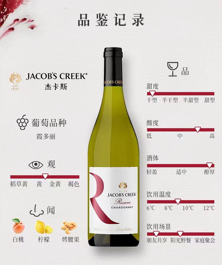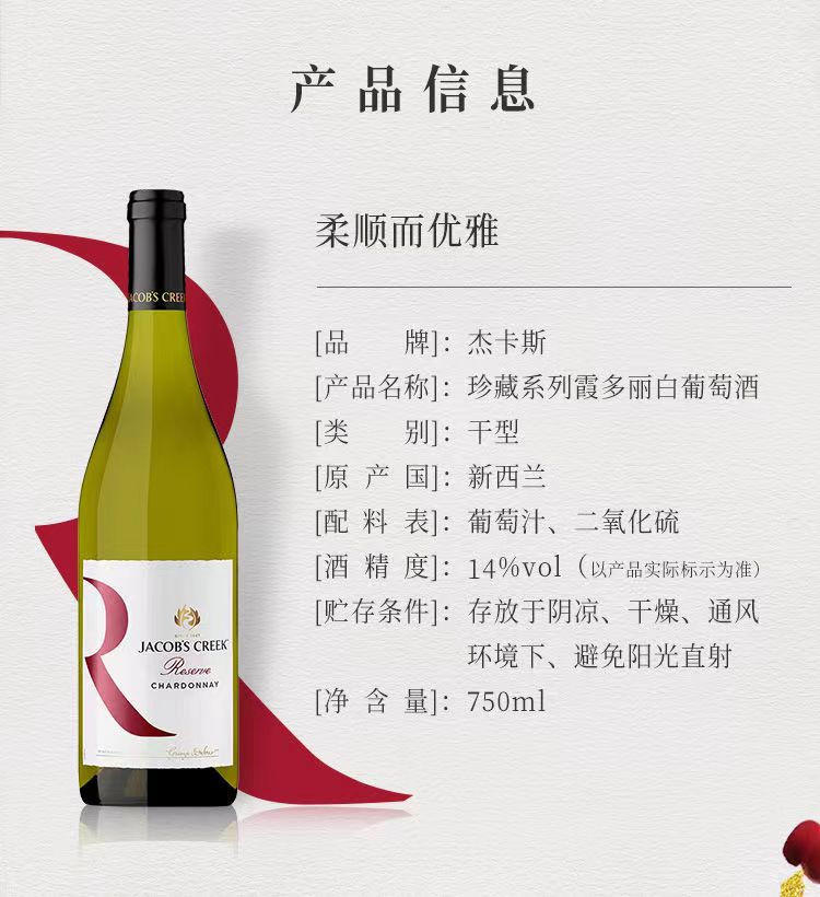 杰卡斯 珍藏系列霞多丽白葡萄酒 750ml*1瓶