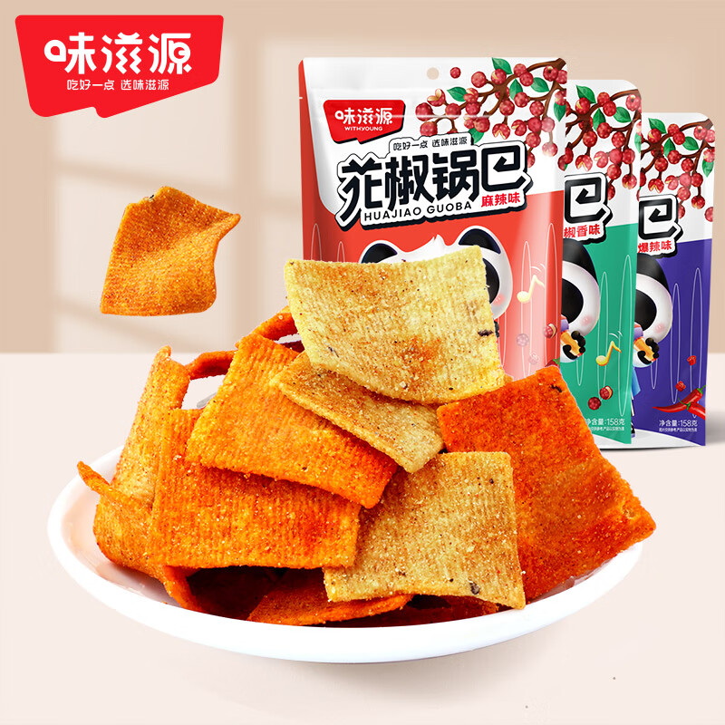 【分仓直发包邮】味滋源锅巴组合装1082g(黑金锅巴(肉松味)108g*1+花椒锅巴158g(爆辣味)*1+花椒锅巴158g(椒香味)*1+花椒锅巴158g(麻辣味)*1+糯米锅巴500g(辣味))