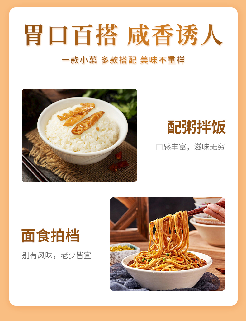 开袋即食,开胃小菜,可搭配米饭、面条;