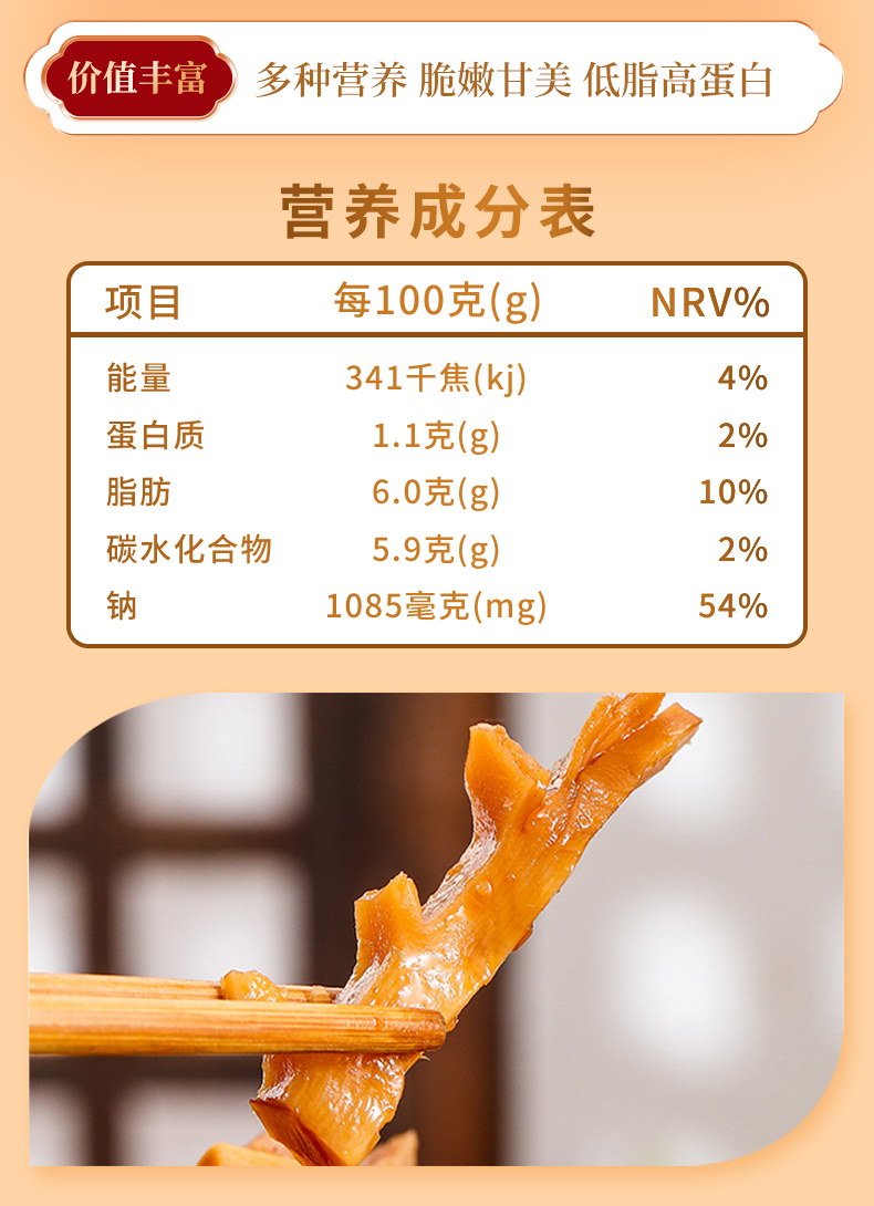 肉质厚实,笋味香浓,鲜咸带甜,好吃不腻口,营养健康;