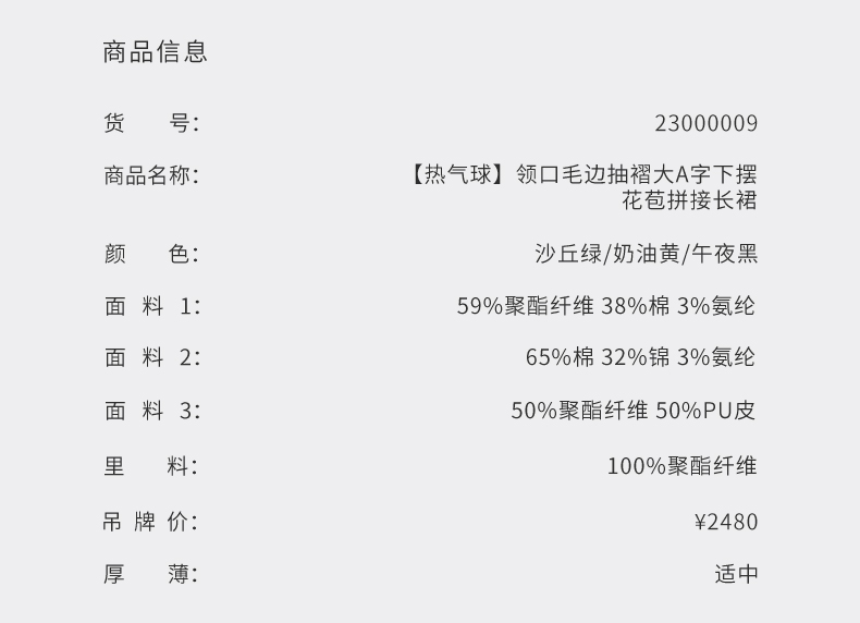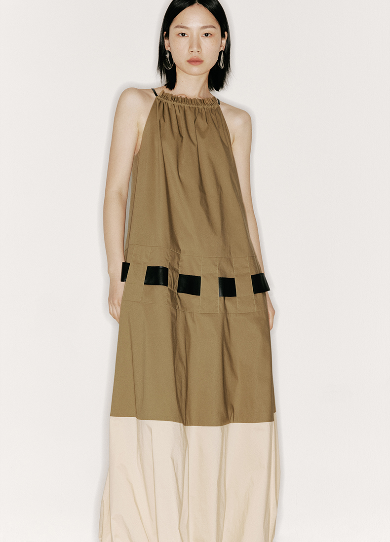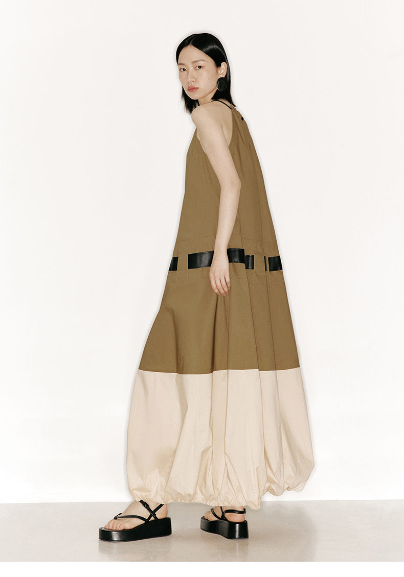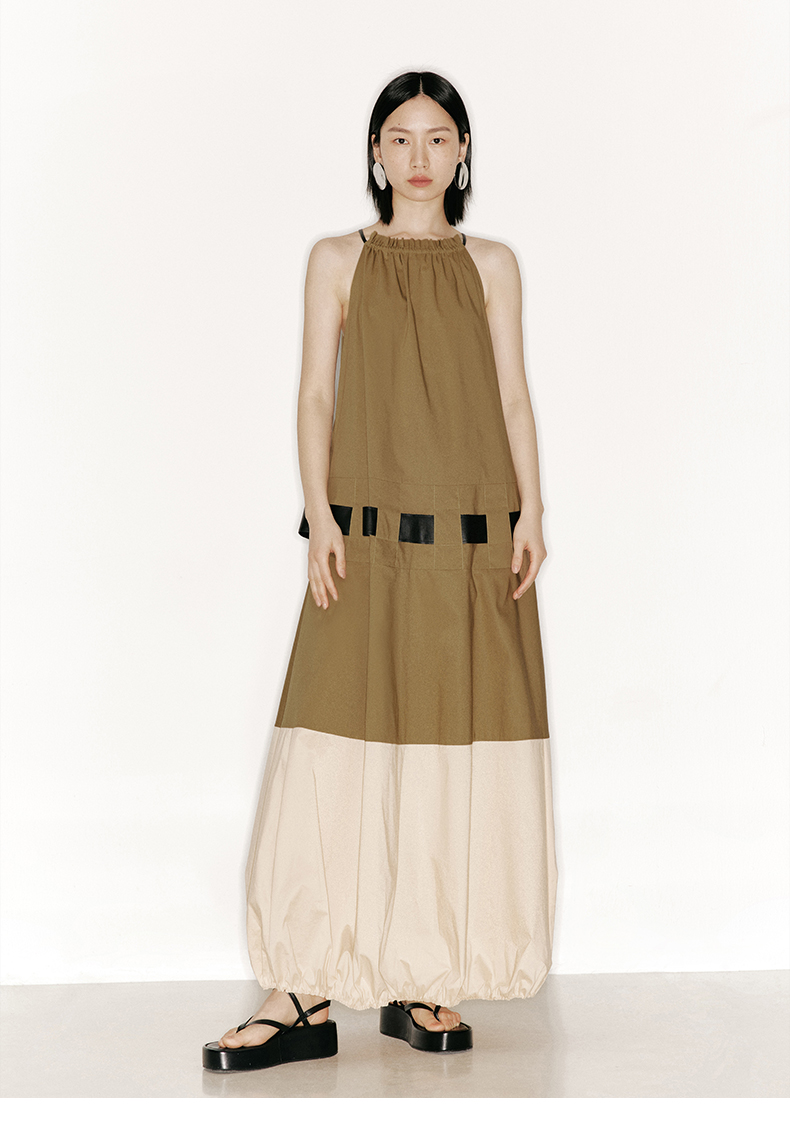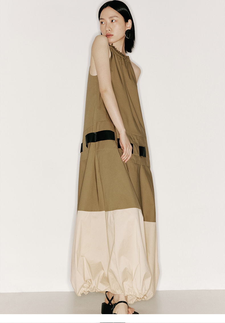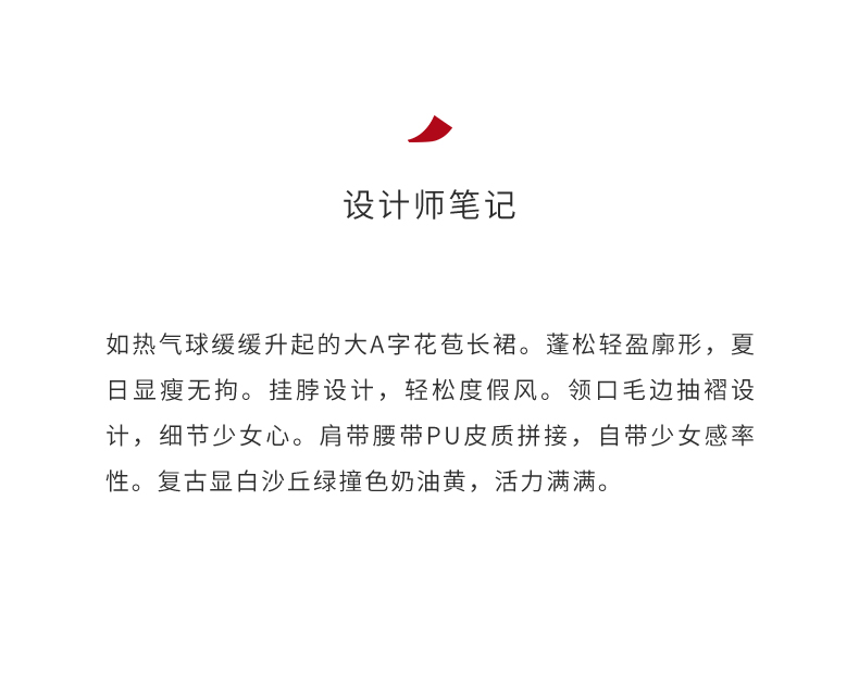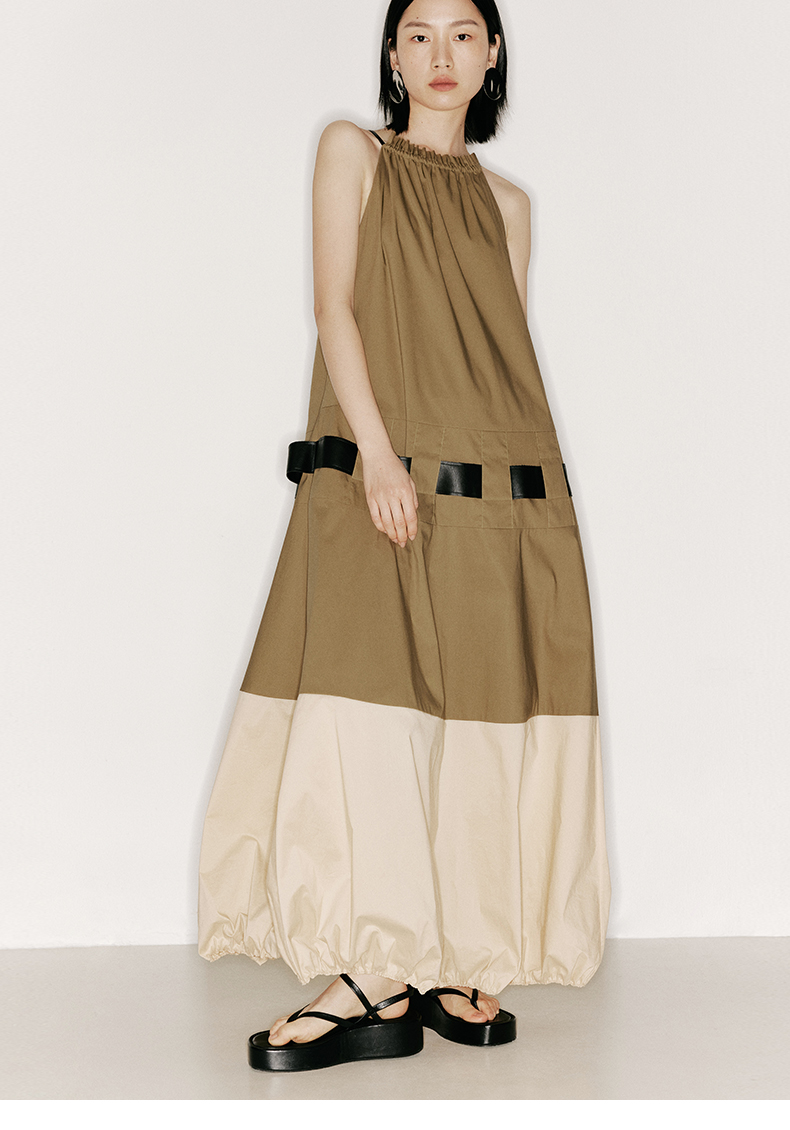 【热气球】领口毛边抽褶大A字下摆花苞拼接长裙/23000009