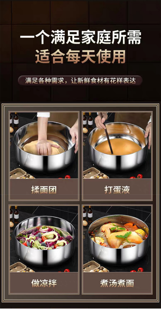 ✅食品级不锈钢,无毒无害耐摔耐磨 ✅容量超大,轻松应对面食制作需求 ✅一物多用,可以用来洗菜、拌凉菜等 ✅可当汤锅使用,随时加热美食