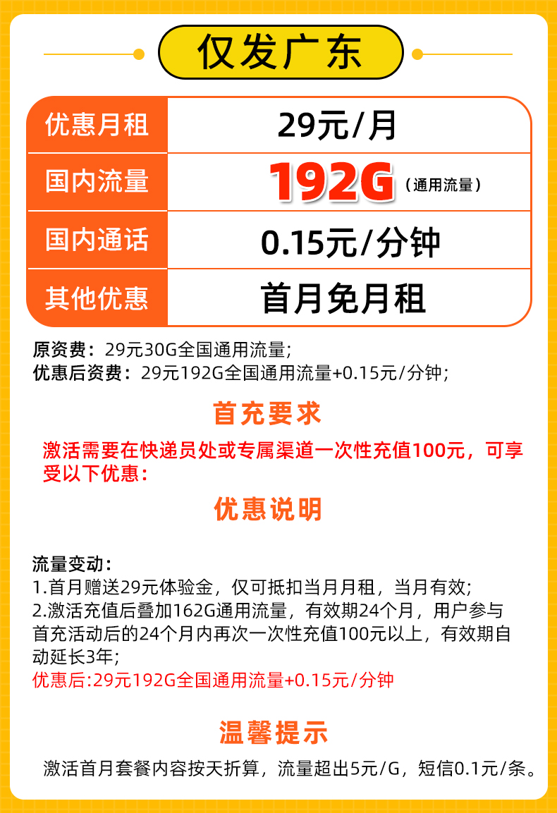 【仅发广东】电信29元205G全国流量100分钟 首月免月租