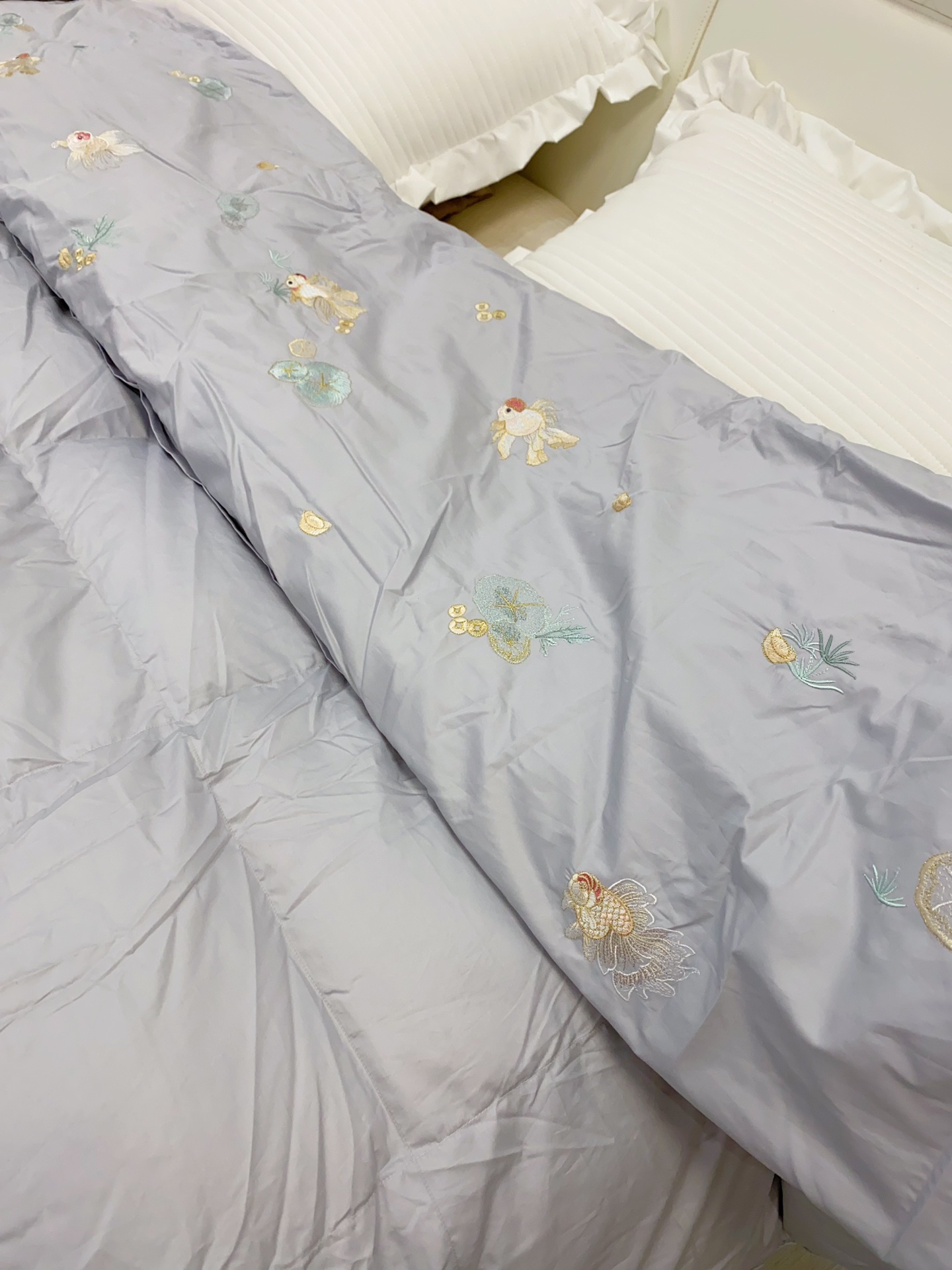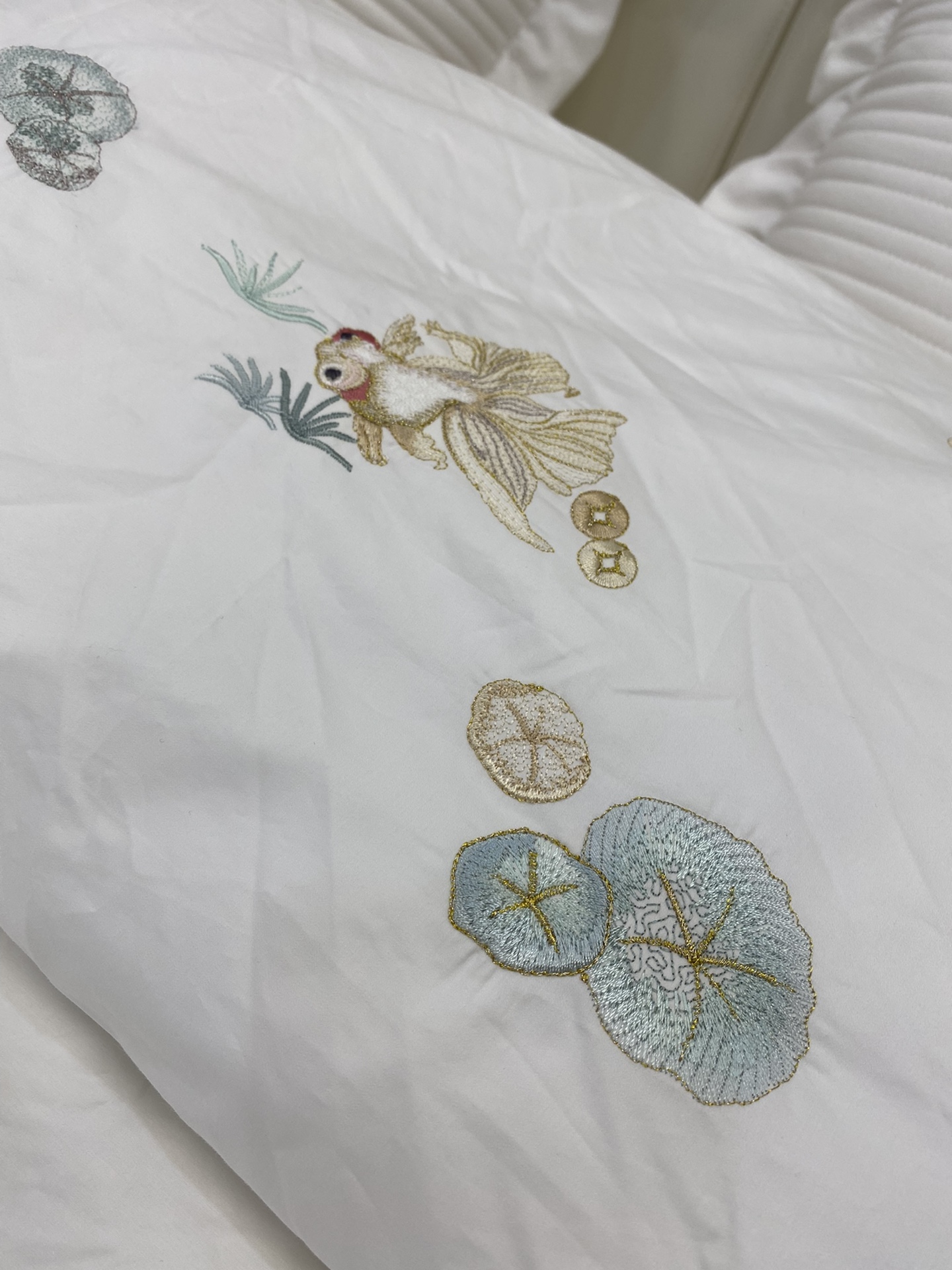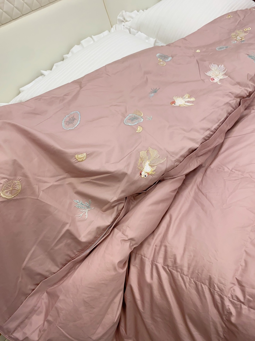 ▍东方绣艺 雅致映梦 柔粉缎面映衬灵动金鱼刺绣,莲叶与水草轻漾东方韵味, 让卧室悄然生辉,尽显轻奢雅致