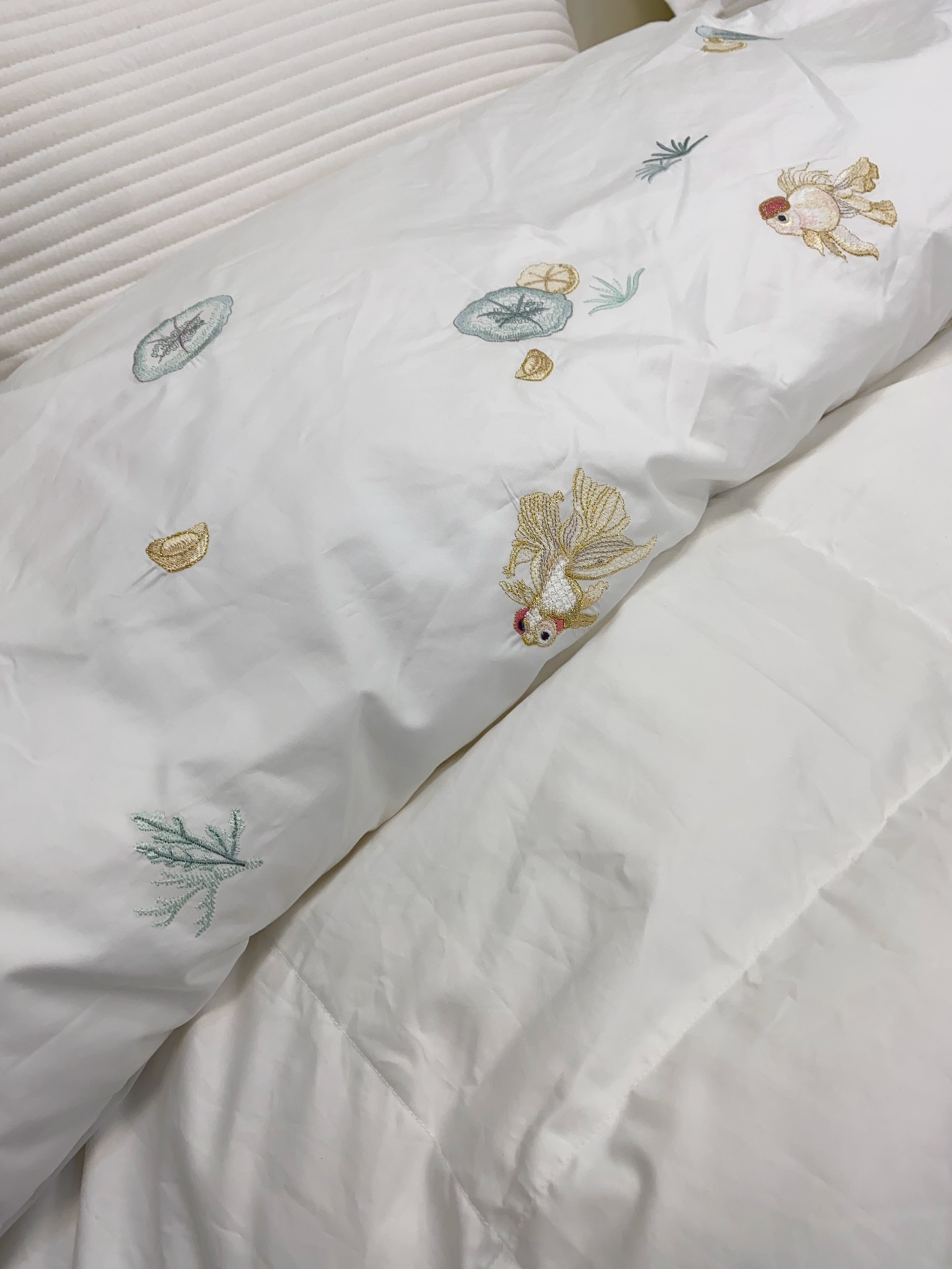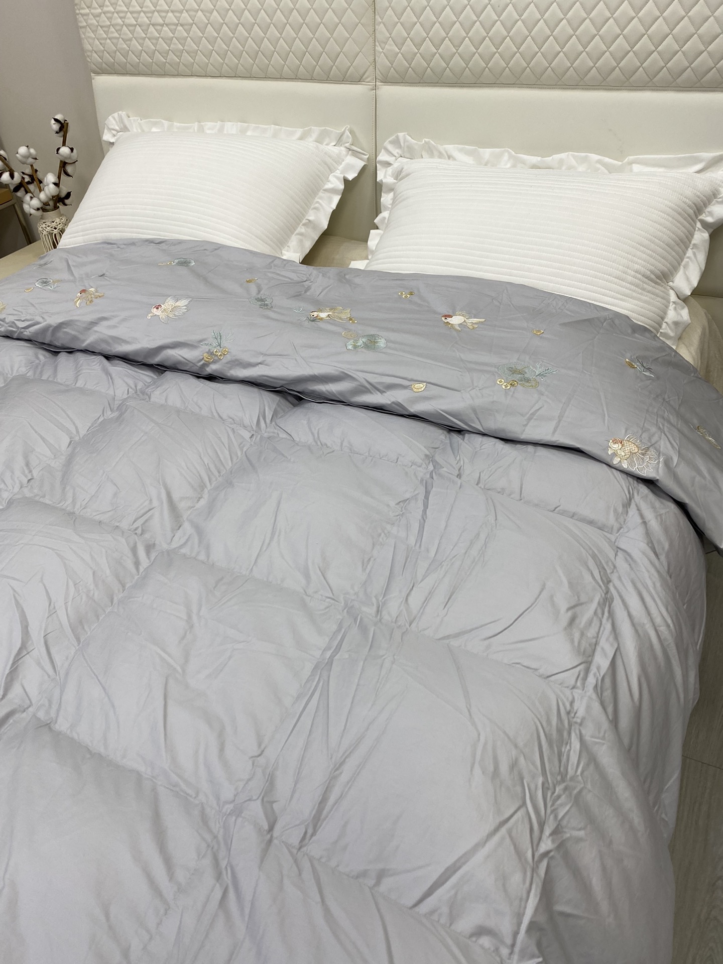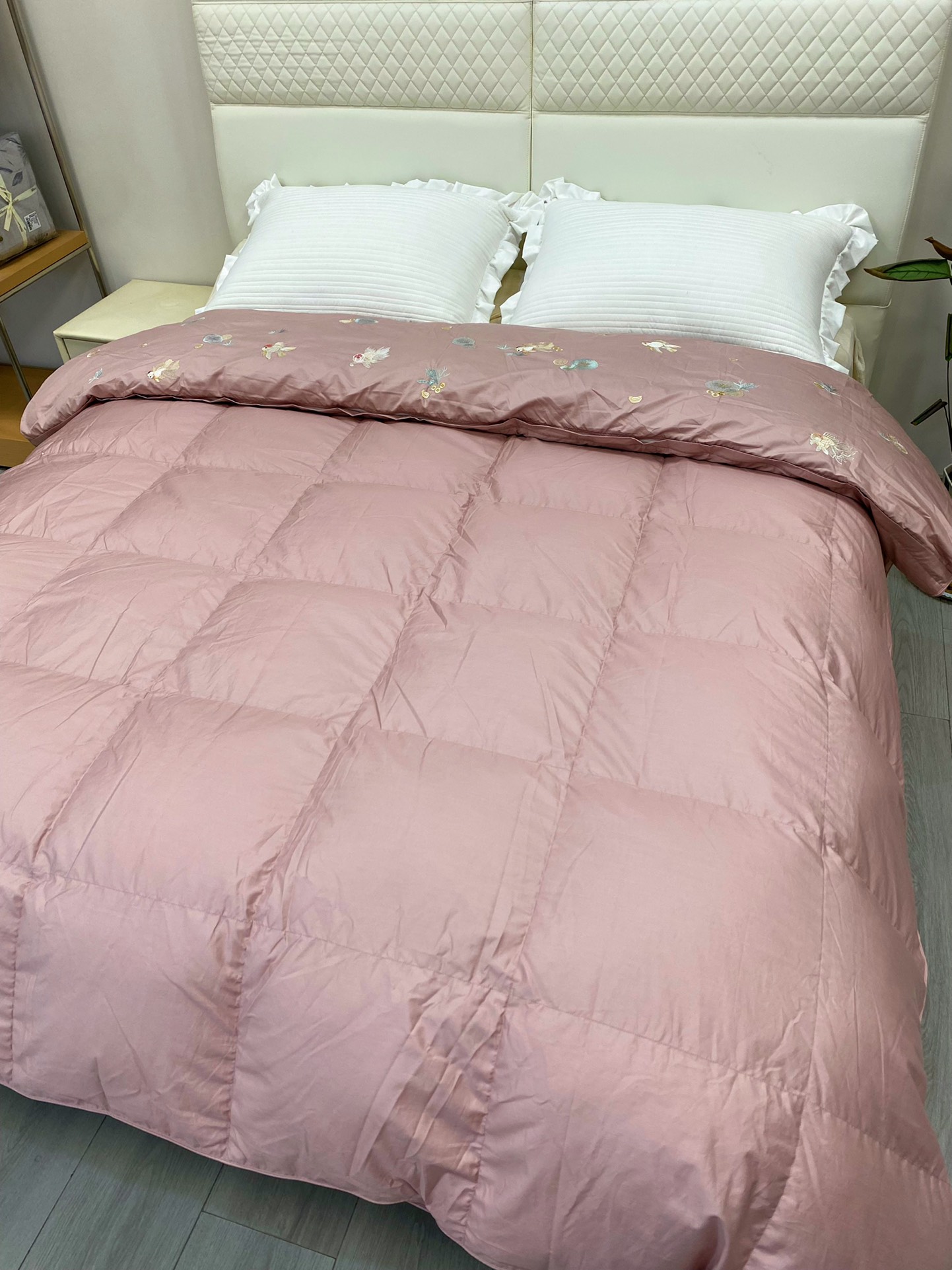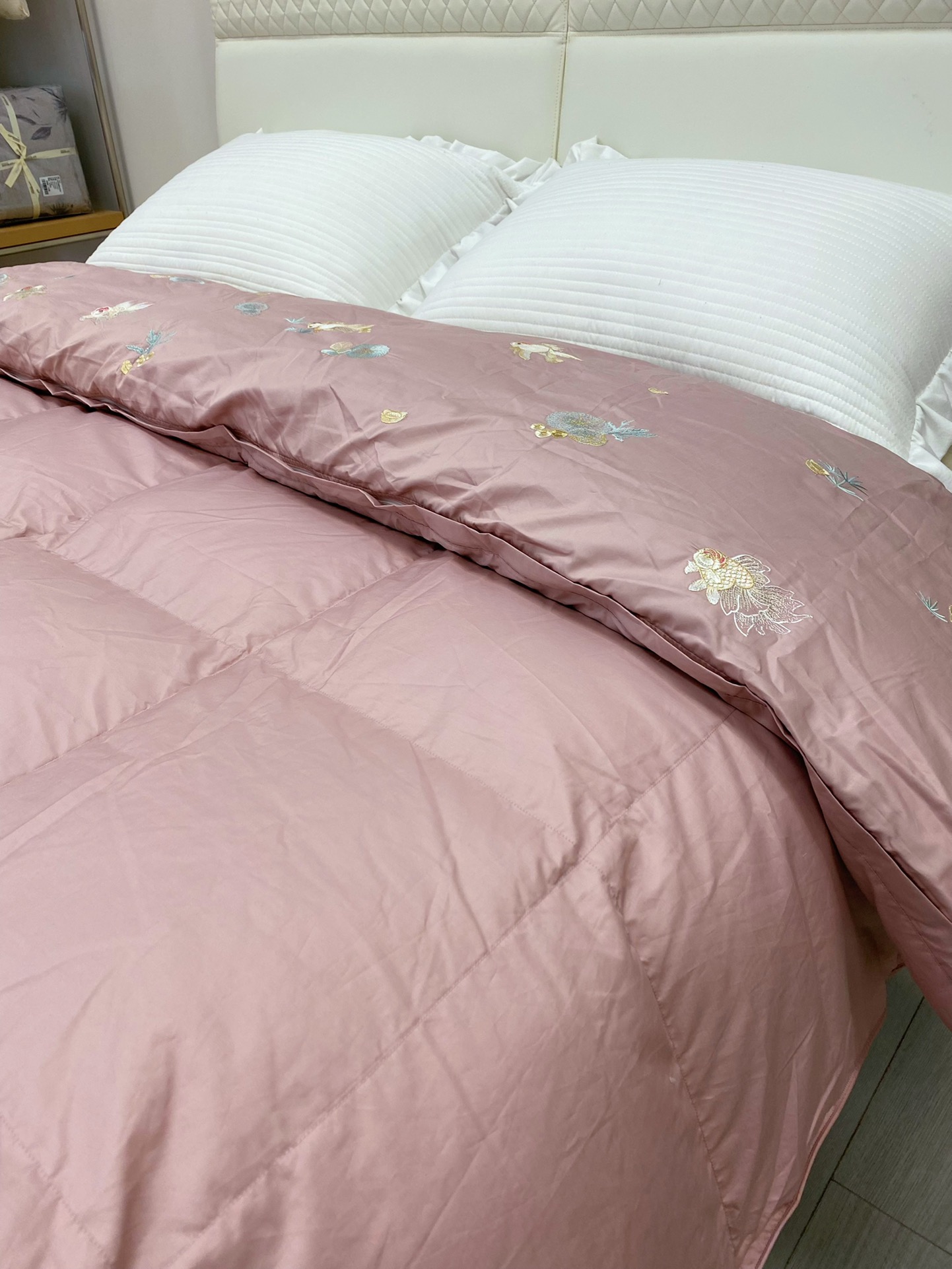 ▍东方绣艺 雅致映梦 柔粉缎面映衬灵动金鱼刺绣,莲叶与水草轻漾东方韵味, 让卧室悄然生辉,尽显轻奢雅致
