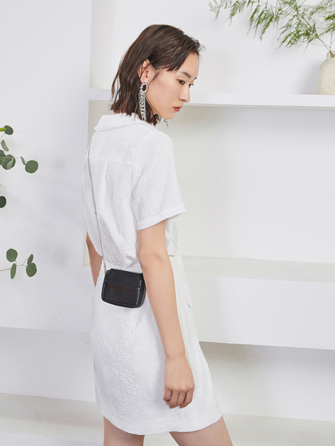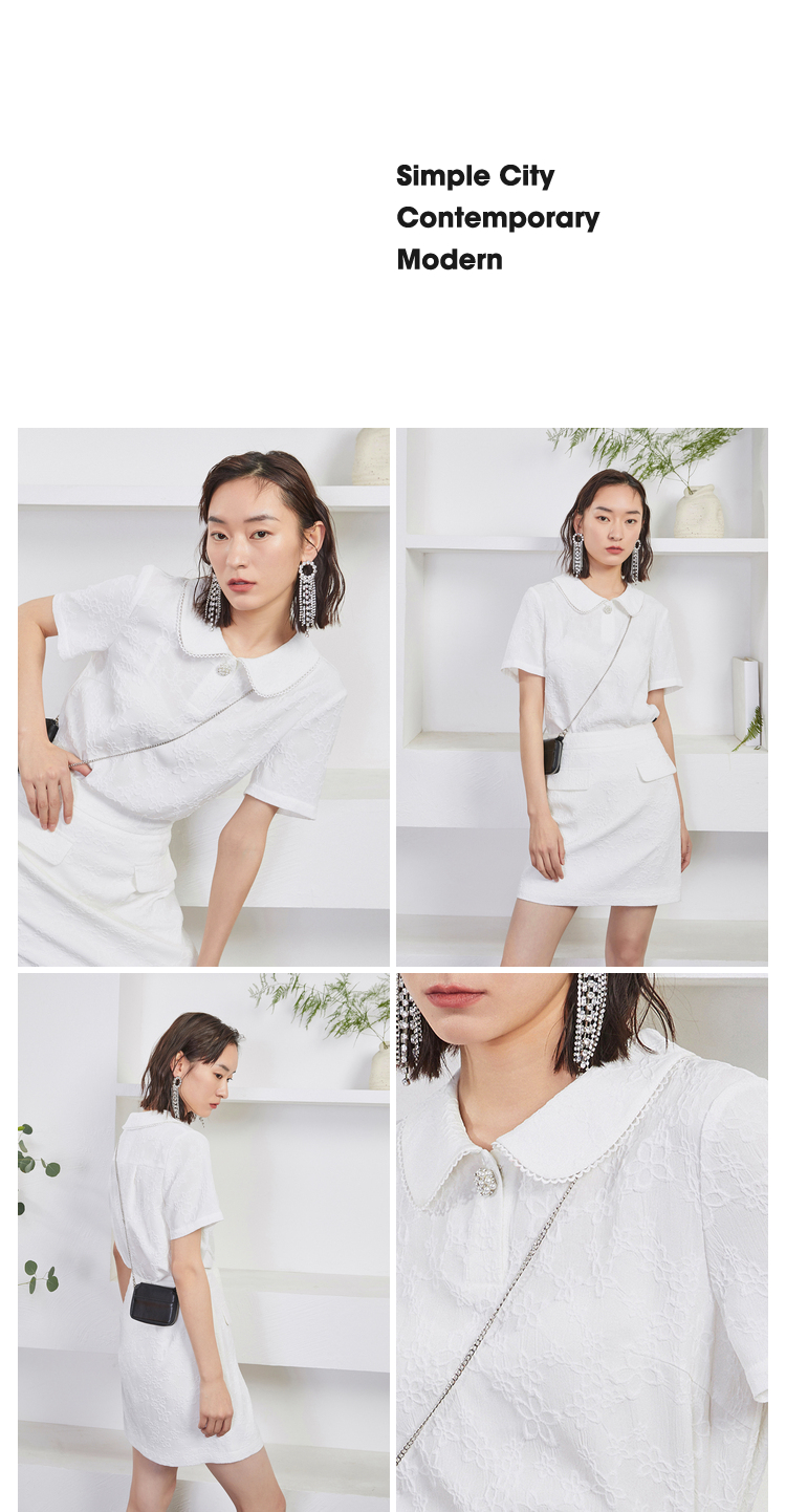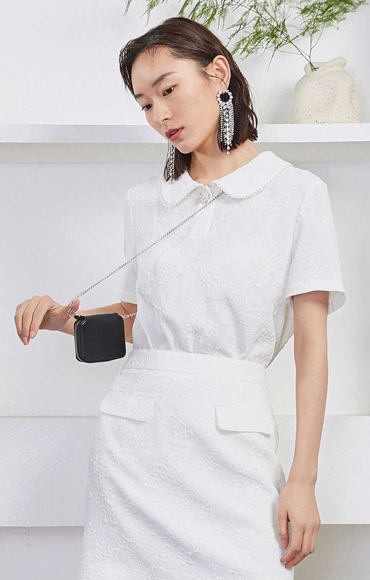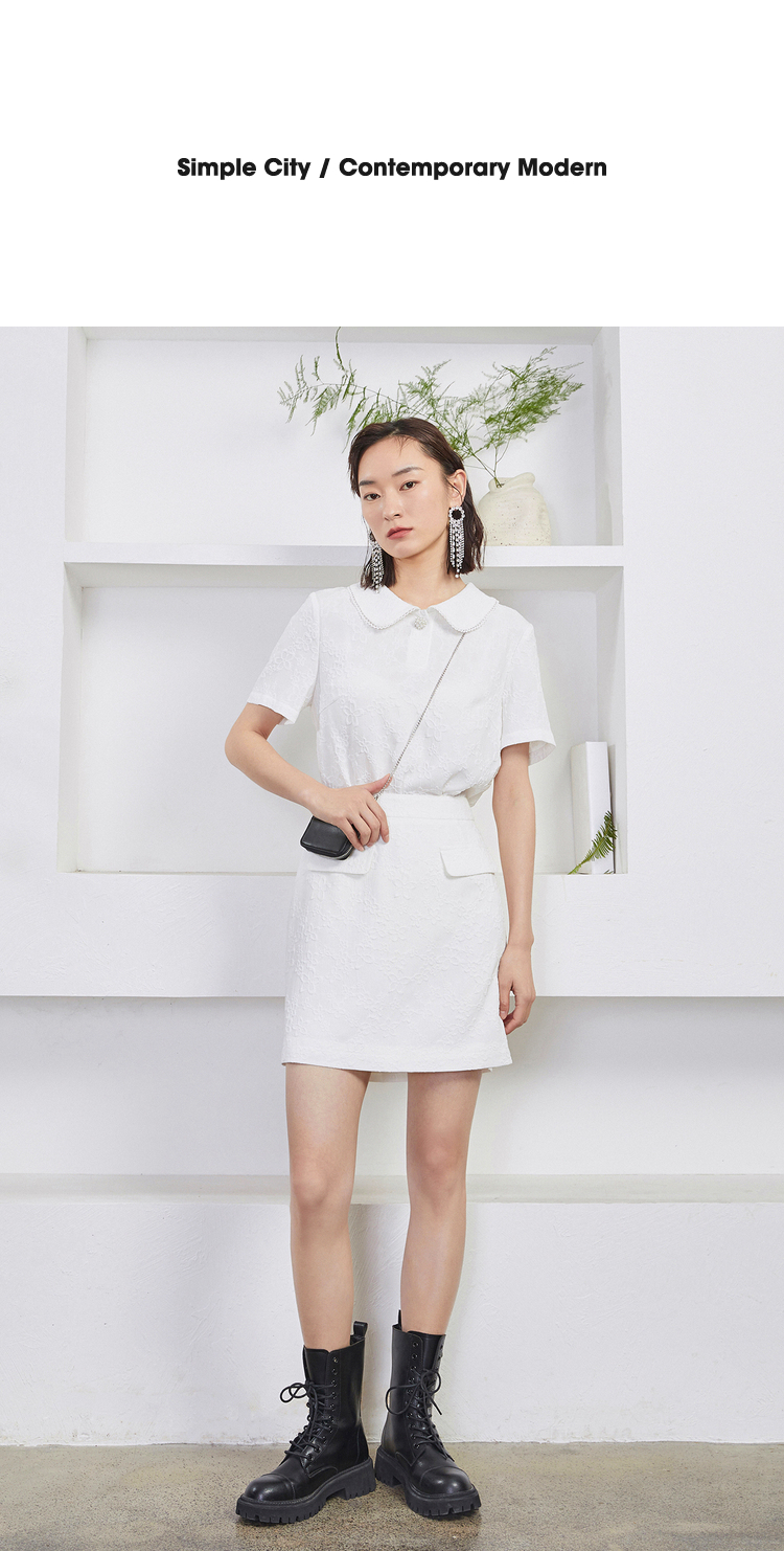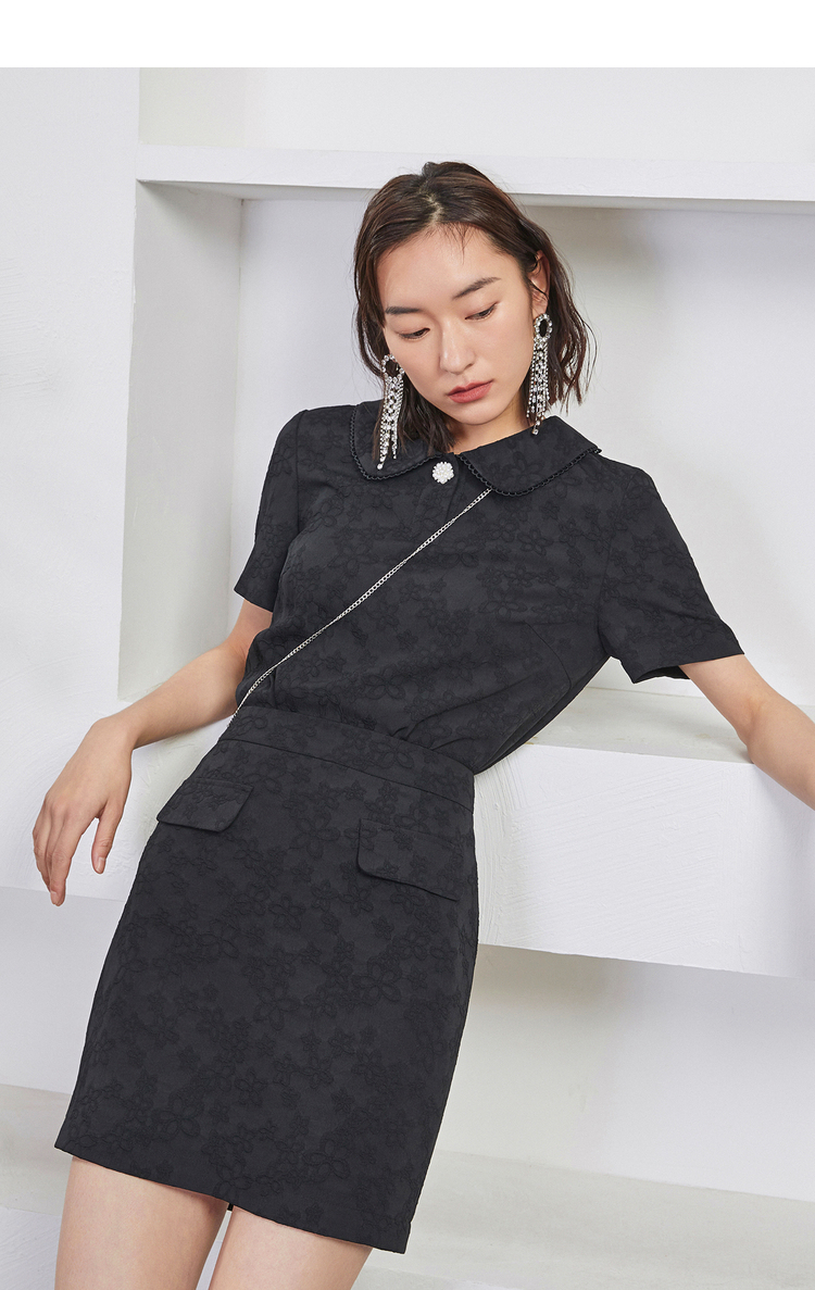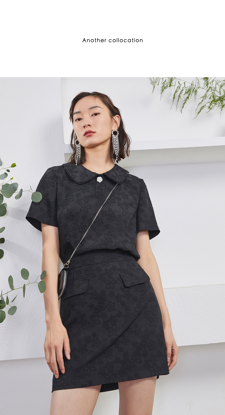 NEELLY纳俪商场同款娃娃领提花短袖上衣A字口袋半身裙时尚套装N22044Z04555