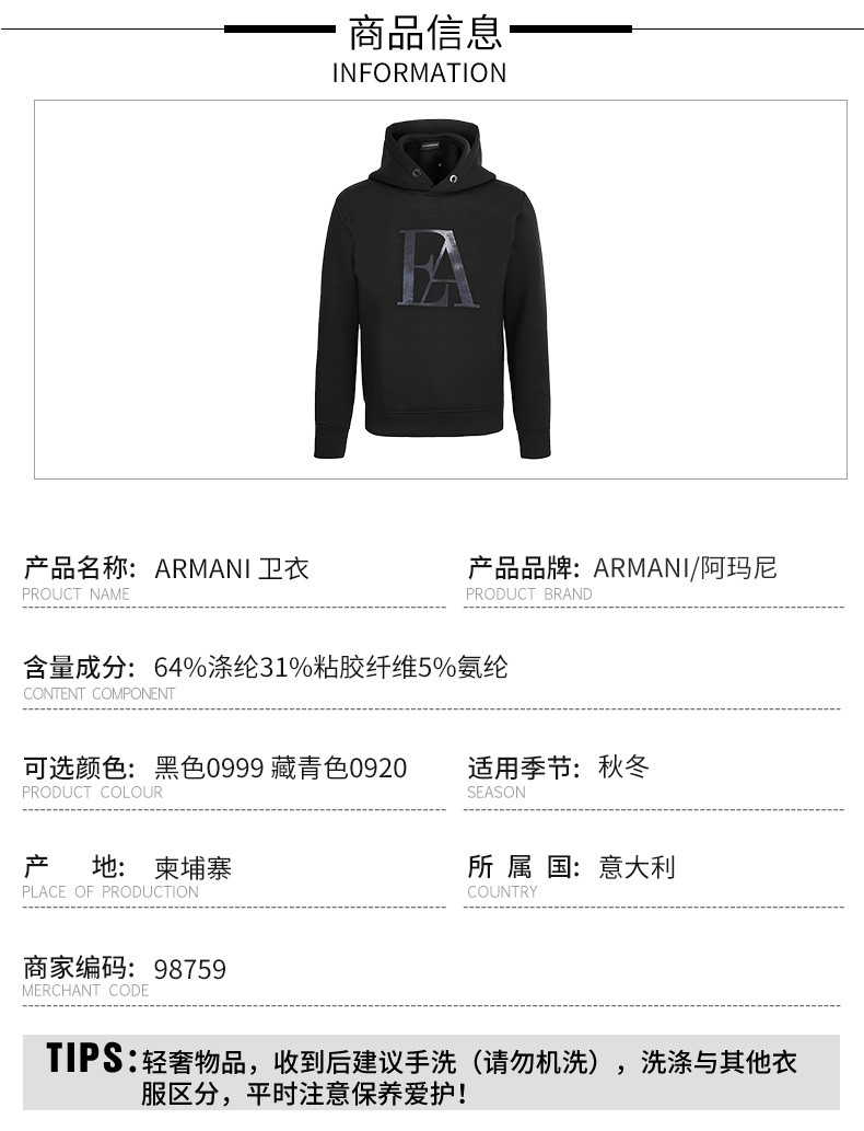 【超惠秒】Emporio Armani 阿玛尼 男士字母/飞鹰logo男士连帽长袖卫衣外套 98759