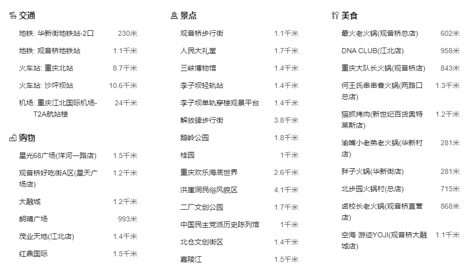 火车站:离菜园坝火车站2.7公里 离重庆火车北站(龙头寺火车站)7公里
