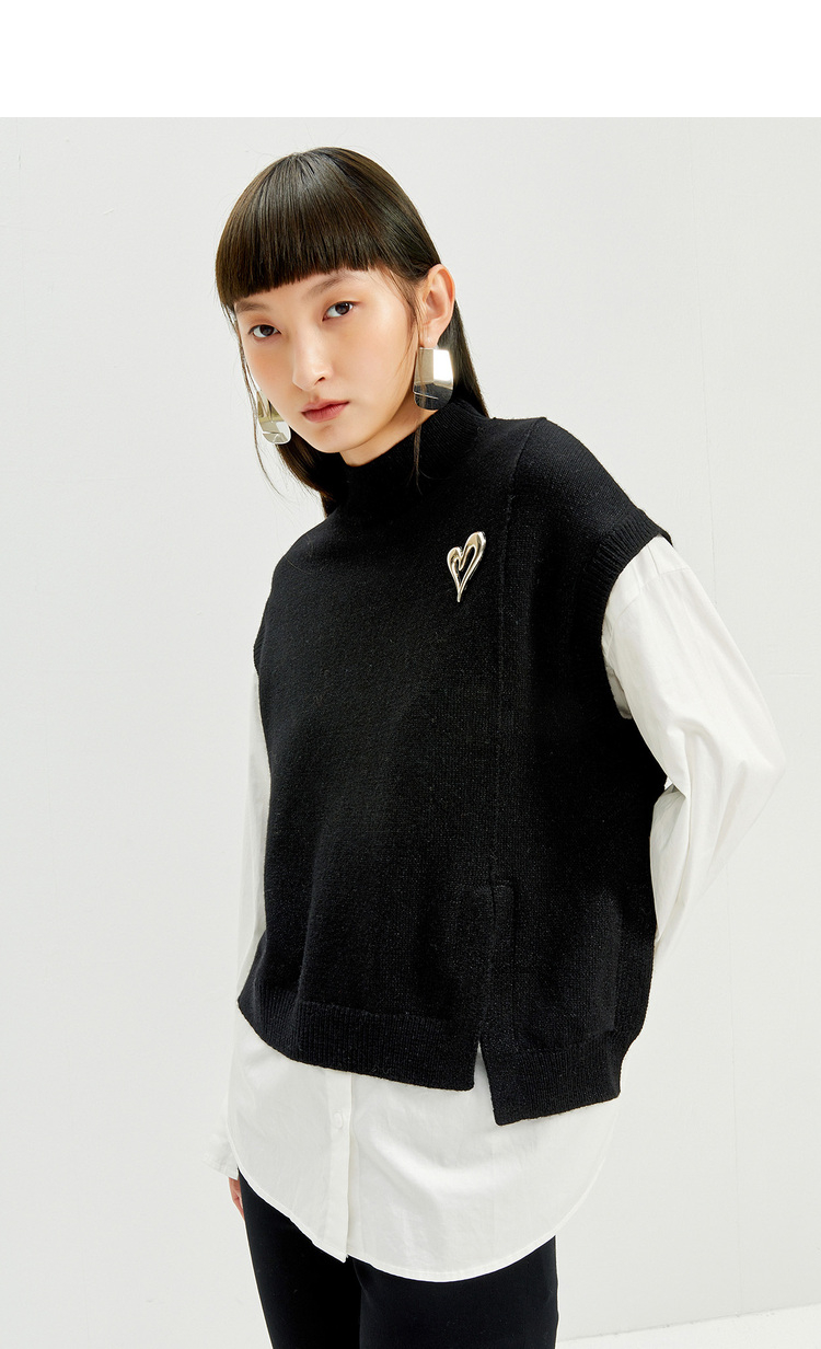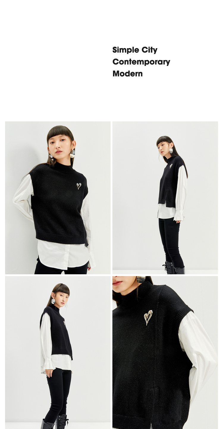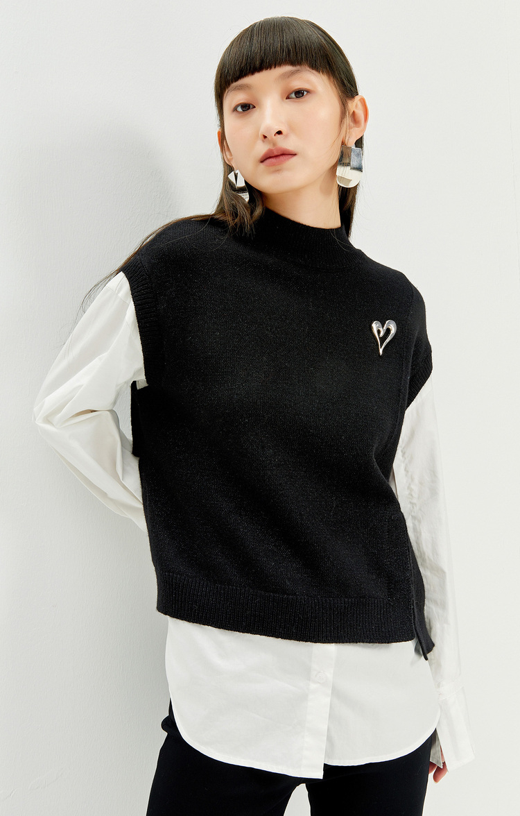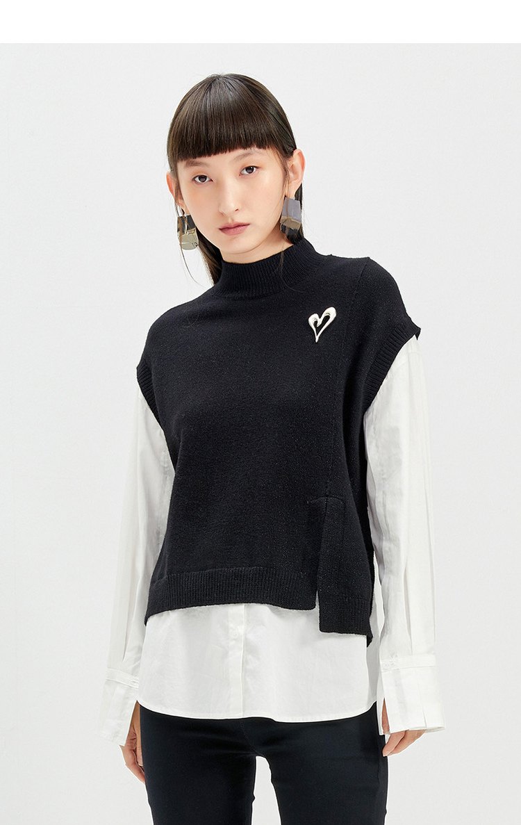 NEELLY纳俪半高领假两件拼接针织衫女冬季立体装饰爱心套头上衣N21101A01002