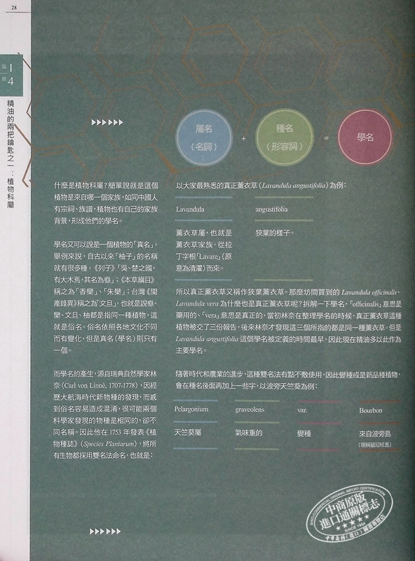 從芳療歷史、植物精油的成因、精油的萃取方法、精油在人體的作用方式,到精油的藥學屬性和安全性等,更有一般芳療書欠缺的完整植物科屬與化學分子解說。