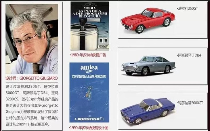 由设计过法拉利250GT,玛莎拉蒂5000GT、阿斯顿马丁DB4、布加迪等经典之作的大师Giorgetto Giugiaro操刀,为Lagostina拉歌蒂尼设计了快锅和压力排气系统。