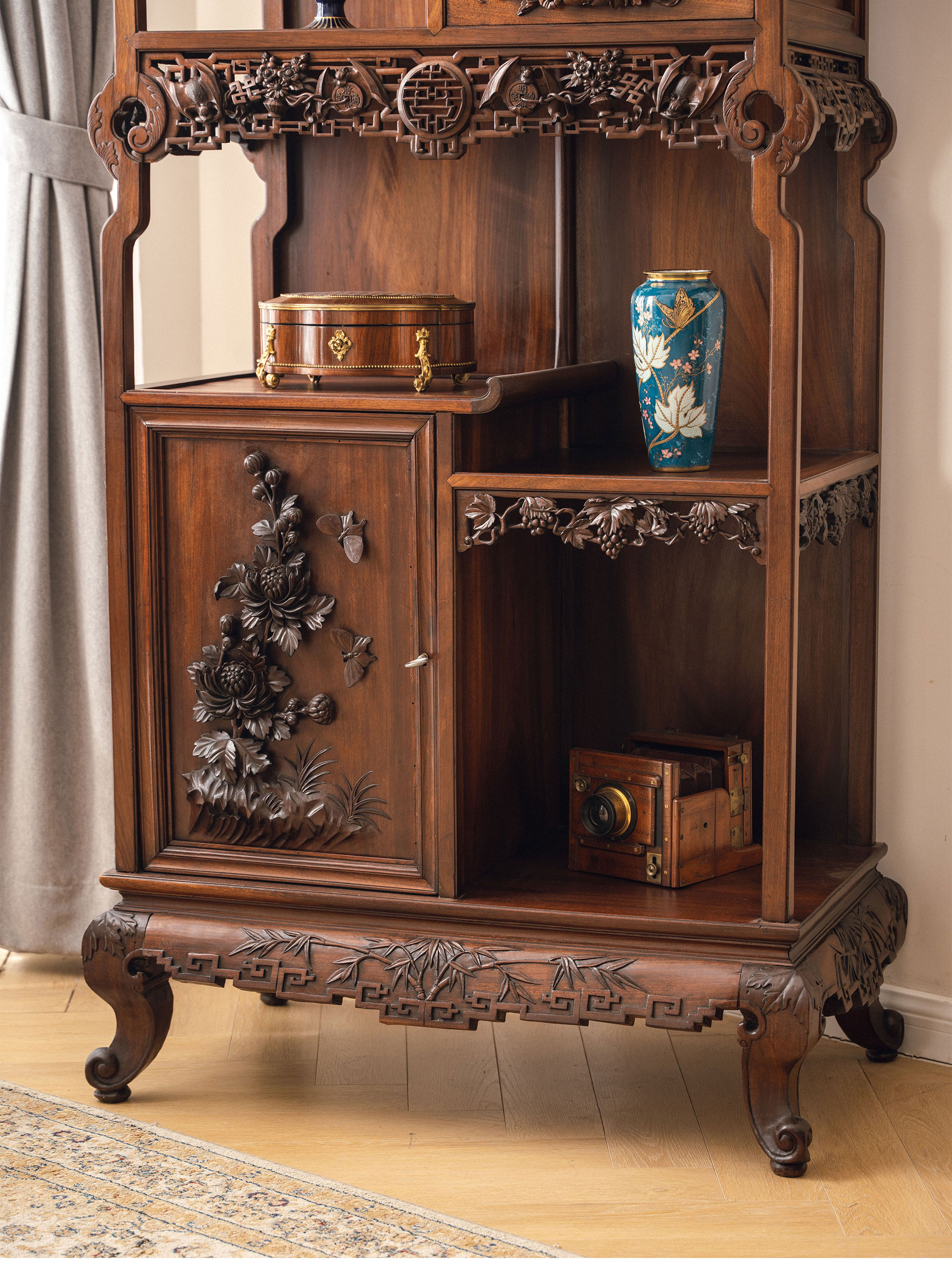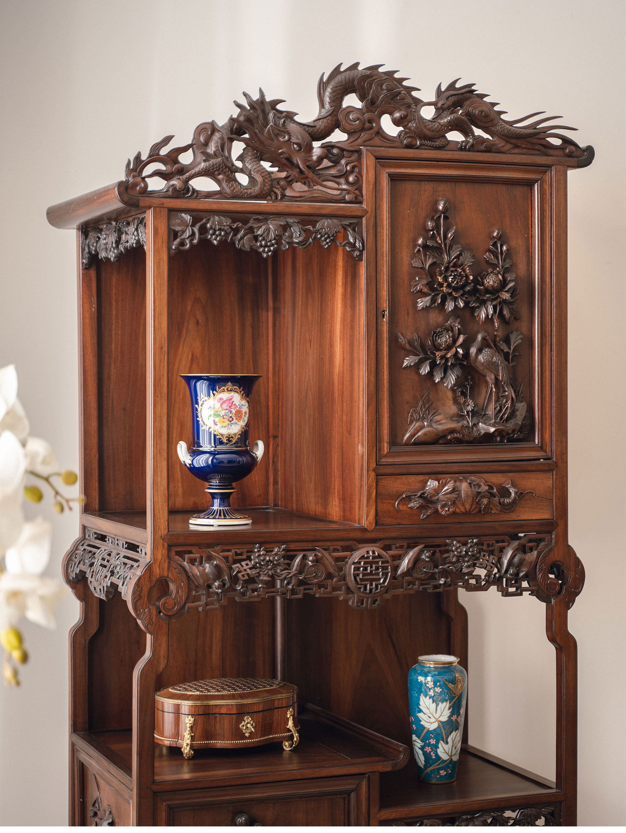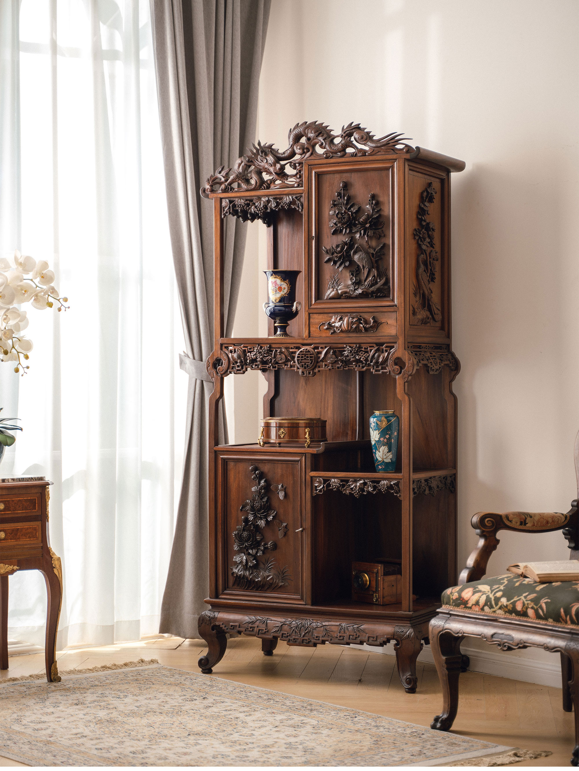 20世纪初法国出品维多东方风格高浮雕祥龙花纹装饰缅甸花梨木多宝阁