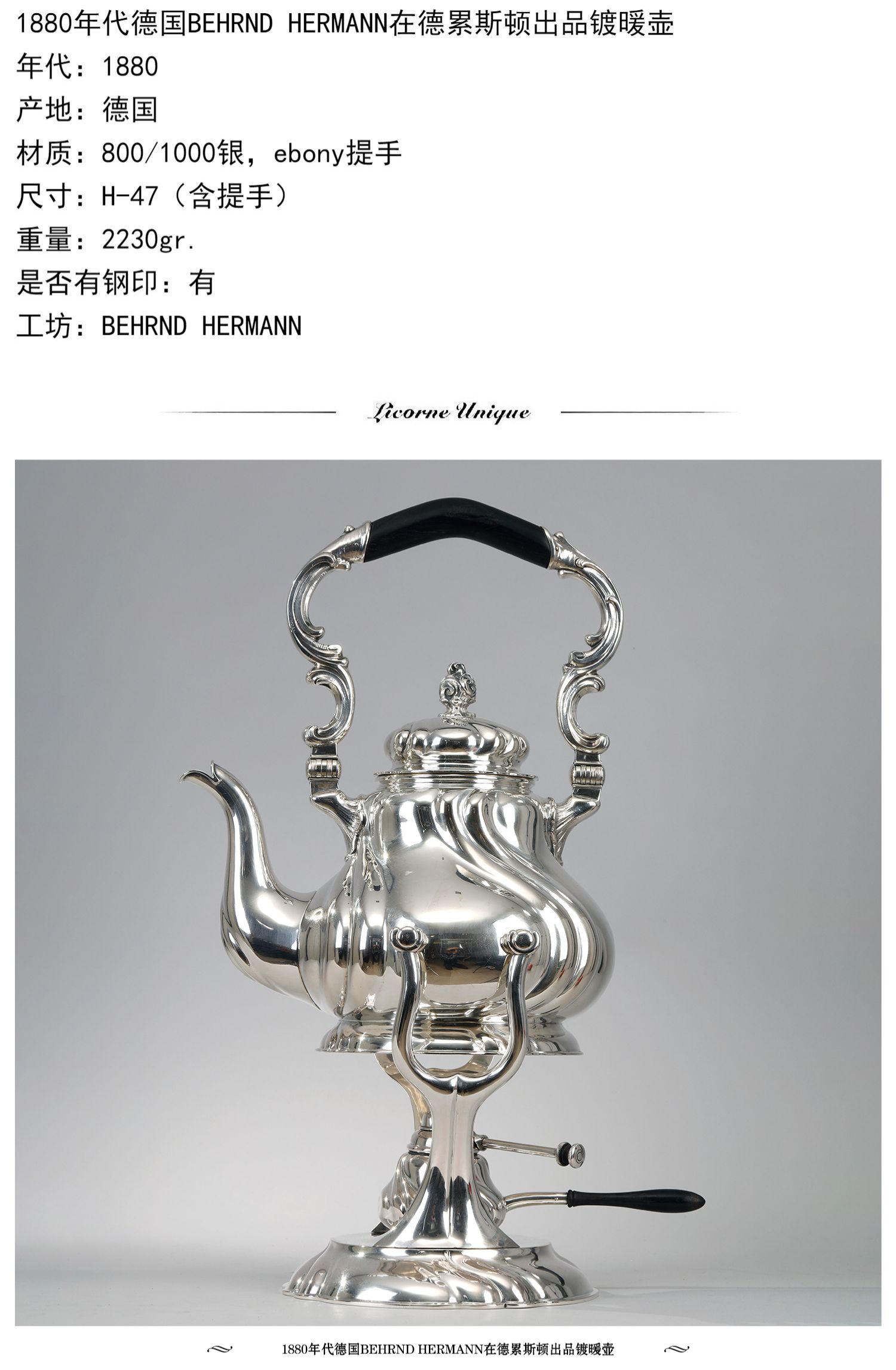 独角鹿西洋古董1880年代德国BEHRND HERMANN在德累斯顿出品镀暖壶