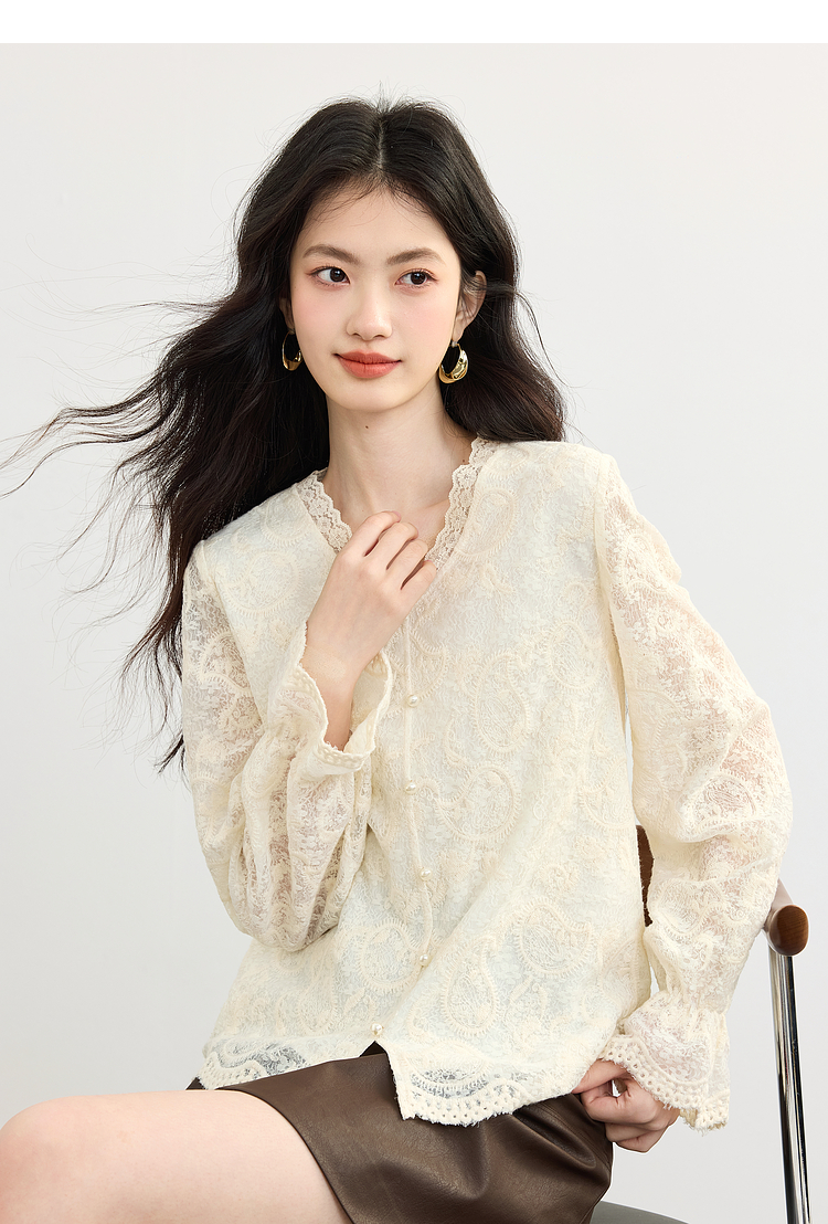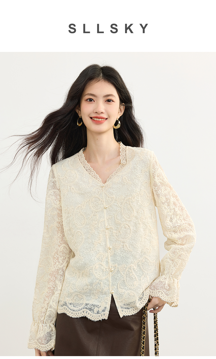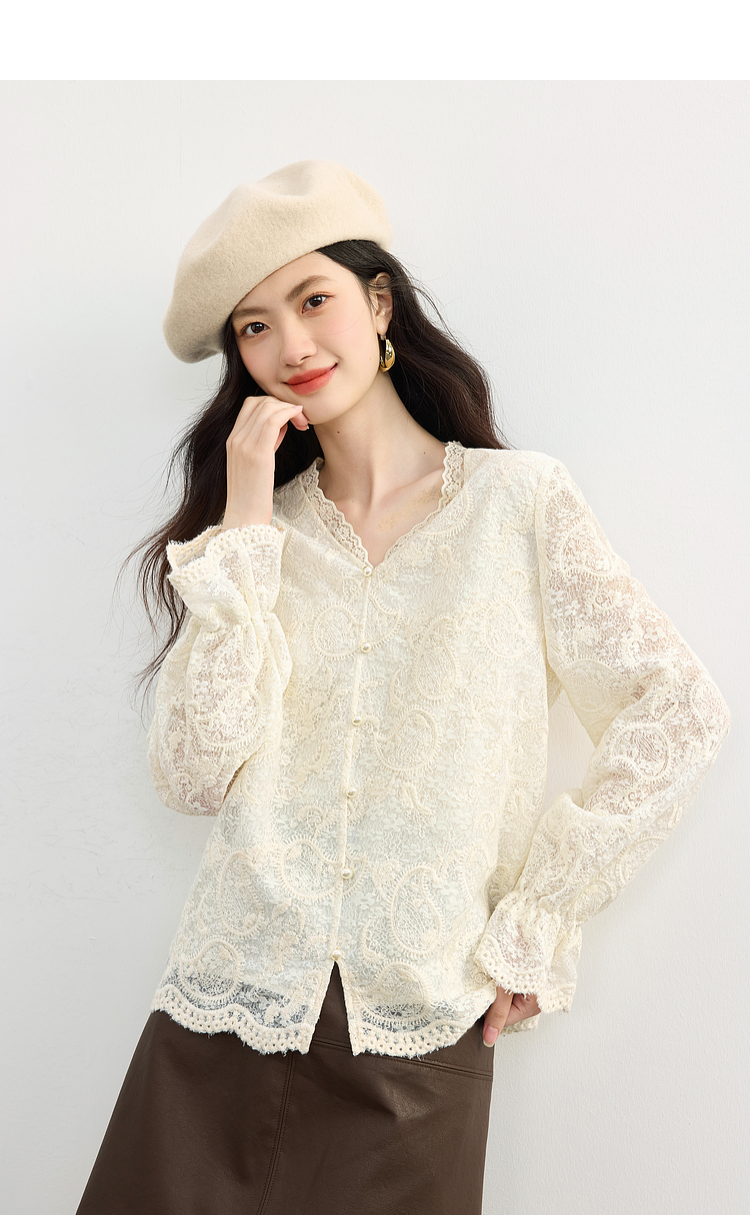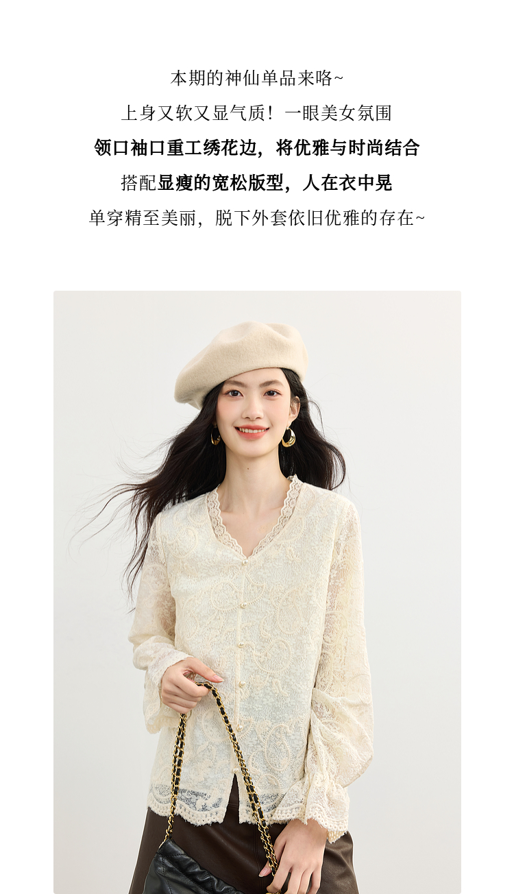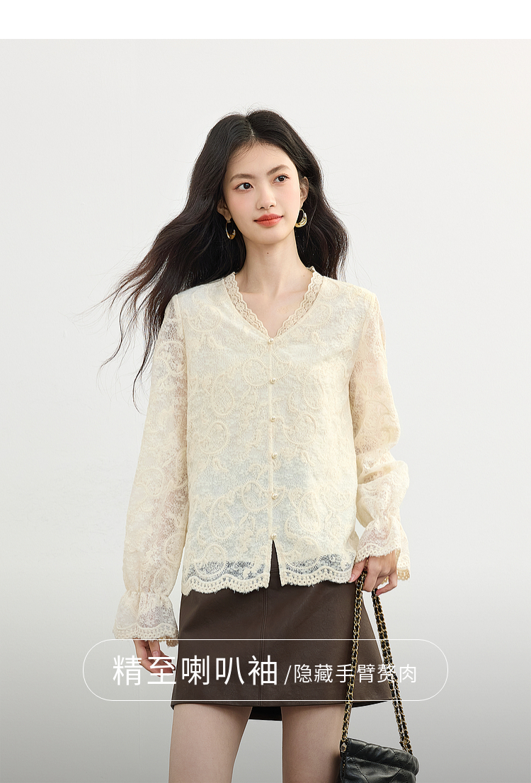 【09/03新品】熙世界法式花边V领蕾丝衫女2025秋季新款气质刺绣喇叭袖衬衫上衣
