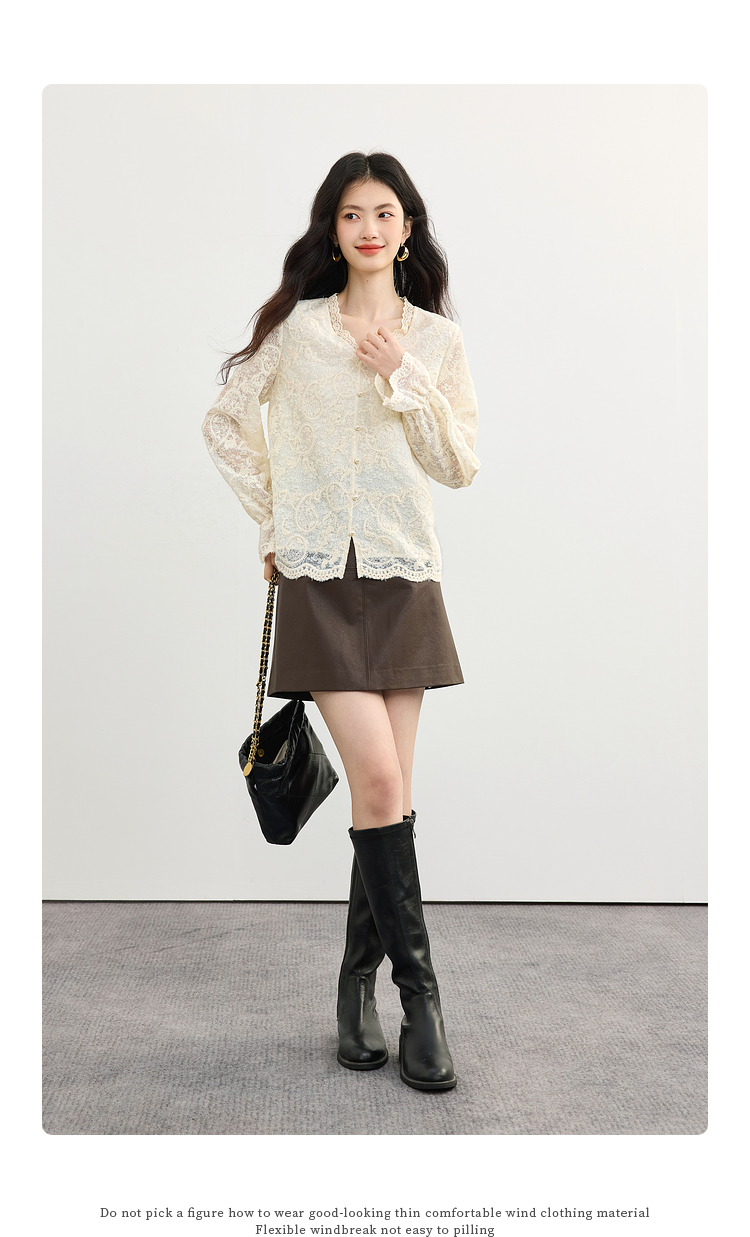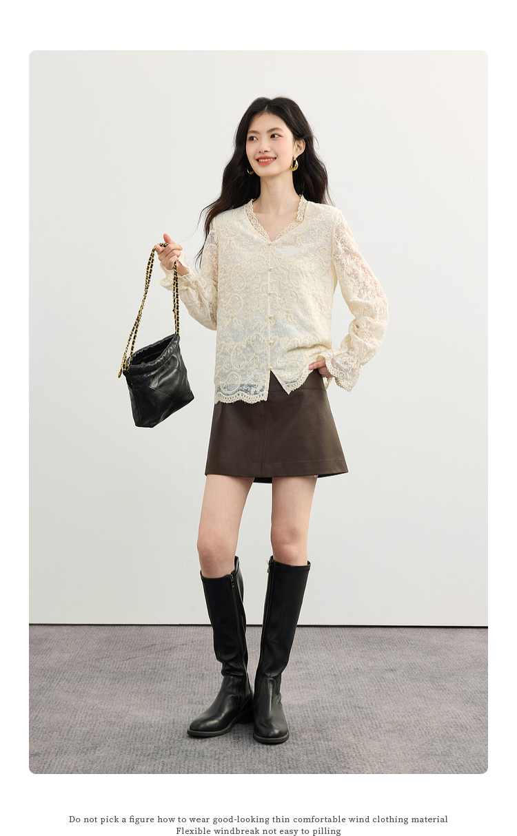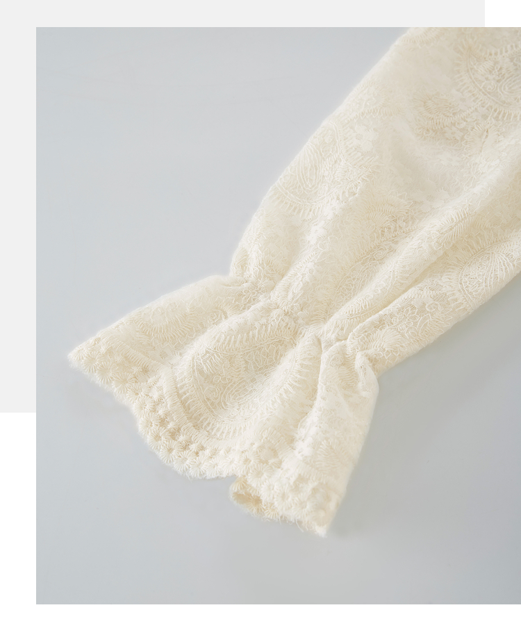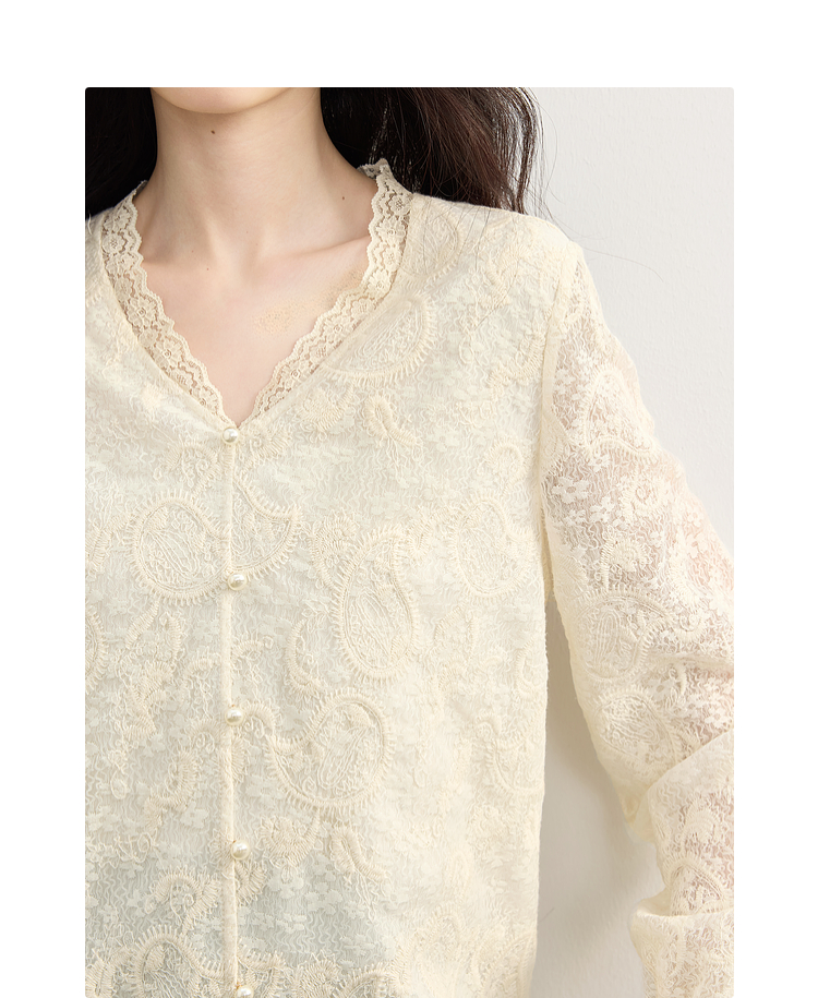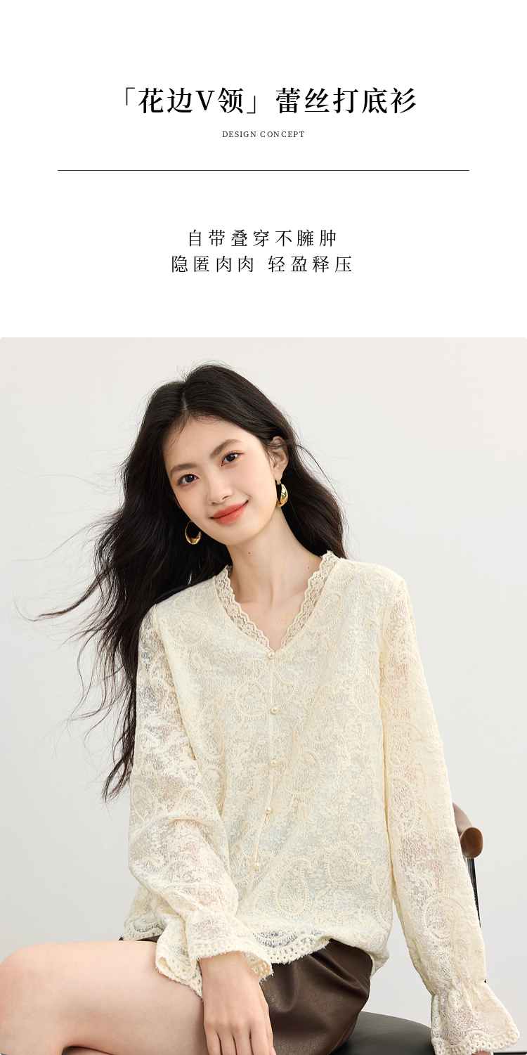 【09/03新品】熙世界法式花边V领蕾丝衫女2025秋季新款气质刺绣喇叭袖衬衫上衣