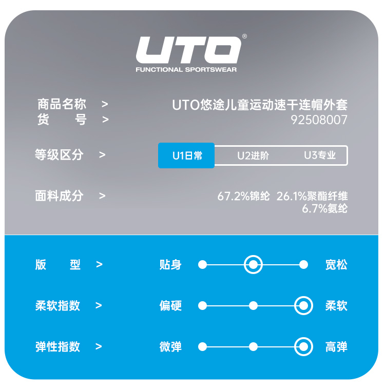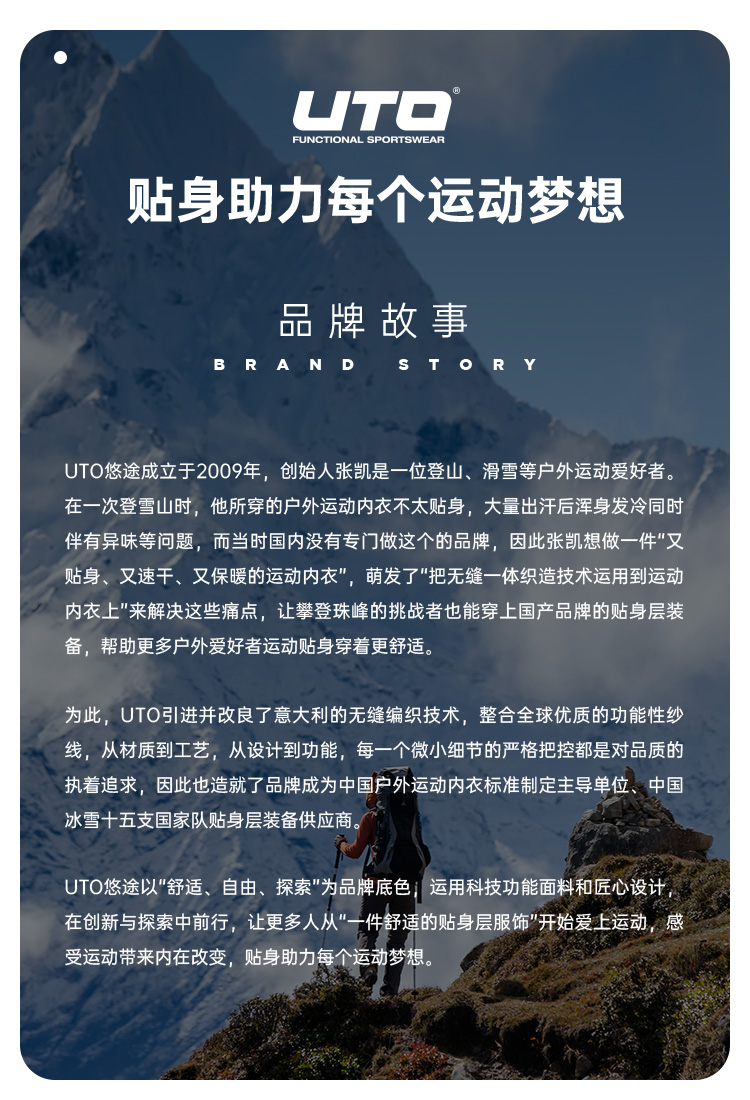 UTO悠途潜心于贴身运动装备的研发、设计和生产。从纤维到组织,从设计到工艺,在无缝贴身运动装备领域,树立国内标杆。 UTO着力于品牌互联网化,不断采集大量运动数据,为跑步、健身、滑雪等不同类型的运动爱