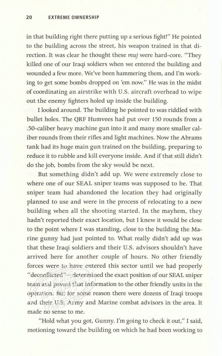 Combat, the most intense and dynamic environment imaginable, teaches the toughest leadership lessons, with absolutely everything at stake. Jocko Willink and Leif Babin learned this reality first-hand on the most violent and dangerous battlefield in Iraq. As leaders of SEAL Team Three’s Task Unit Bruiser, their mission was one many thought impossible: help U.S. forces secure Ramadi, a violent, insurgent-held city deemed “all but lost.” In gripping, firsthand accounts of heroism, tragic loss, and hard-won victories, they learned that leadership―at every level―is the most important factor in whether a team succeeds or fails.
