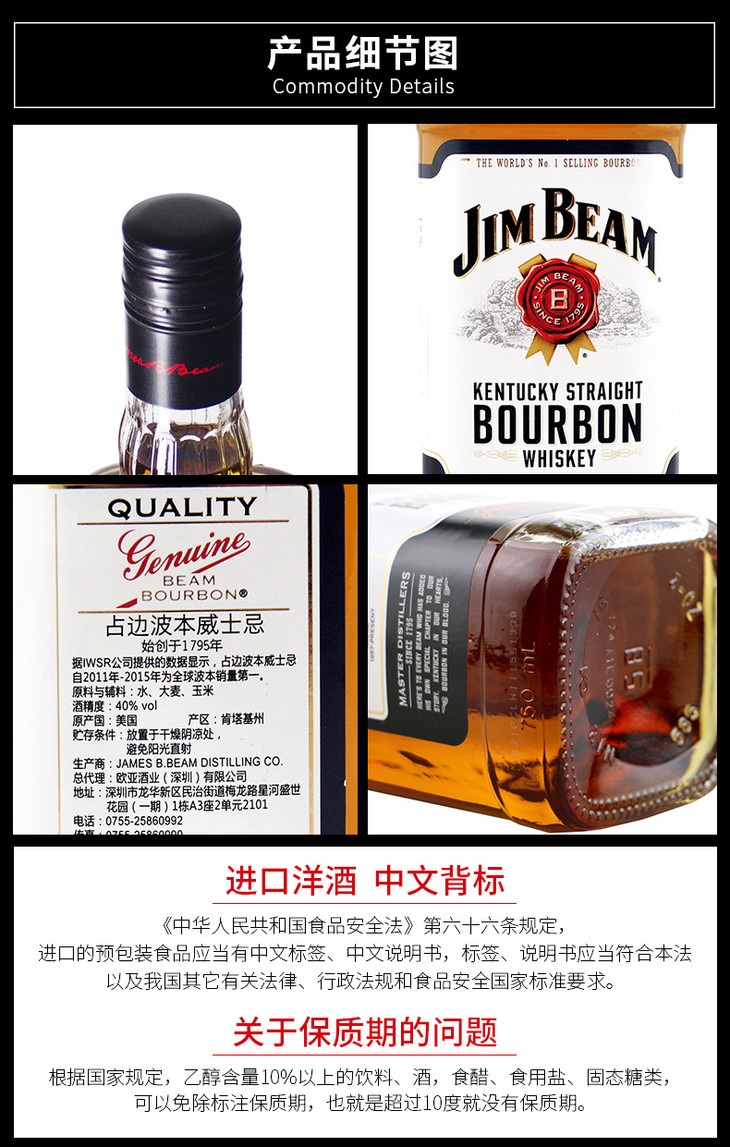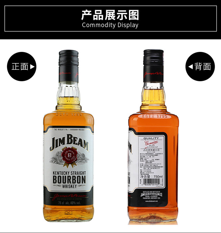 【单瓶】金宾波本威士忌(白占边) 750ml 40%vol 正品行货