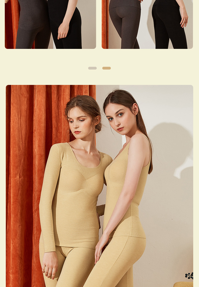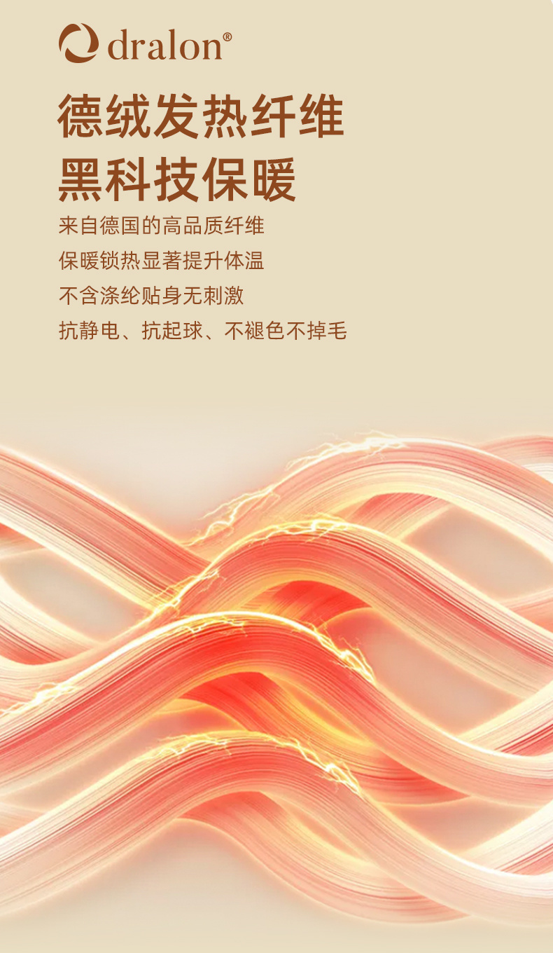 这款内衣采用德绒(德国拜耳公司的腈纶)面料,保暖性好的同时又很透气不会觉得闷。