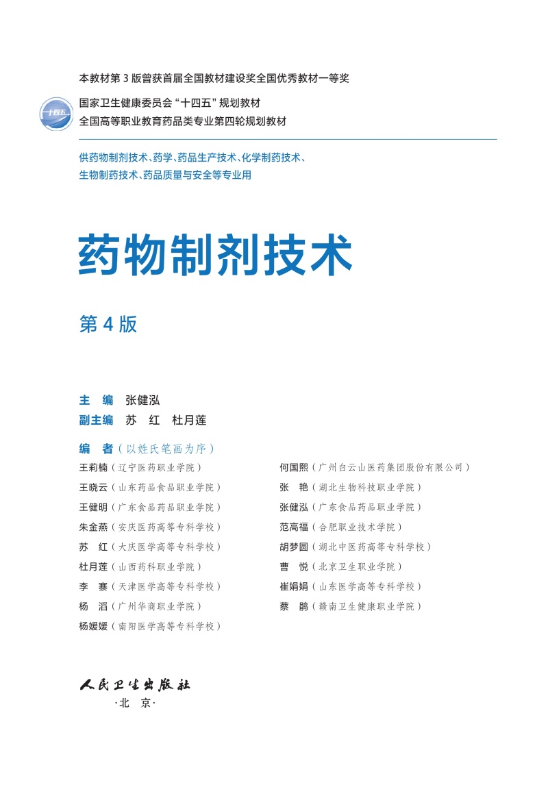 药物制剂技术 第4四版 十四五规划教材 全国高等职业教育药品类专业第四轮规划教材 张健泓 供药物制剂技术等专业用人民卫生出版社