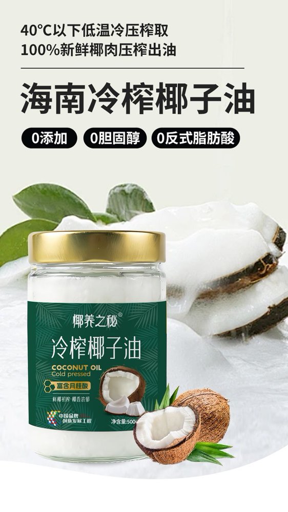 天然初榨冷压榨椰子油清香型 500ml/瓶 椰子油放三年都雪白清透