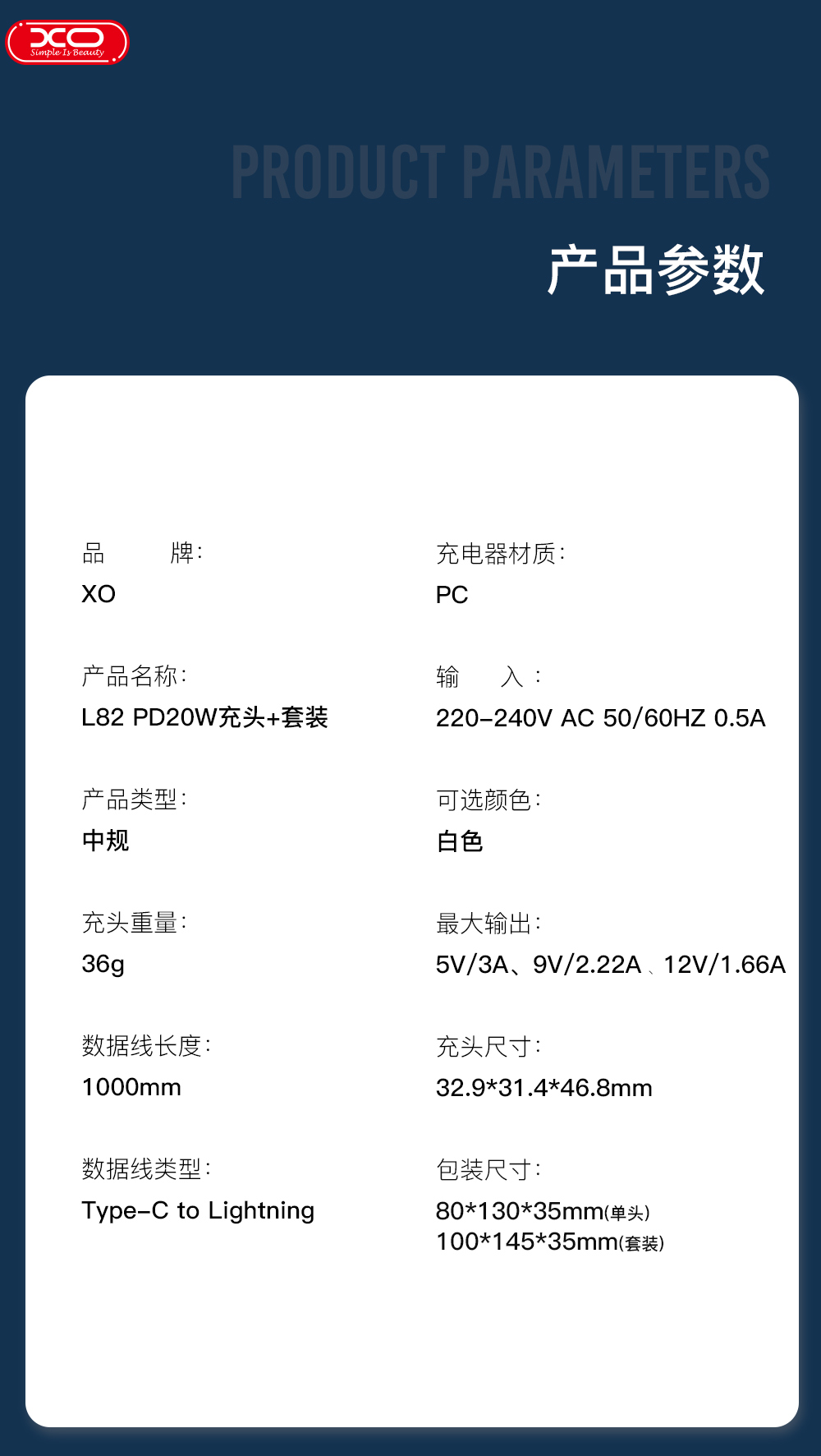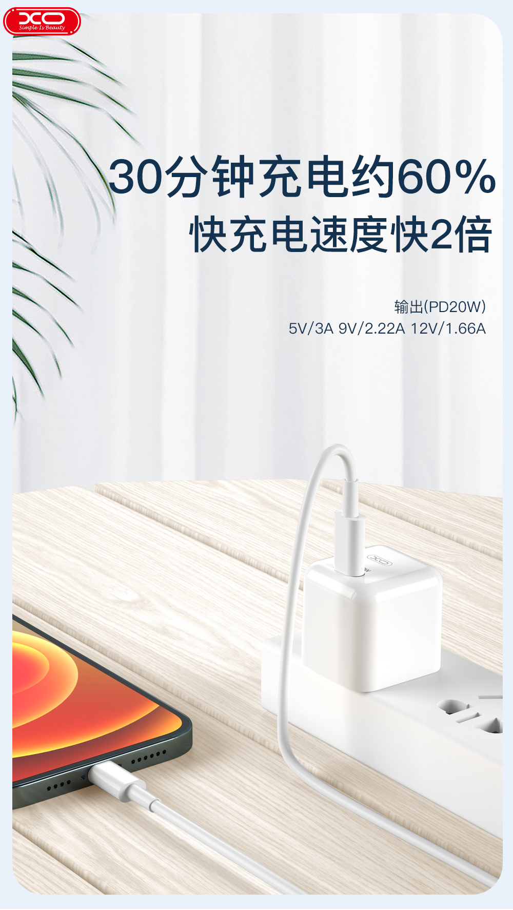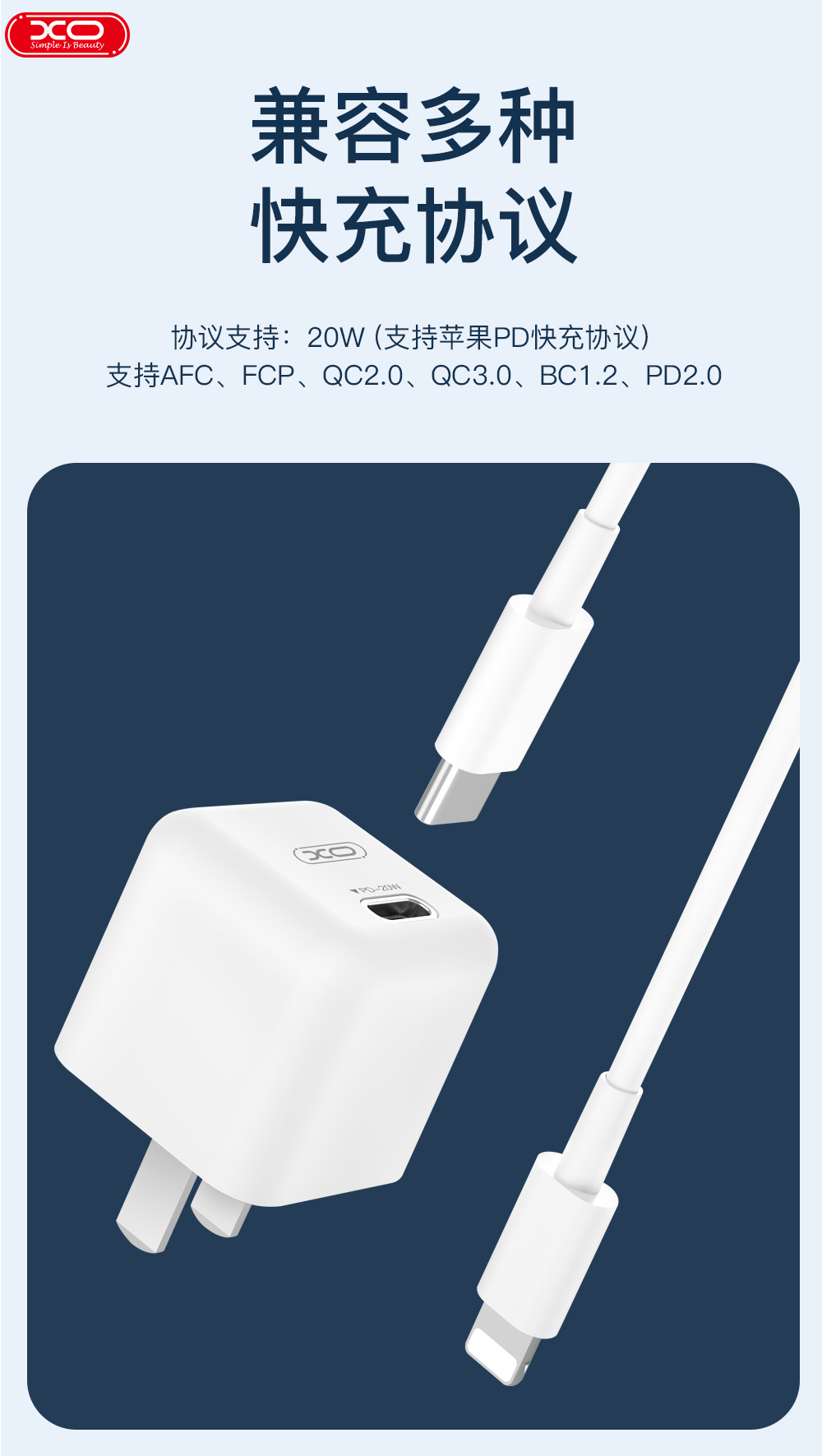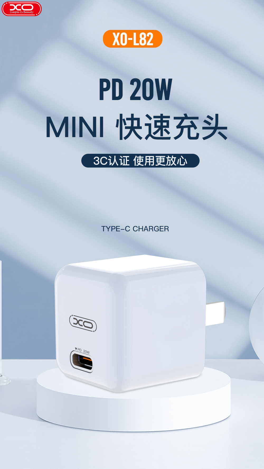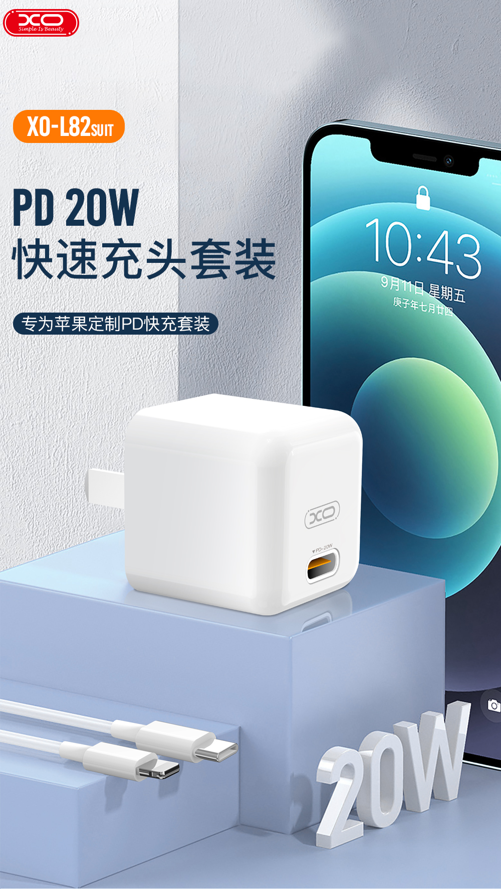 XO 中规单口Mini PD20W 苹果快充头(3C认证)XO-L82白色