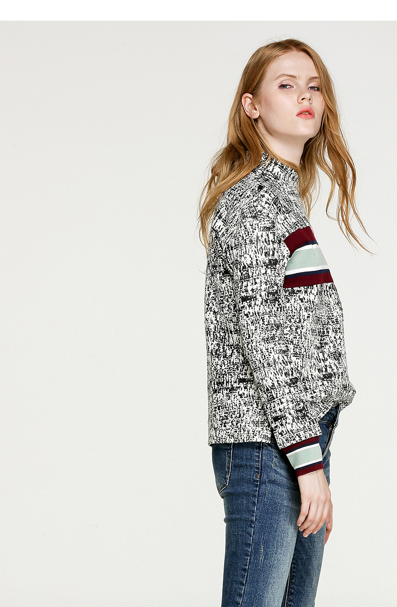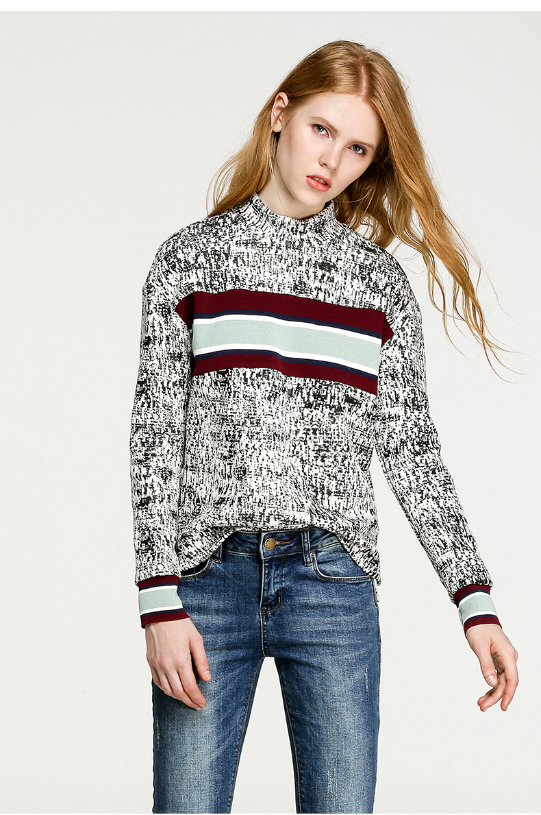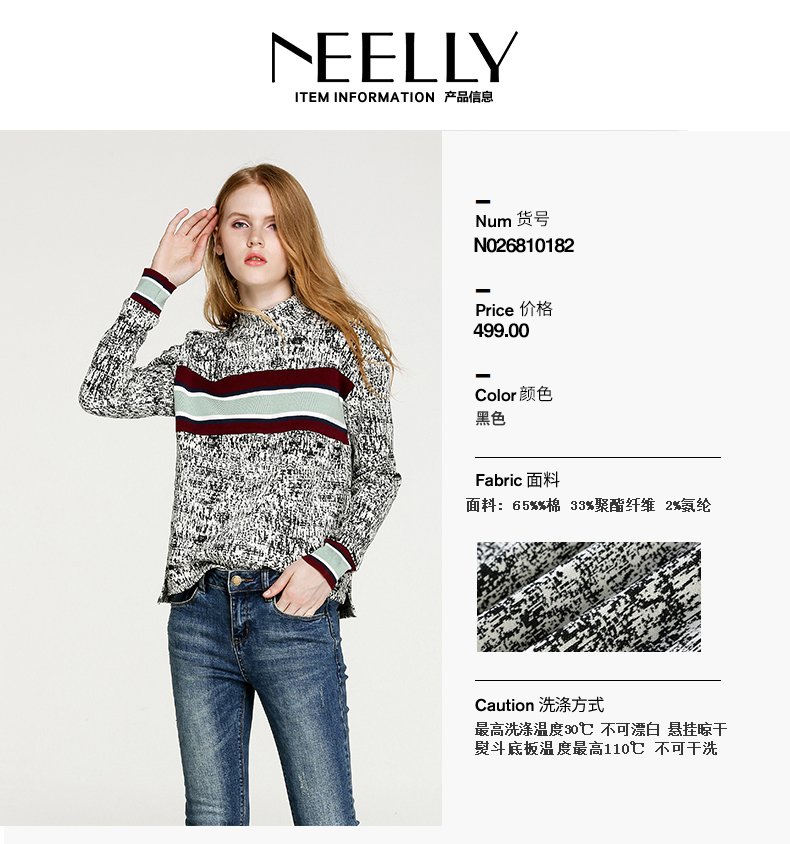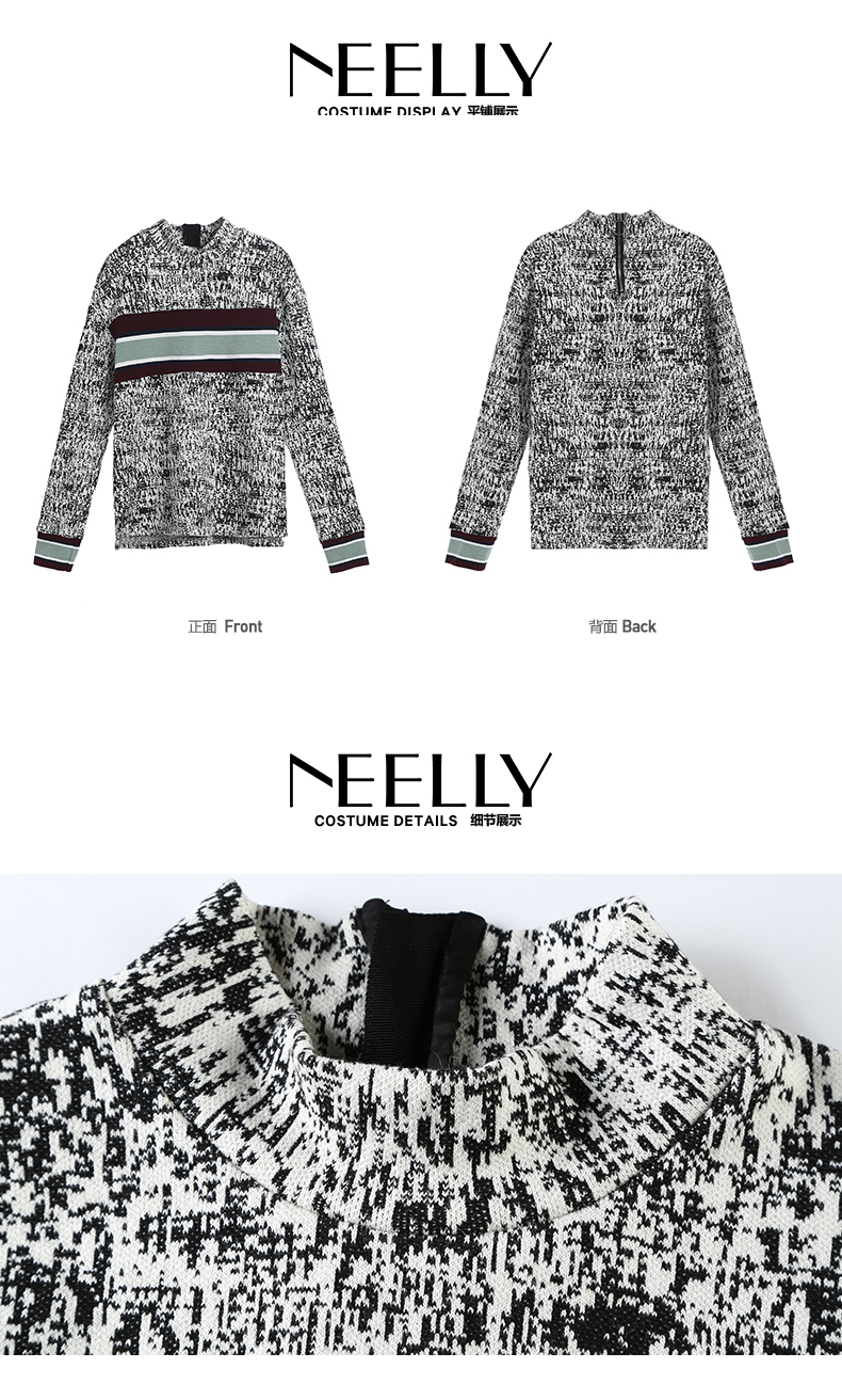 NEELLY/纳俪冬装新款短款女黑白拼色小高领毛针织线衫T恤卫衣