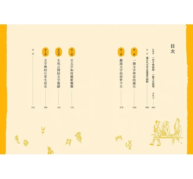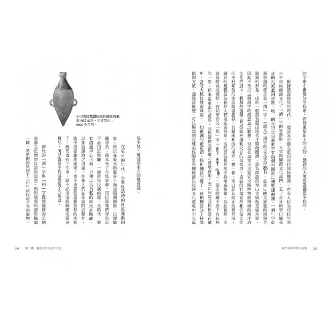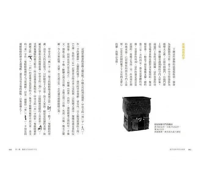 文字與生活密不可分,藉由追溯文字的源頭,我們可以勾勒出數千年前先民的生活形貌。本篇以甲骨文和器物的關係出發,介紹甲骨文中有關日常生活的字。例如「盡」和「徹」這兩個字,其實和古人煮飯的器具「鬲」大有關係;「皆」這個如今看來簡單的字,甲骨文的筆劃不但複雜無比,而且又是跟老虎有關;至於像是「厚」這樣的抽象概念,甲骨文竟然也可以「畫」給你看。正是這些具高度想像力和靈活性的古老文字,發展出現在你我正在讀的篇章,也形塑了我們今日的生活。