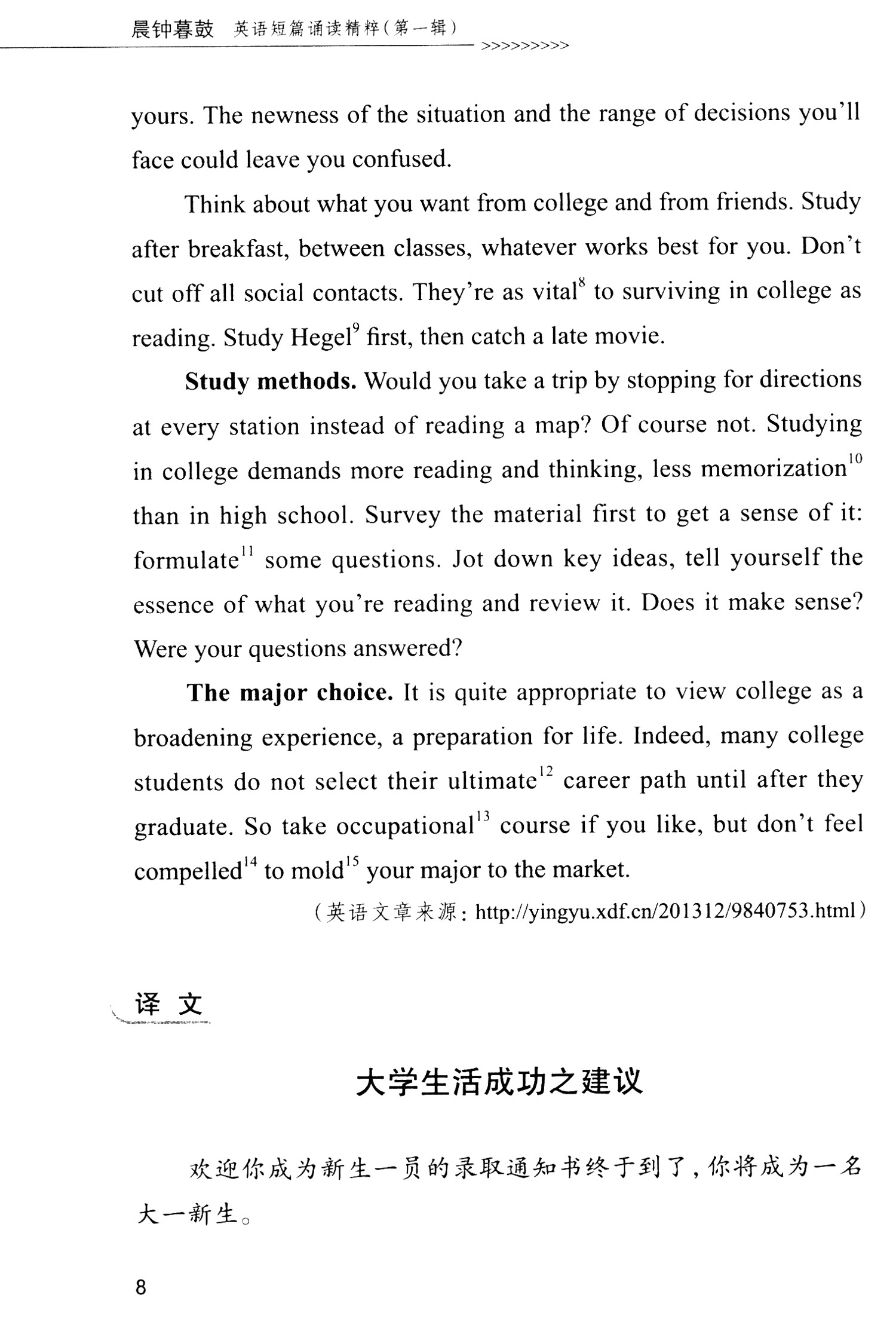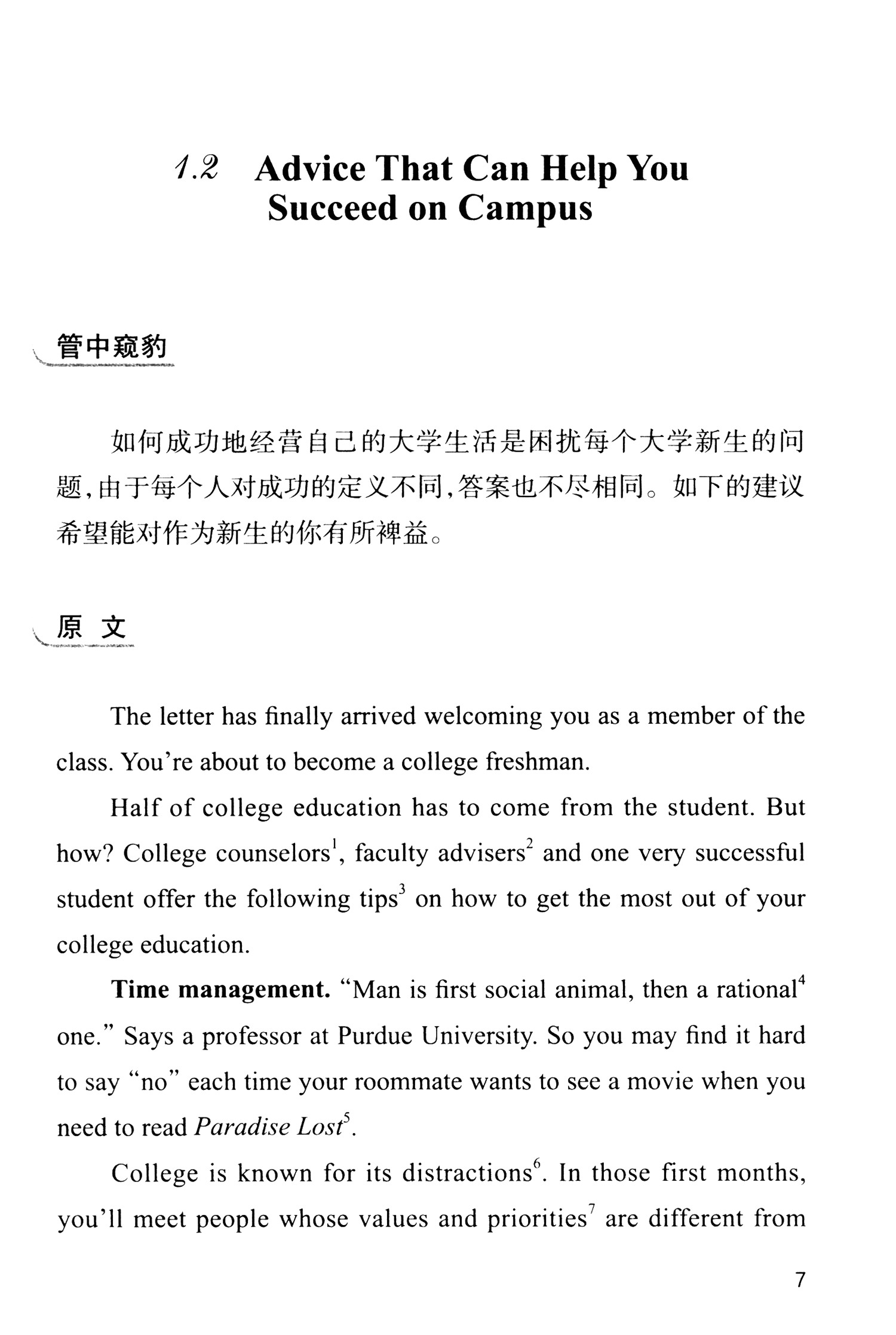 全书所分七个版块如校园生活、人生感怀、经典诵读、文化交流、社会发展、当代生活、技术革命等,从校园到社会,既论古又道今,既谈人文又讲科技,可谓丰富多彩包罗万象,涉及个人与社会生活的各个领域,非常有利于学生在拓宽视野、收获知识的同时,迅速扩大各种背景知识及相关的外语词汇量,加快听、说、读、写、译五项语言技能的掌握。