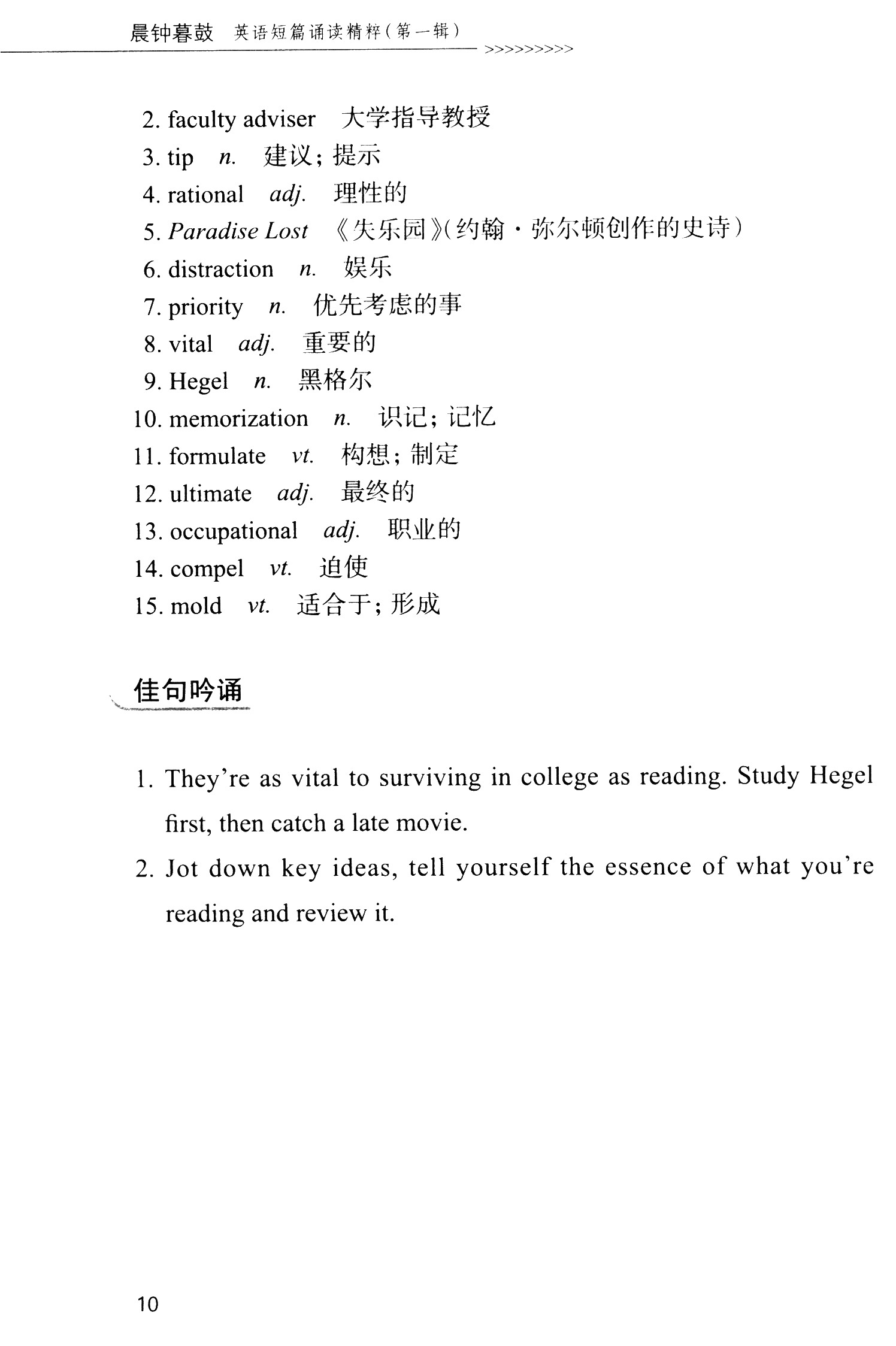 顾名思义,《晨钟暮鼓》是为学生晨读(早自修)与暮读(晚自修)所编撰,也就是为学生在没有教师指导的情况下自学所用。全书的体例结构服务于这一宗旨,采用多种手段使之适合学生自学:管中窥豹,简明扼要地点明文章要旨;提供译文,便于学生利用母语优势加深理解;配有插图,使学生在图文并茂的情境中培养审美情趣;添加注释,扫除有关背景、语法或冷僻词语等方面的理解障碍;精选佳句,便于学生在默读之余放声朗读,在吟诵中欣赏名言警句,汲取文章中蕴含的哲理与智慧。
