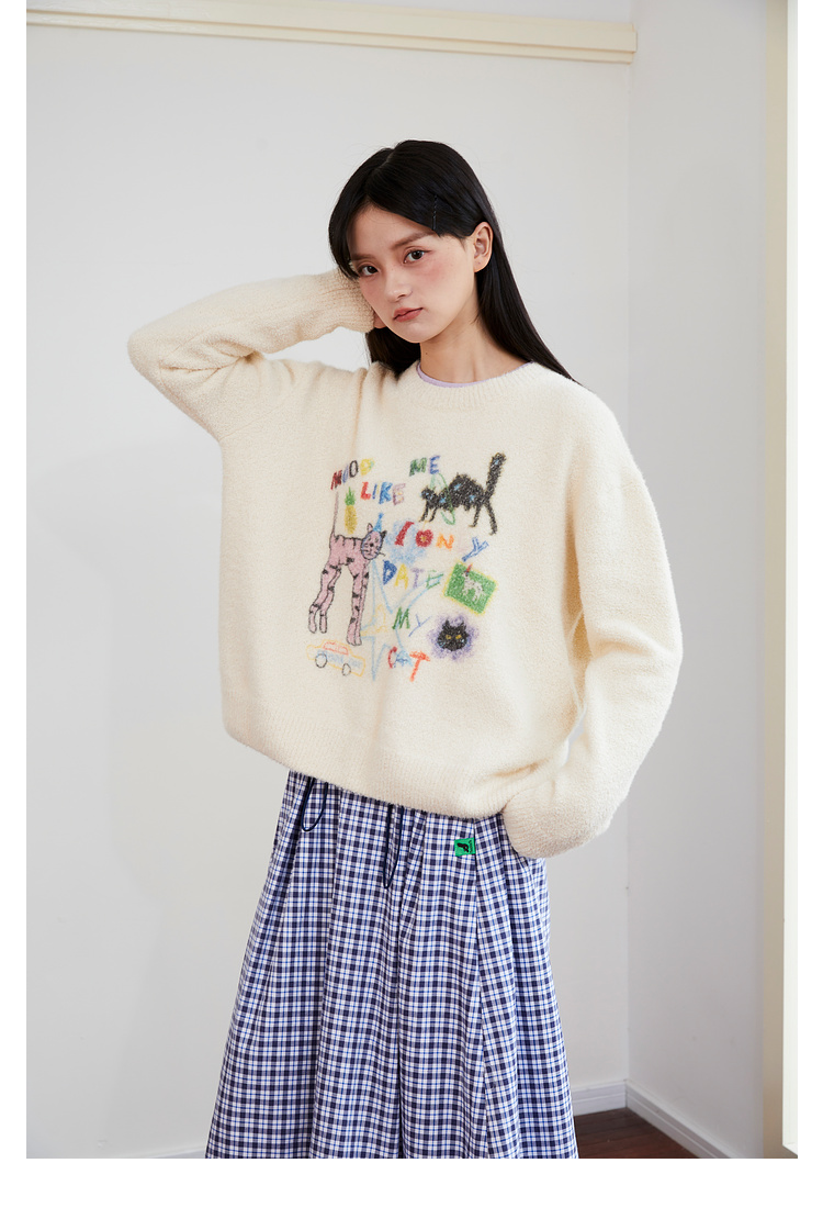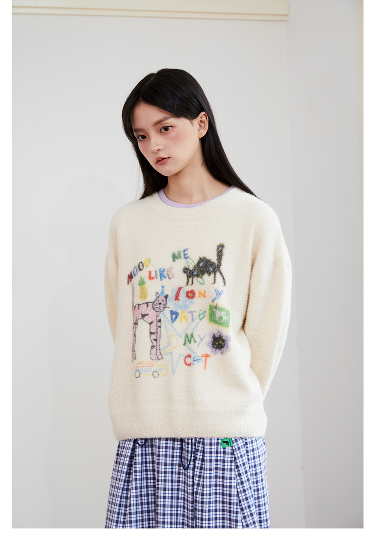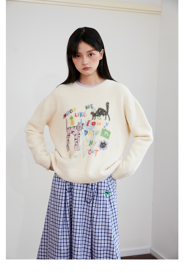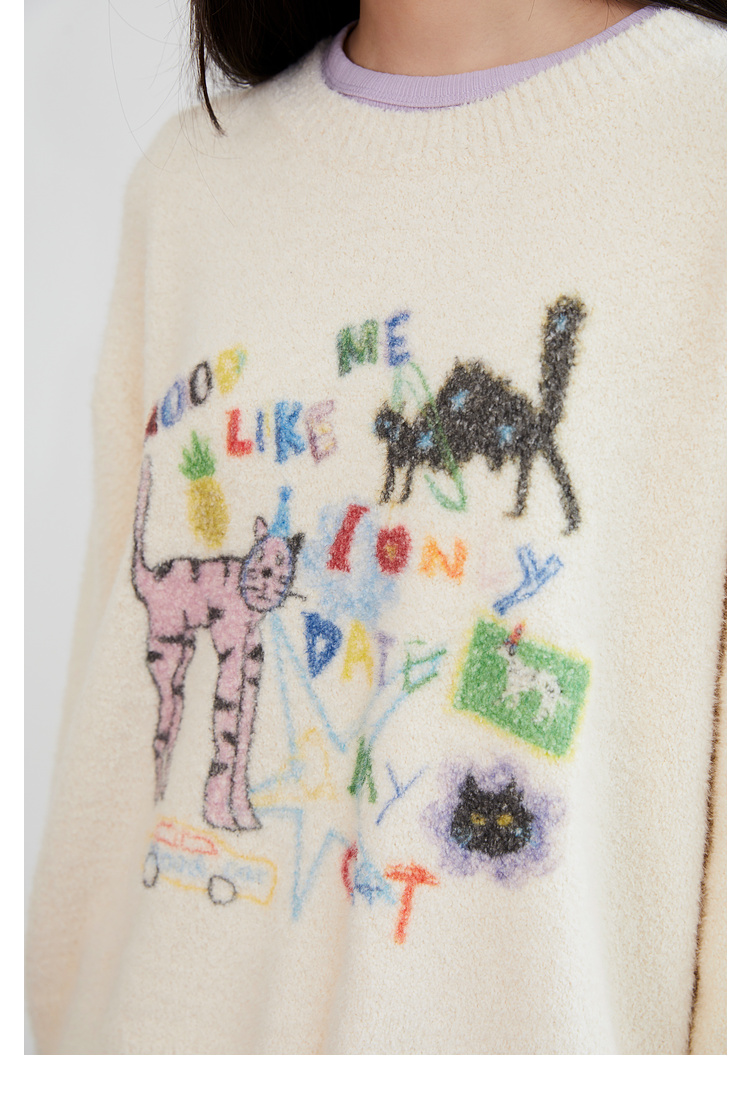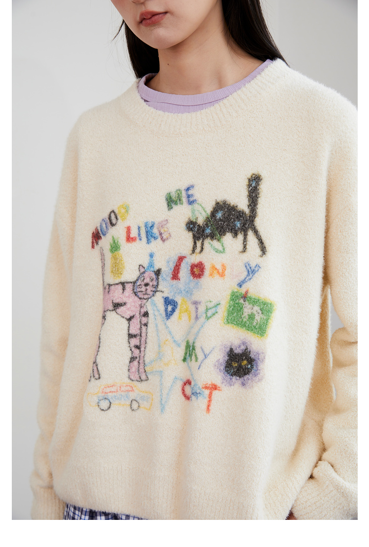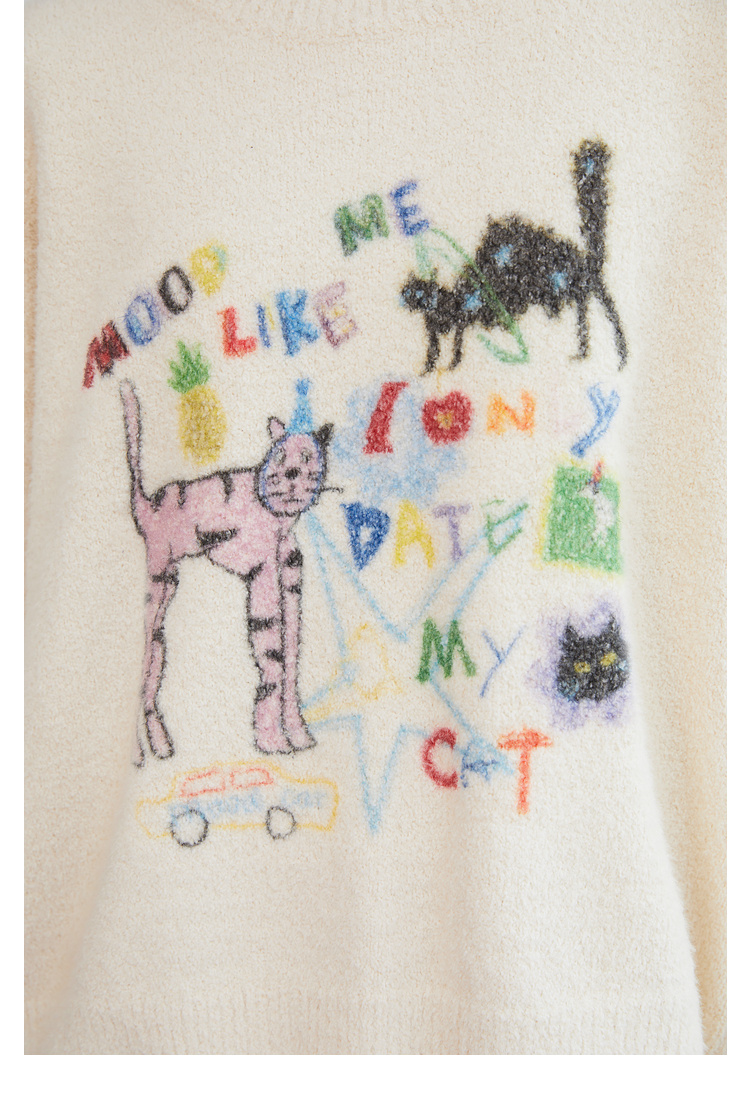 Mood Like Me/MMY2413/手绘涂鸦slogan猫咪铅笔画针织毛衣
