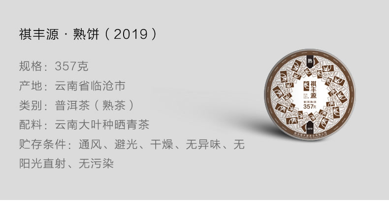 普洱熟茶丨祺丰源 2019年 祺丰源熟饼 357克/饼