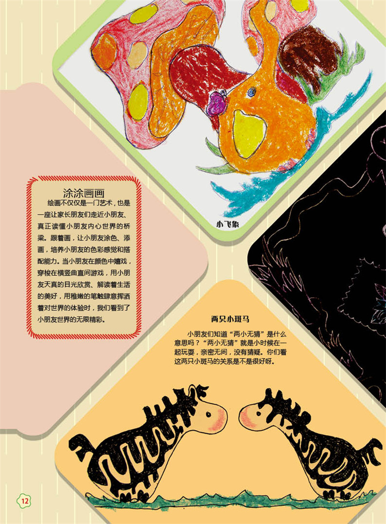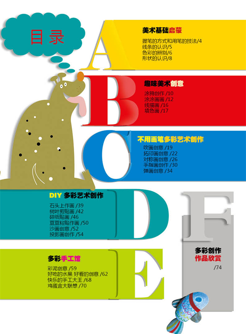 《幼儿园多彩创意》为幼儿园创意系列,主要培养幼儿从生活中发现创意。多彩创意综合篇是幼儿美术基础的提高,主要讲述了色彩的运涂鸦和涂画、线条的组合搭配、形状的组合搭配;创意美术的的实践,括用颜料讲生活中的物品表现出来、各种豆类的创作、彩陶作品的创作;对色彩的感知创作:四季的表现,后是作品欣赏。