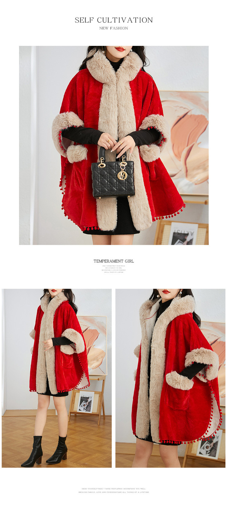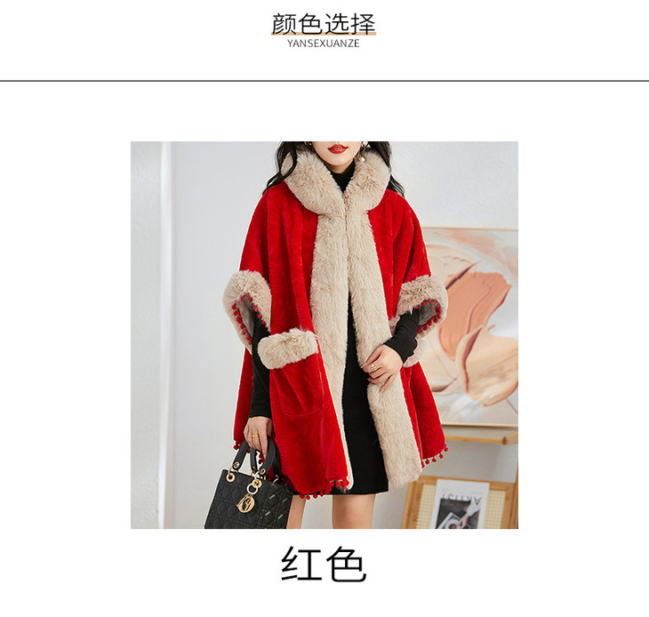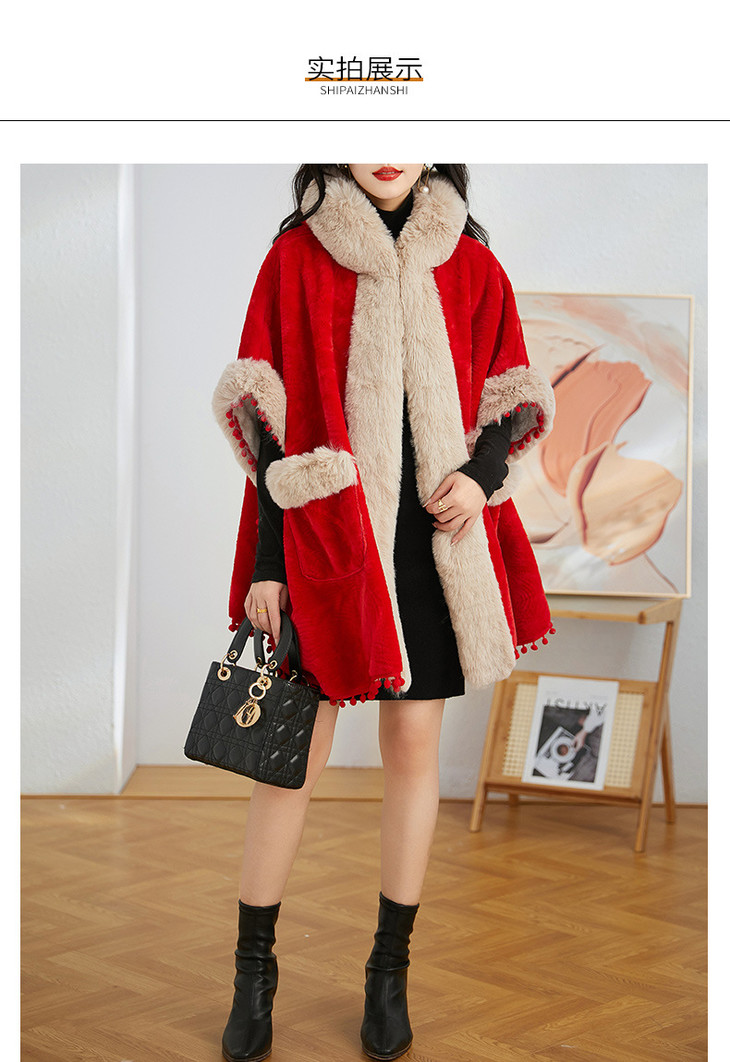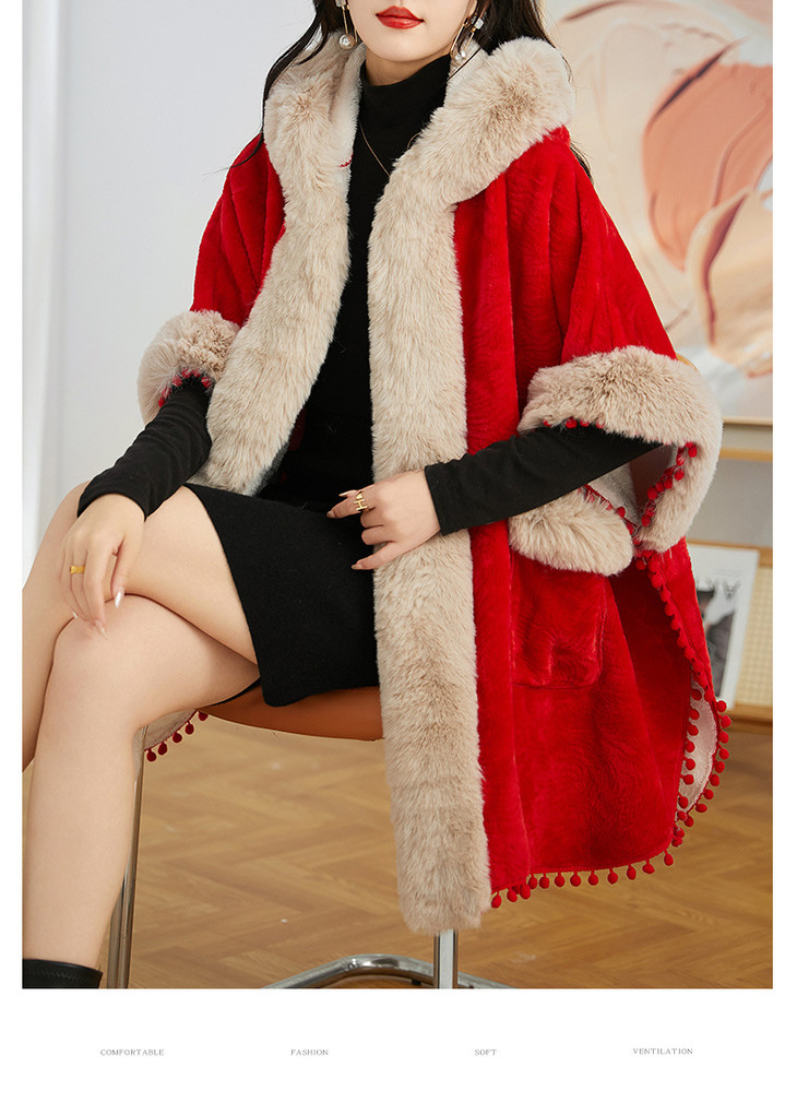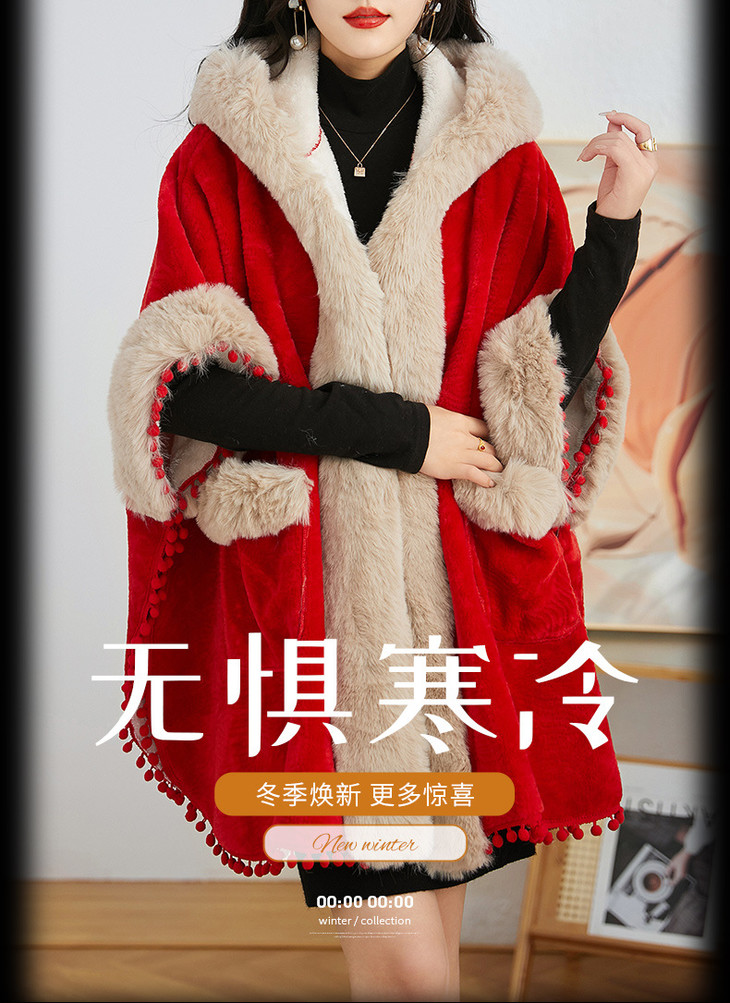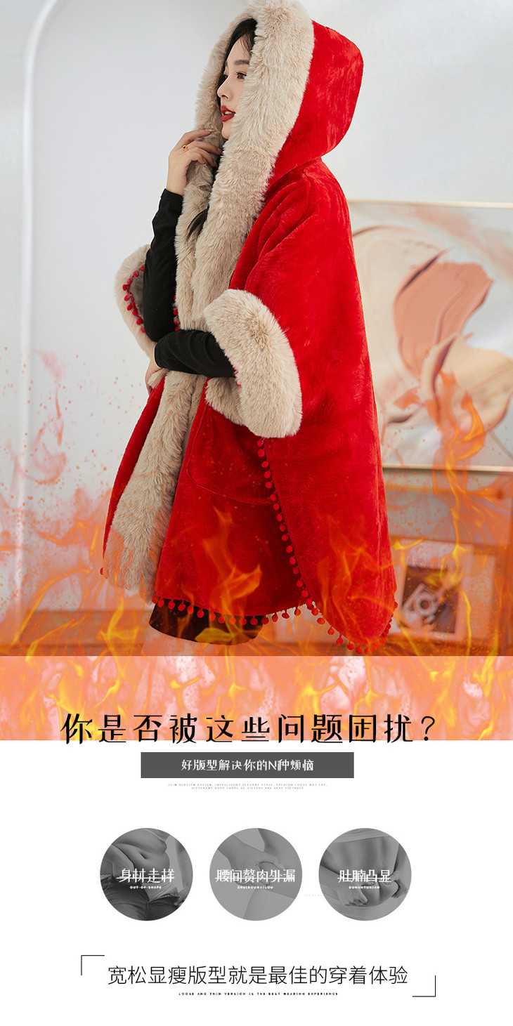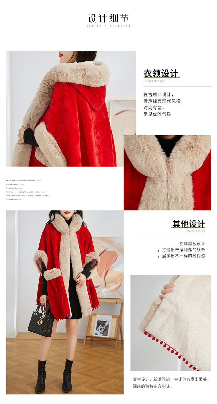 简约时尚连帽毛呢斗篷外套,2023冬宽松显瘦红色中长款大衣HR-WZ231029