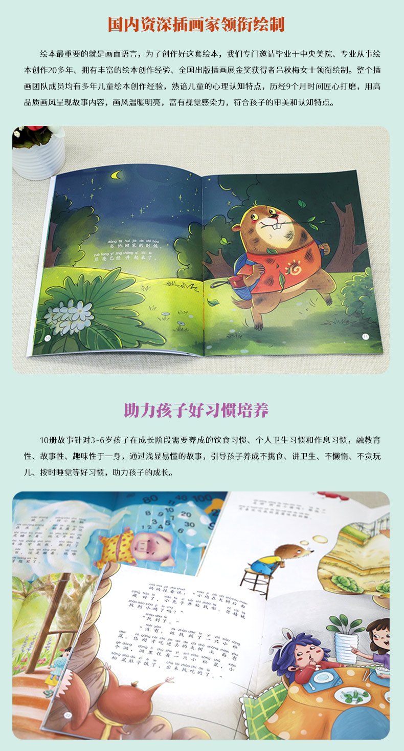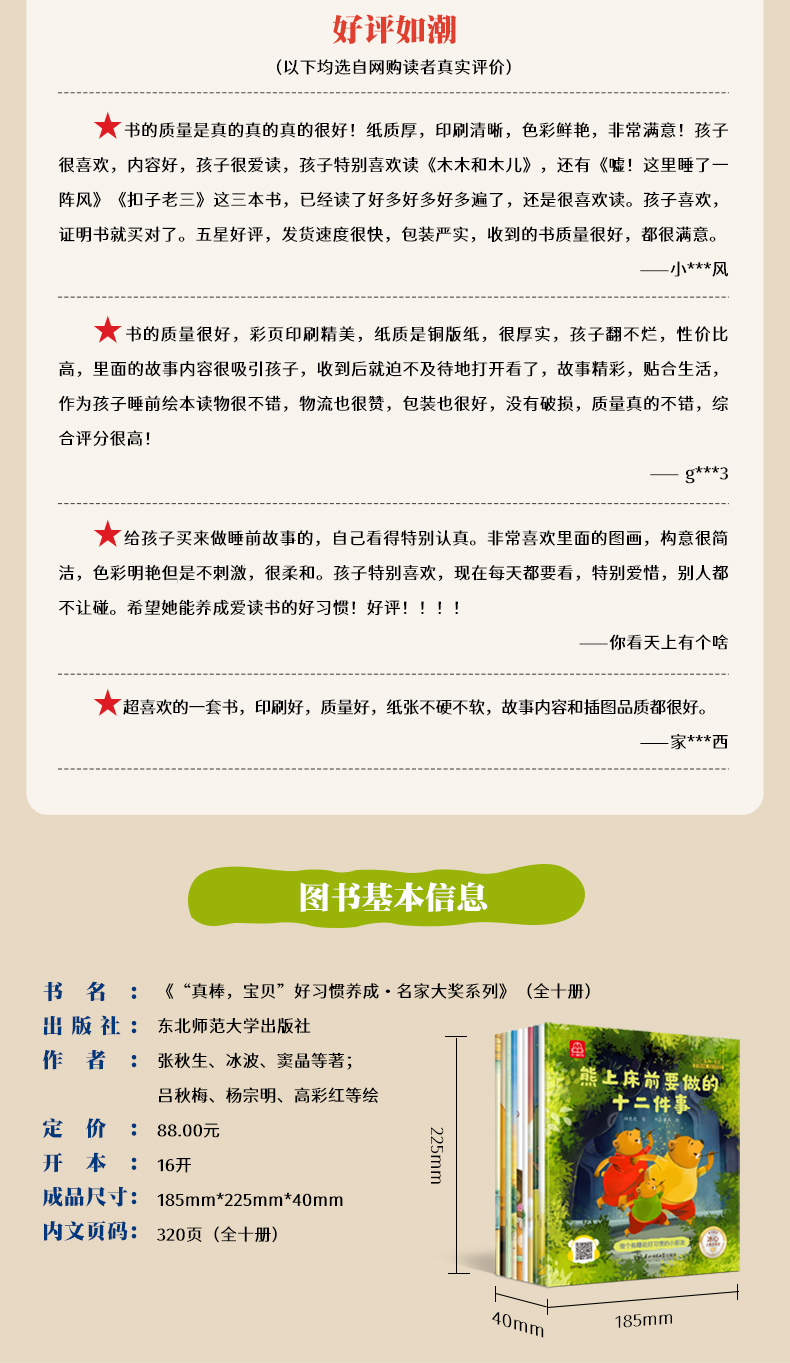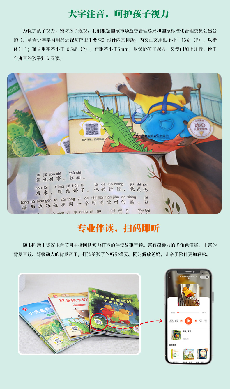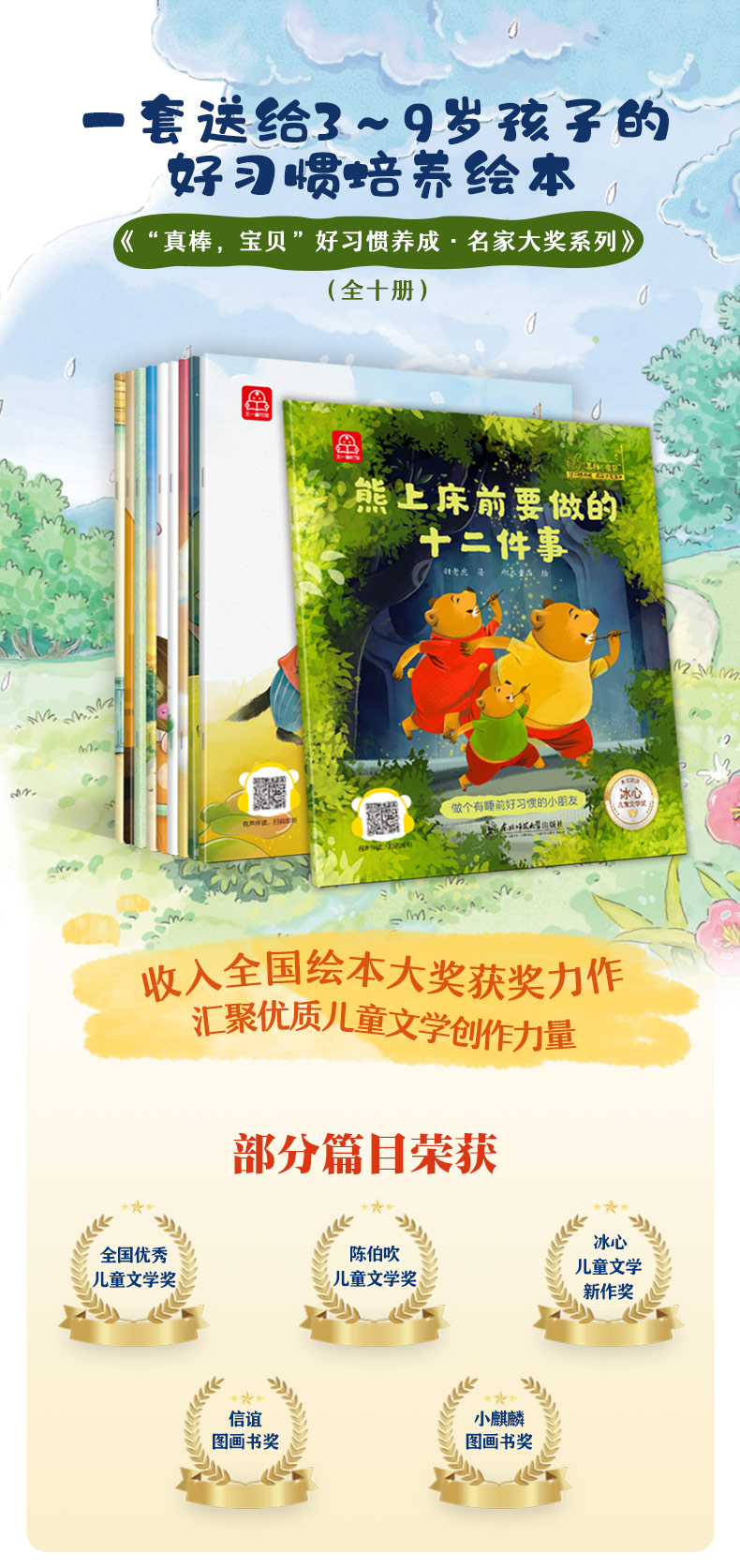 《”真棒,宝贝“好习惯养成 . 名家大奖系列》(全十册)全国大奖获奖绘本,中国童书榜“百佳童书”获奖绘本系列,收入全国优秀儿童文学奖、陈伯吹儿童文学奖、冰心奖、信谊图画书奖获奖作品,大字注音,便于孩子自主阅读。画风温暖明亮,符合孩子的审美趣味,随书附赠由专业电台主播打造的媲美小型音乐剧场音效的伴读故事音频,扫码即听。