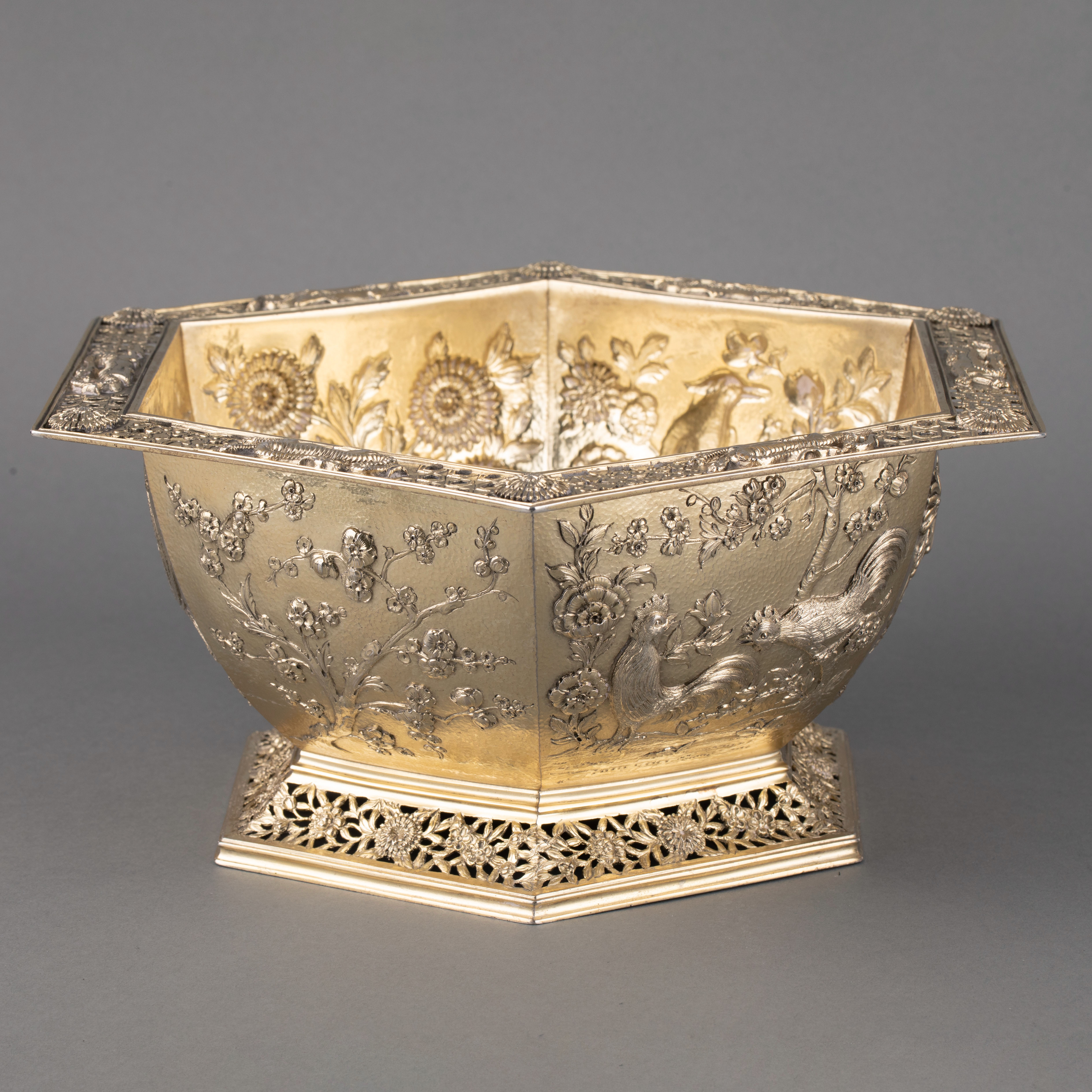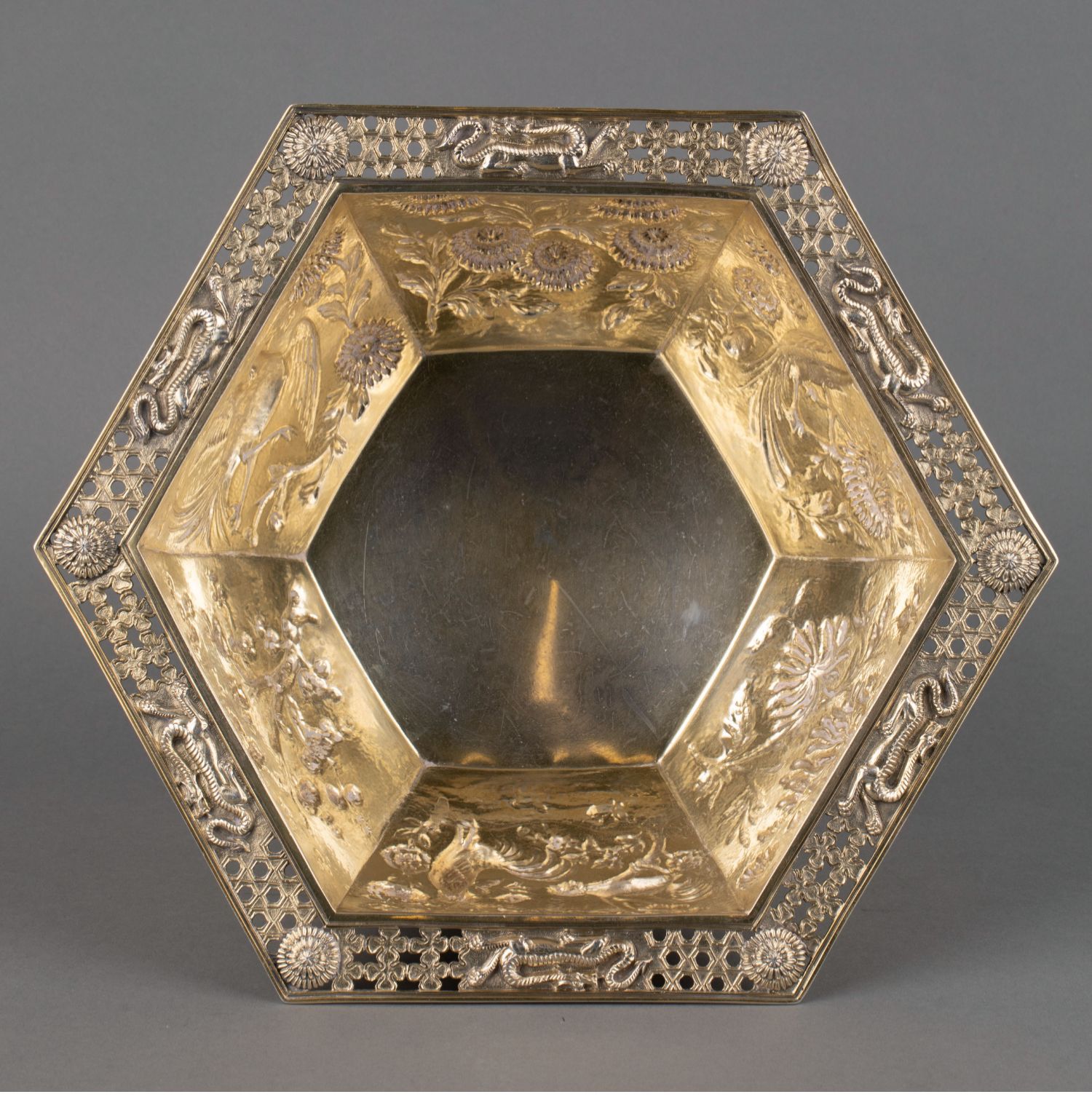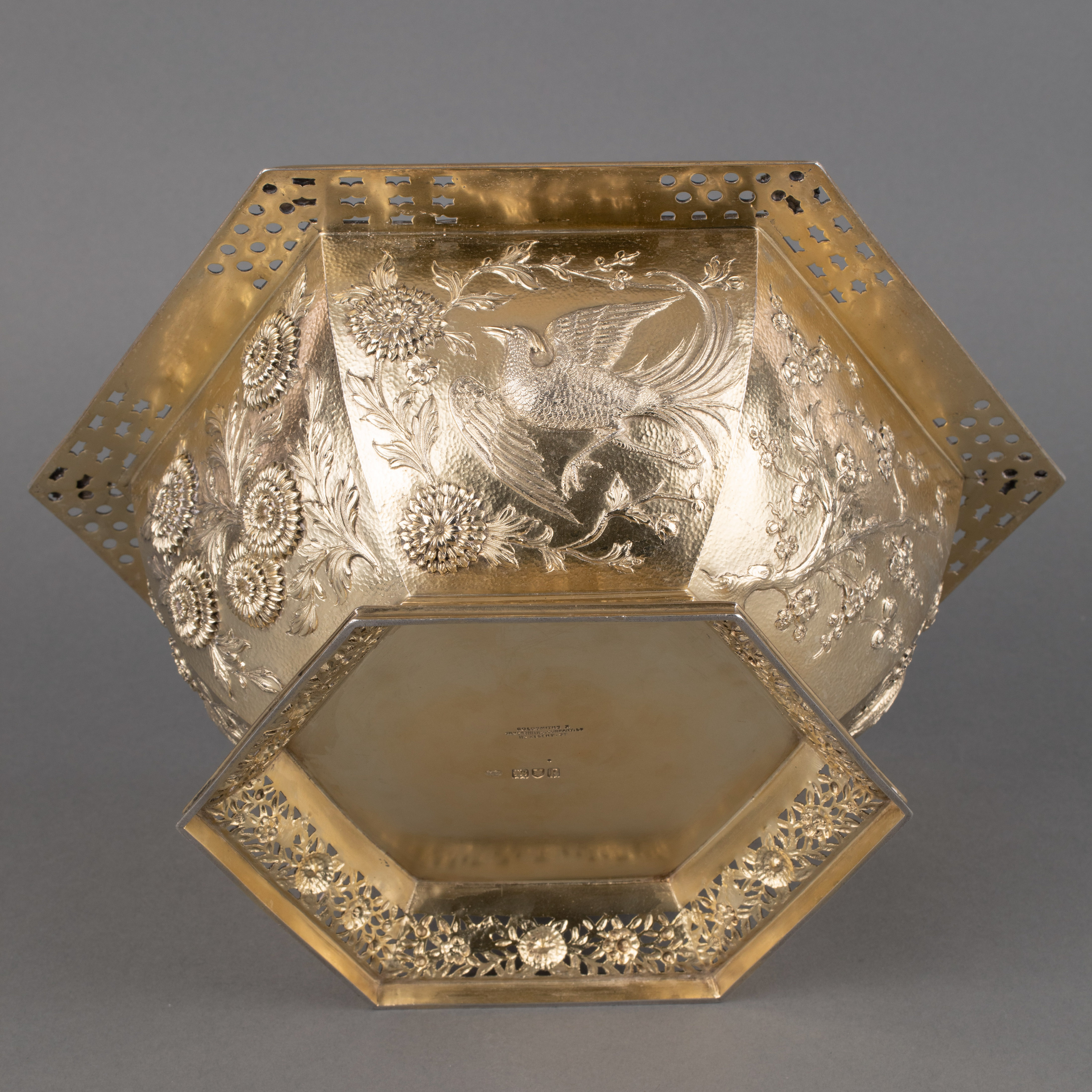 独角鹿西洋古董1910年英国出品镂空底座六角银鎏金花鸟浮雕碗果篮