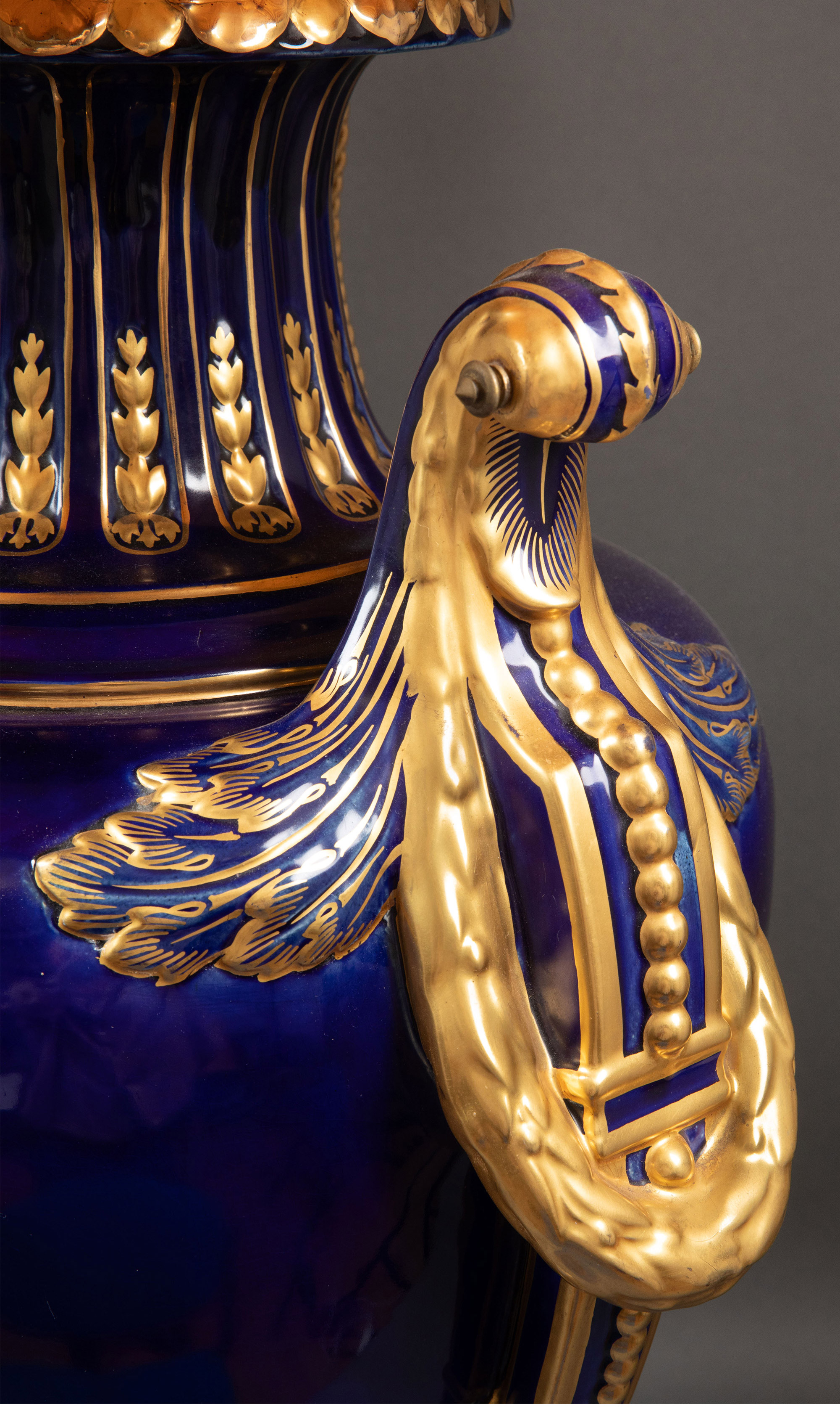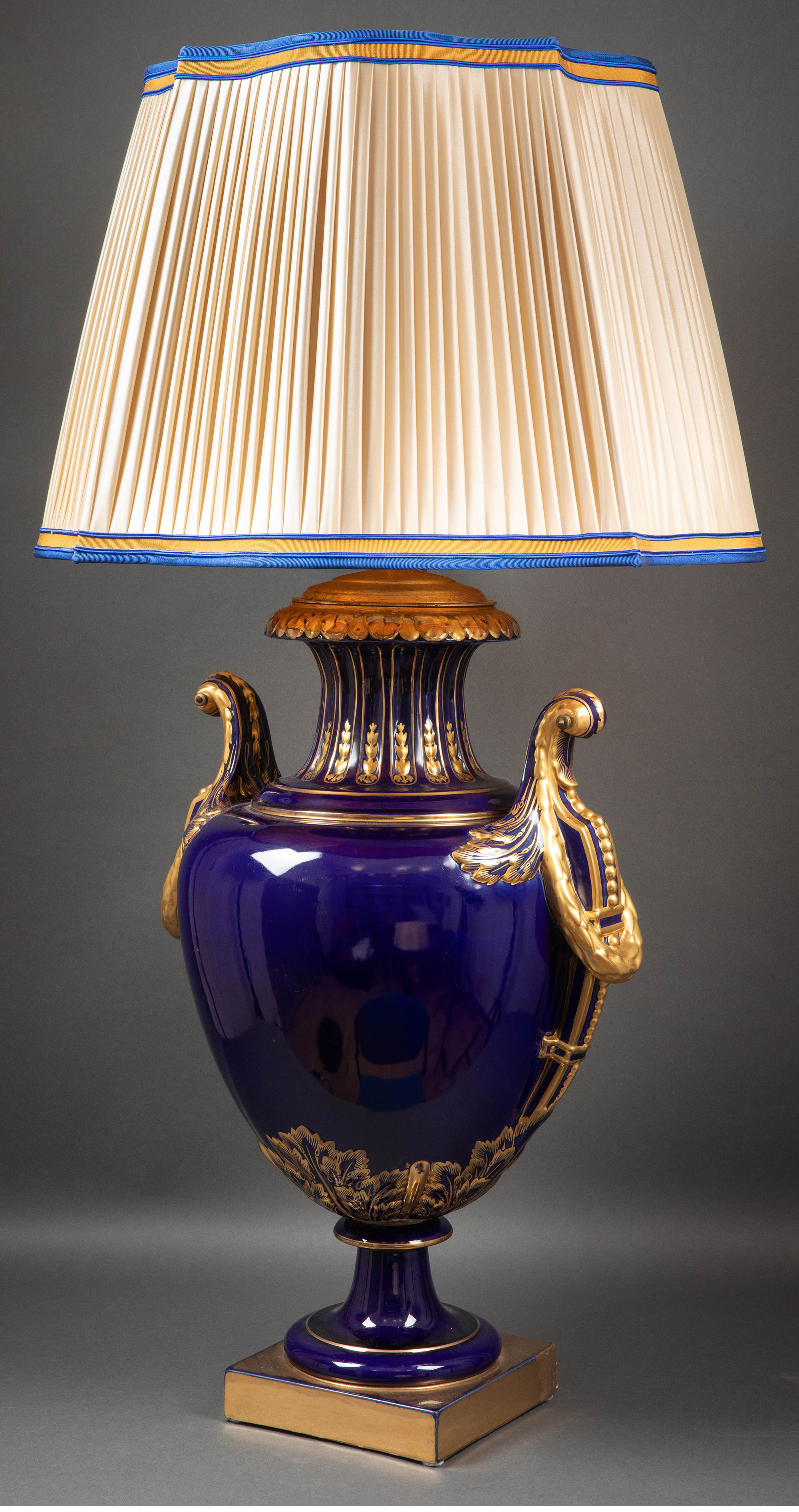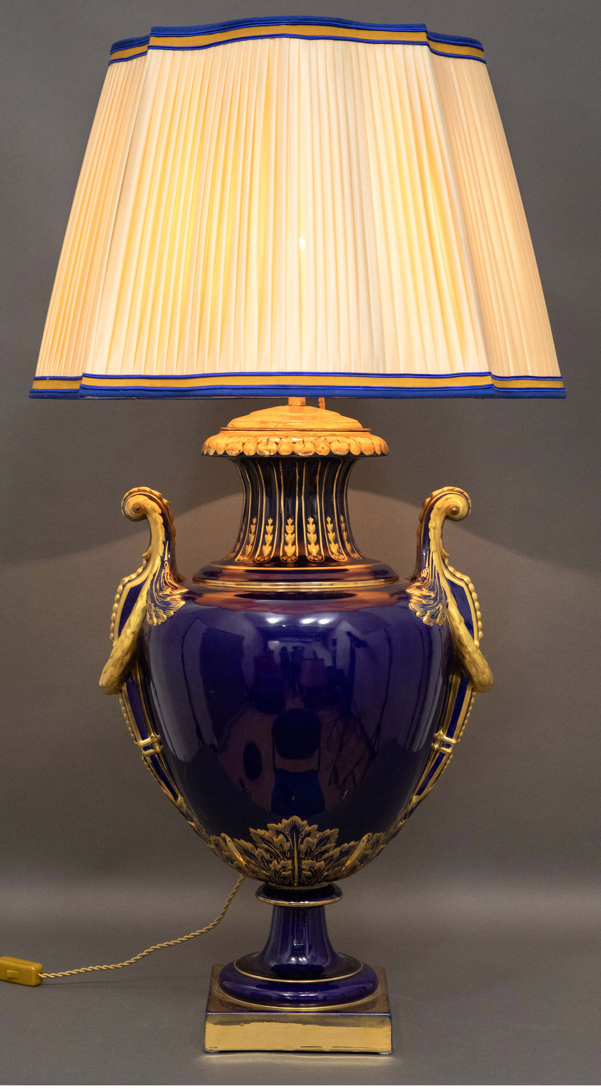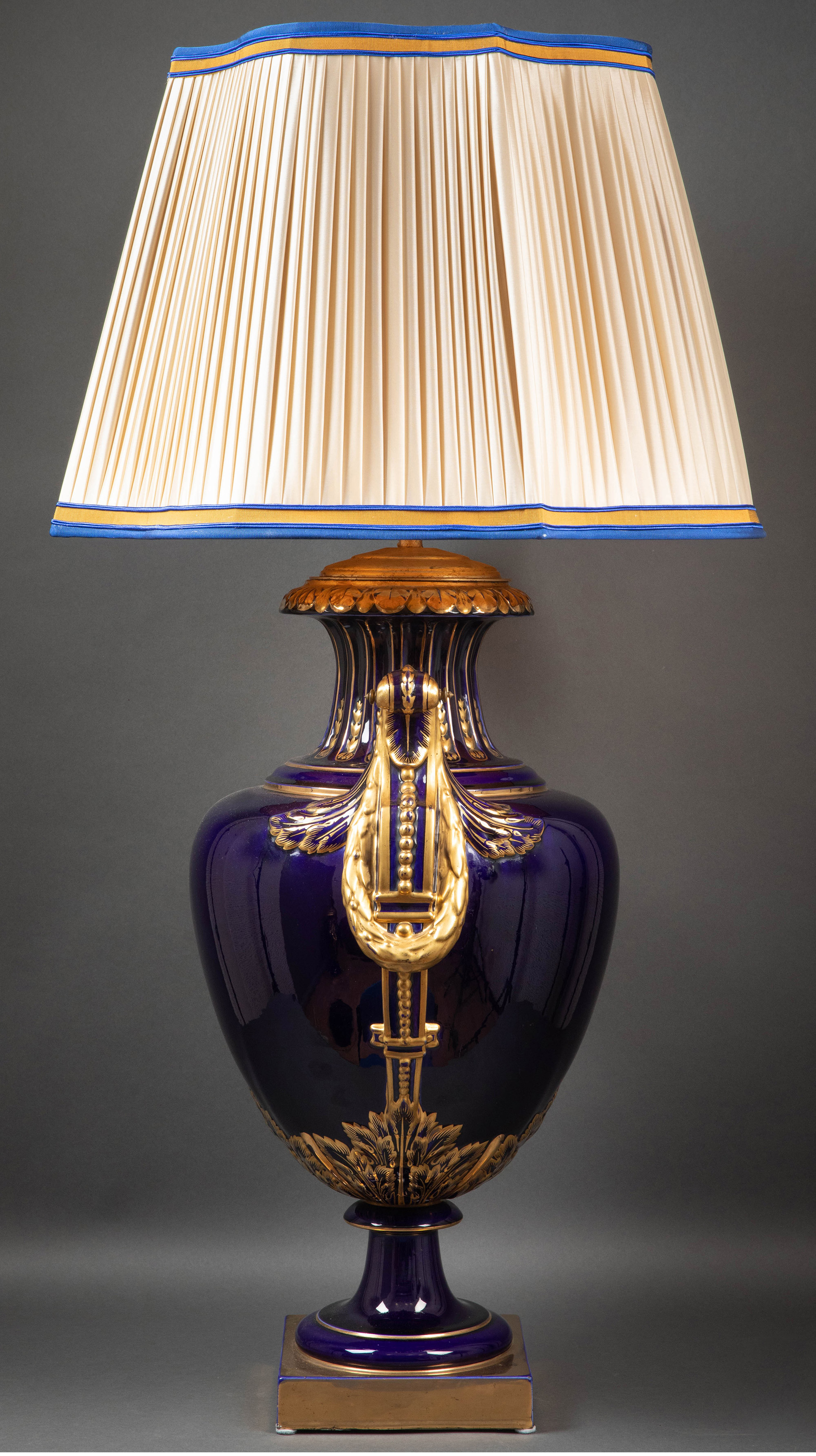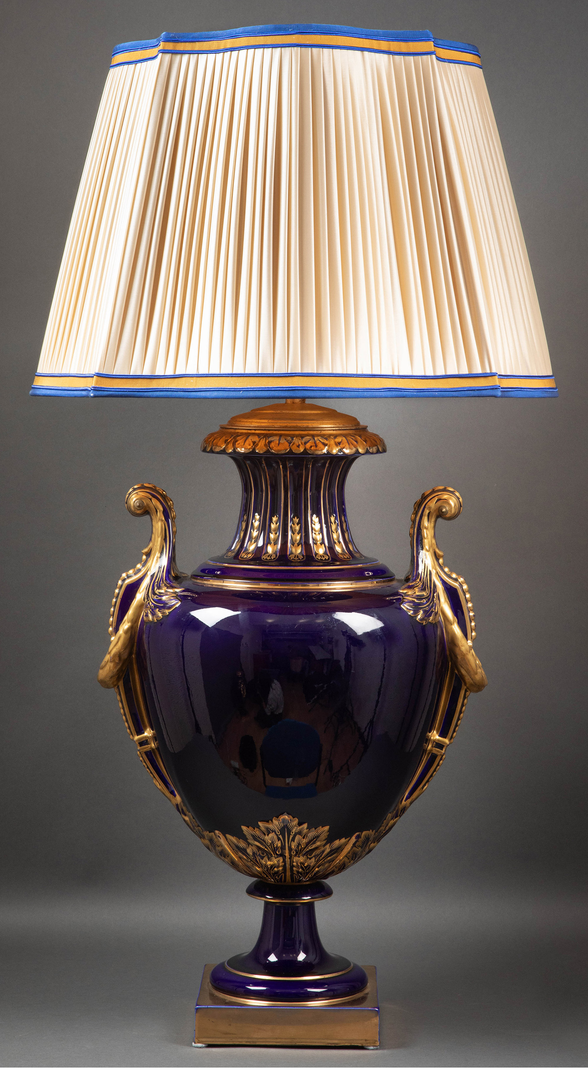 19世纪末法国出品路易十六风格铜鎏金精雕嵌塞弗尔风格帝王蓝瓷瓶瓷瓶台灯一对