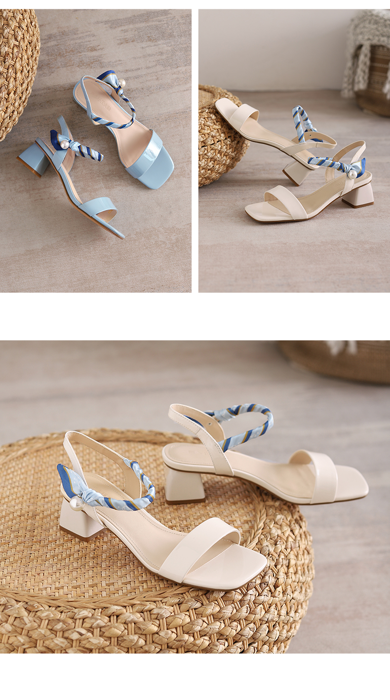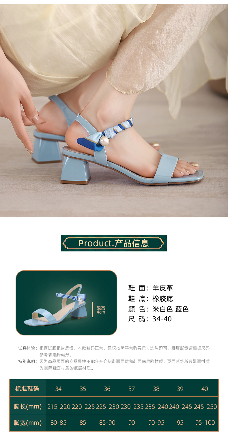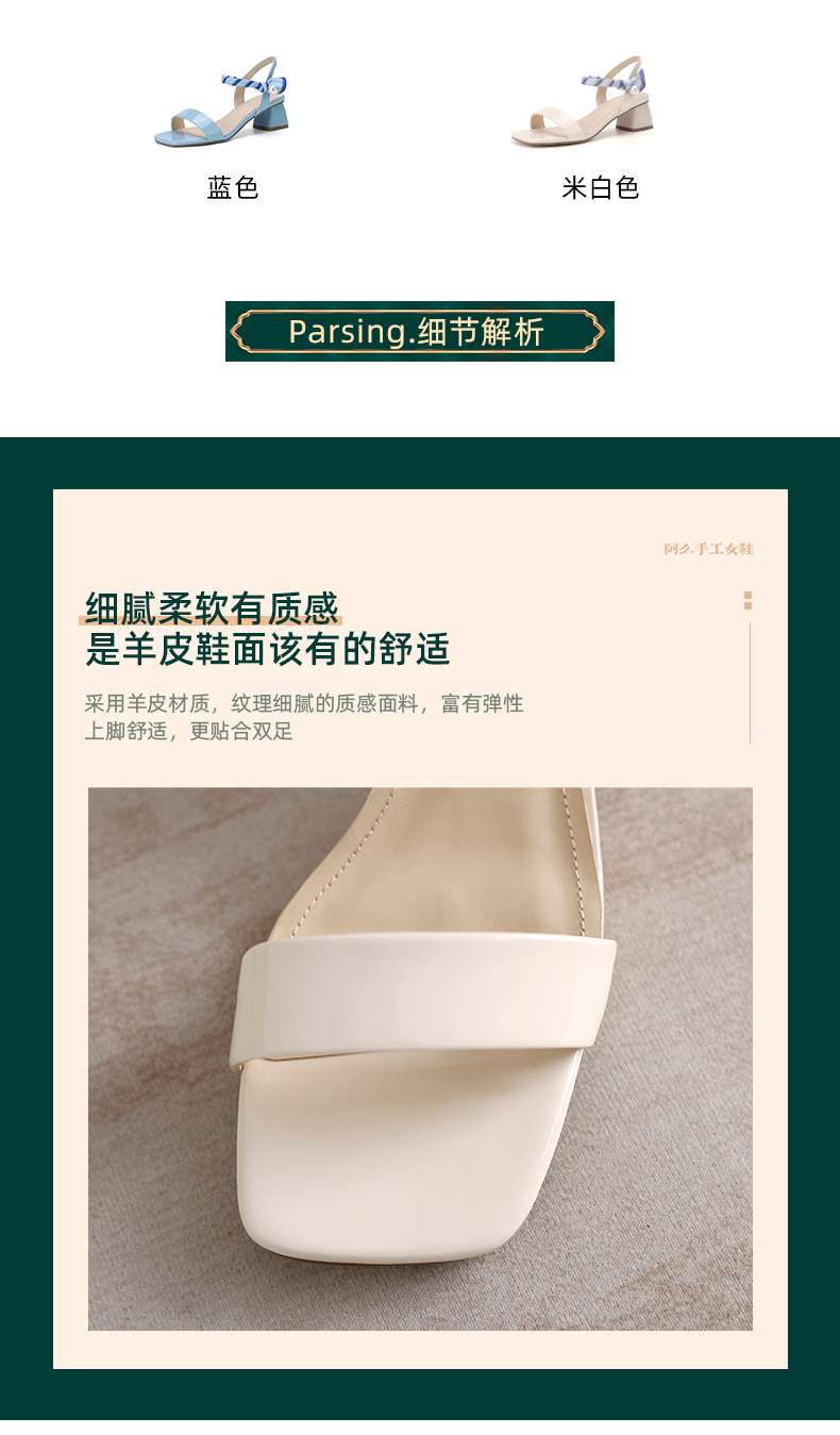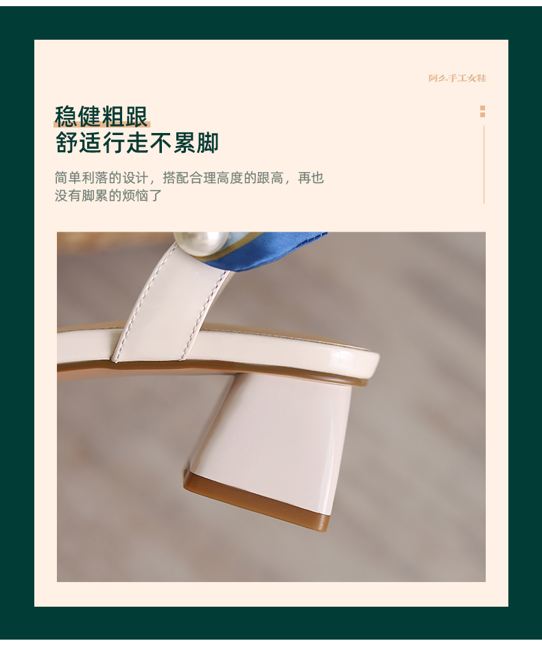 阿么手工女鞋夏真皮一字带凉鞋气质4CM时尚珍珠方头时装鞋仙女风