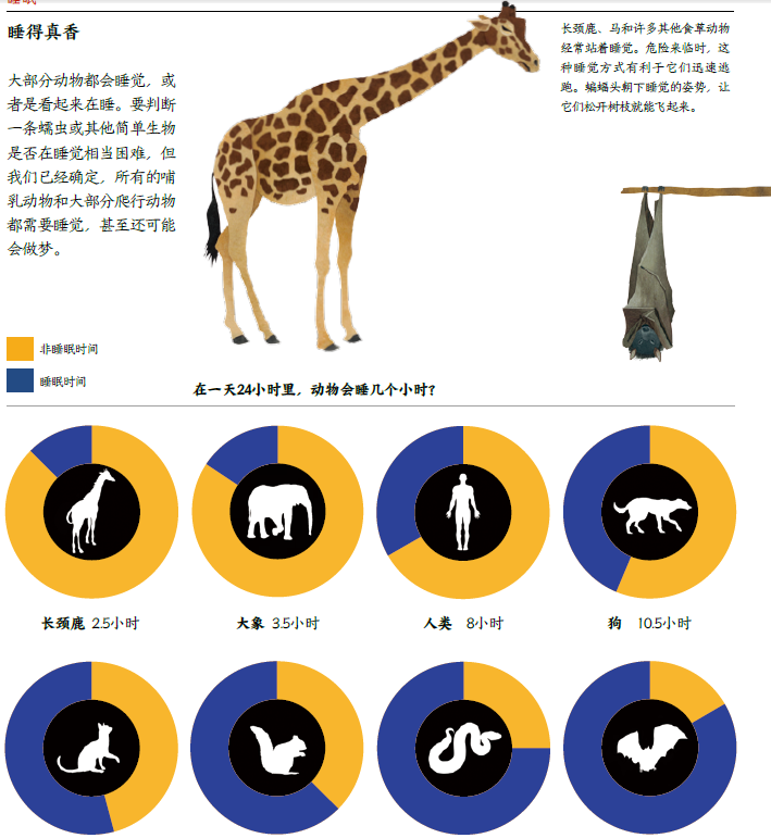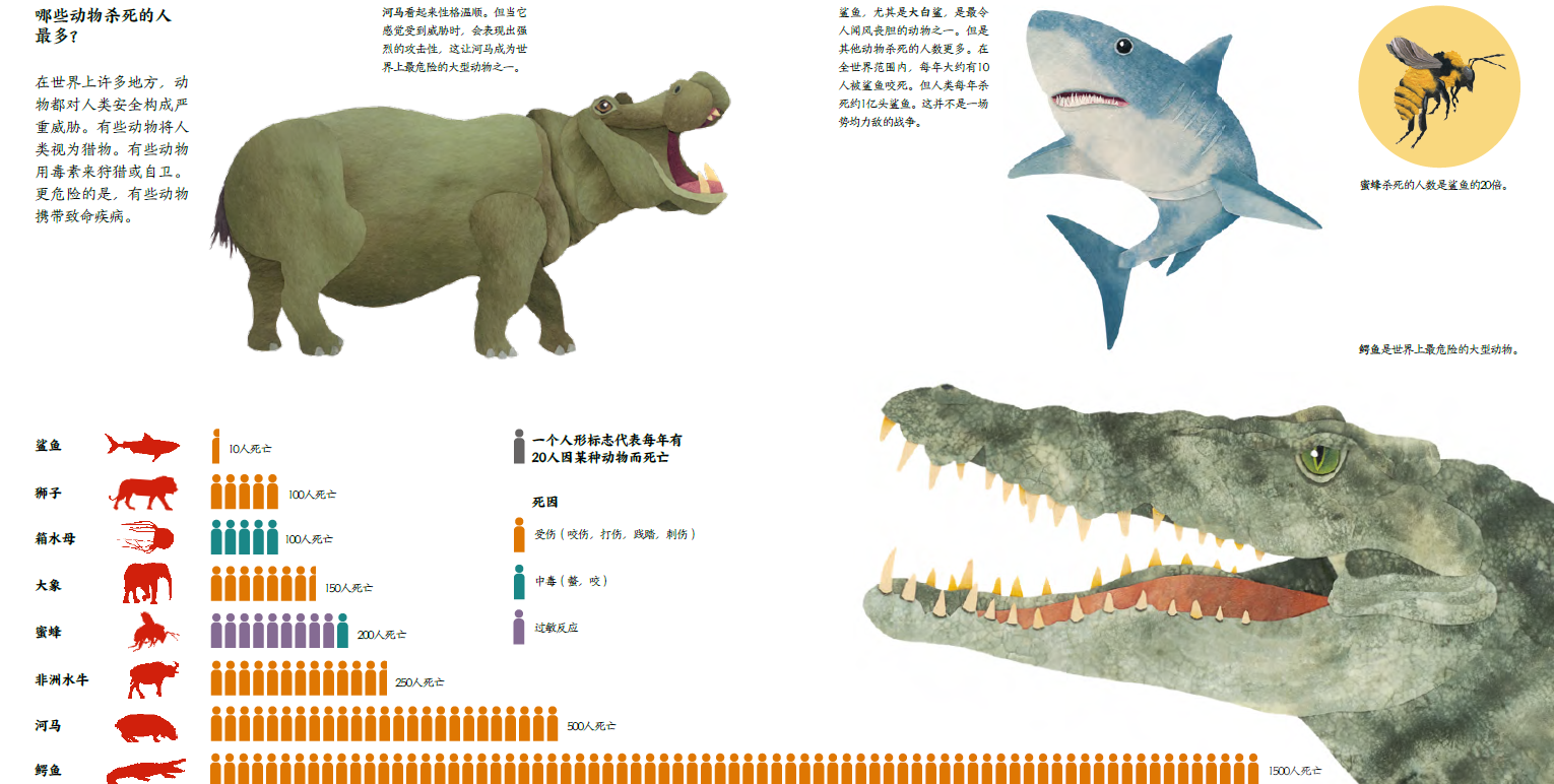 诸如世界上有多少个物种、比人类长寿的动物、长颈鹿每天睡几个小时、动物中谁的舌头长、蚊子和毒蛇谁更危险这类令人震惊的动物事实,绝对会勾起读者的好奇心。