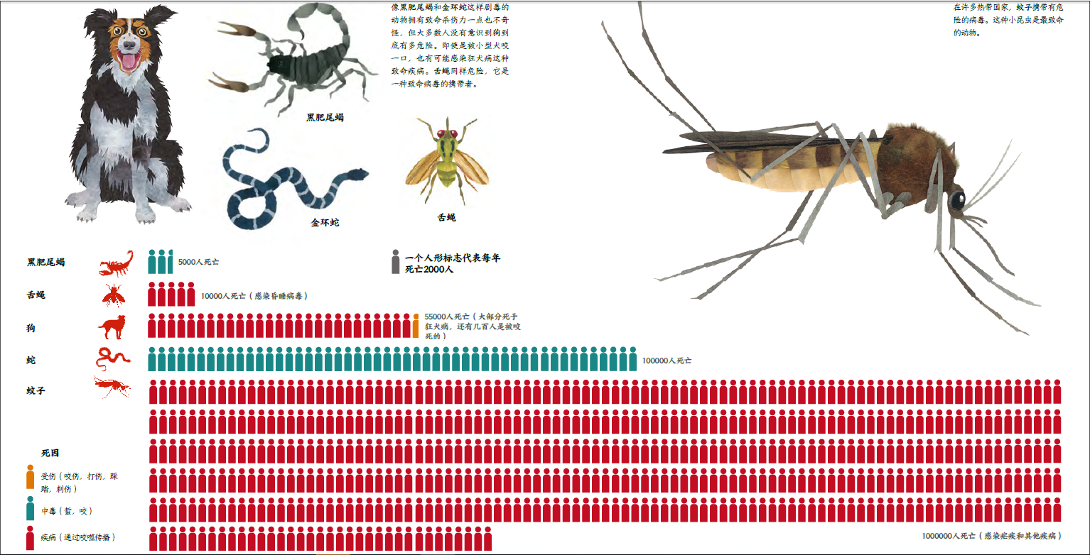 饼状图、气泡图、散点图、树状图等多样化的数据呈现方式,再加上碎片化的动物小知识穿插其中,科学性和趣味性在这本书里完美统一,摆脱了统计学数据枯燥无趣的刻板印象。而且,由书中直观数据提供的答案往往出人意料,与一般认知形成强烈反差,会给读者带来大开眼界的新奇感。活泼的配色具有吸睛效果,让数据一目了然、易于理解。