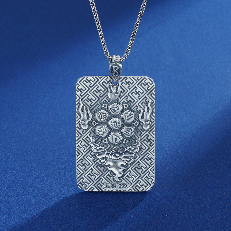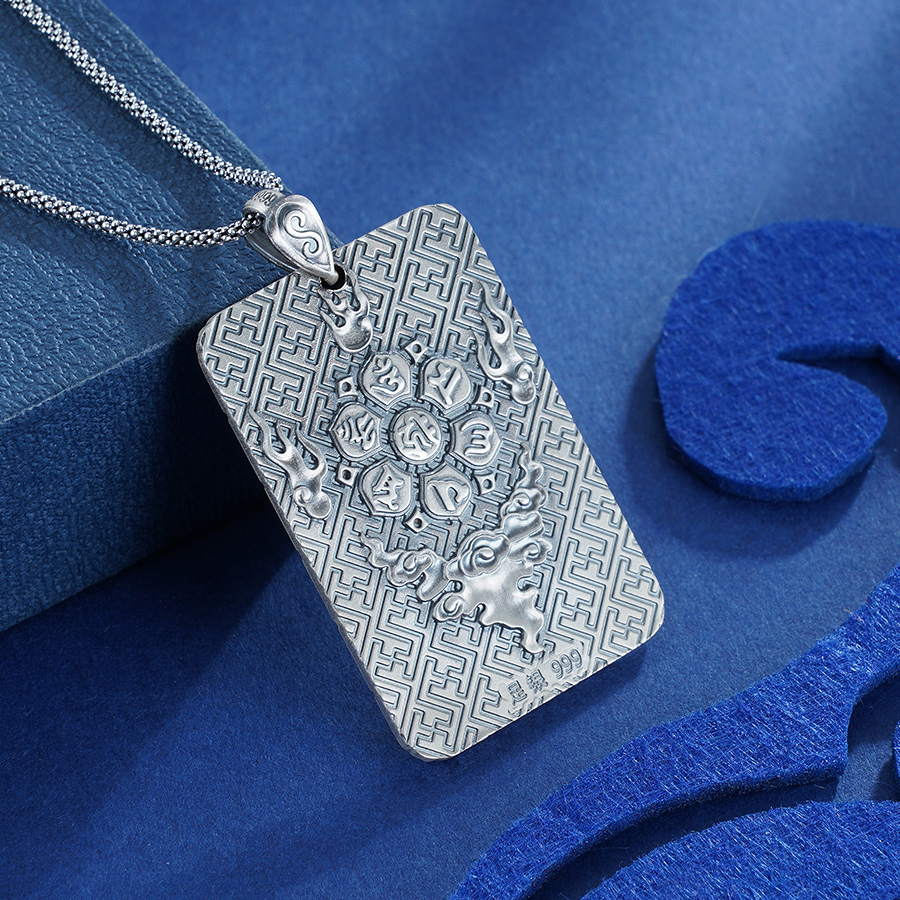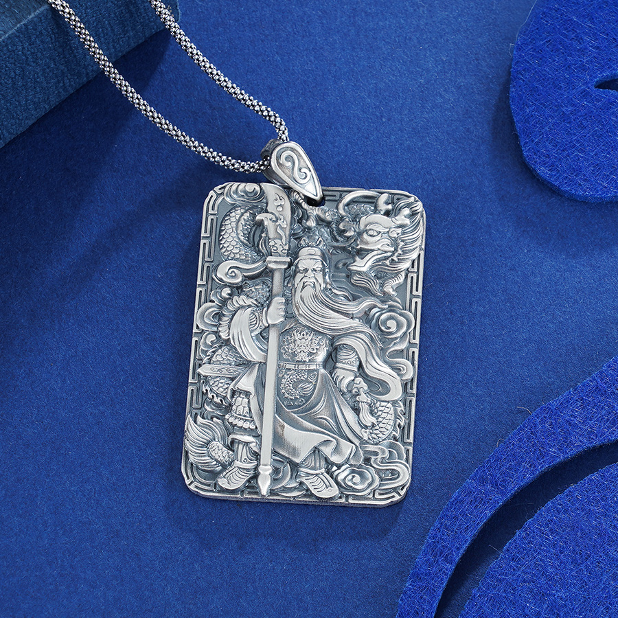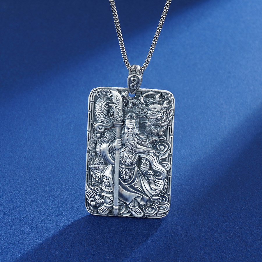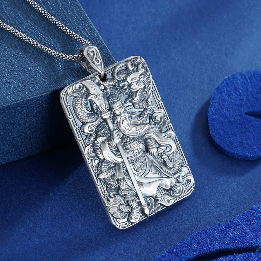 【寓意】:吊牌之上錾刻关公图案,关公手持青龙偃月刀,御龙飞行,威风凛凛。佩关公吊坠,寓意勇力迸发,所向无敌。