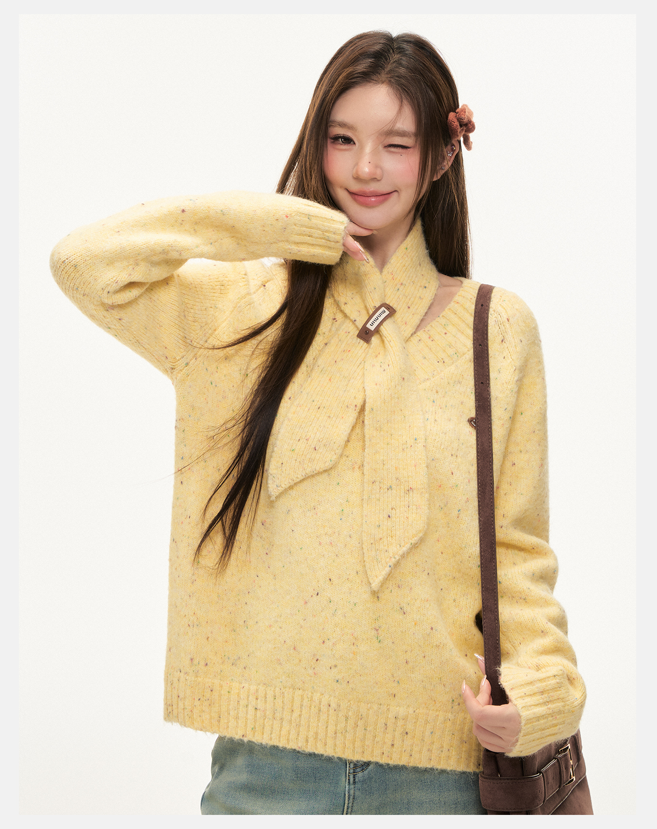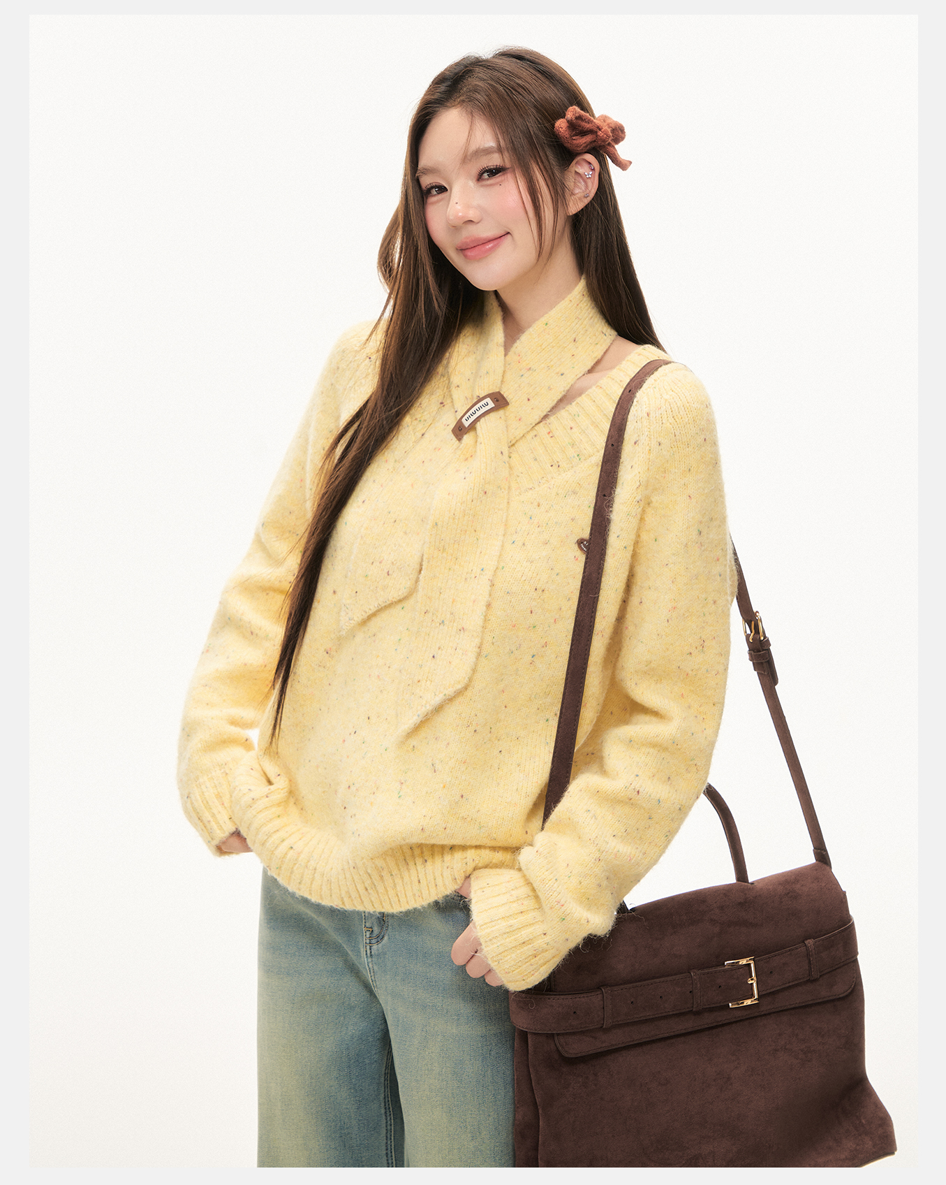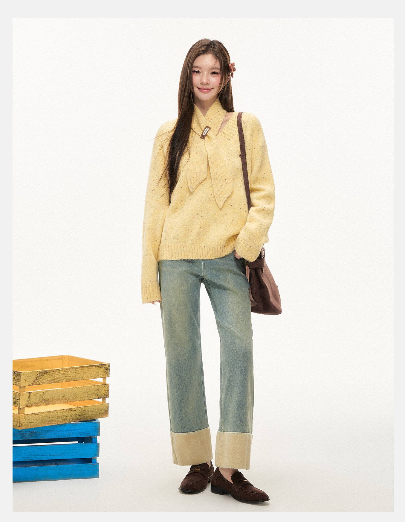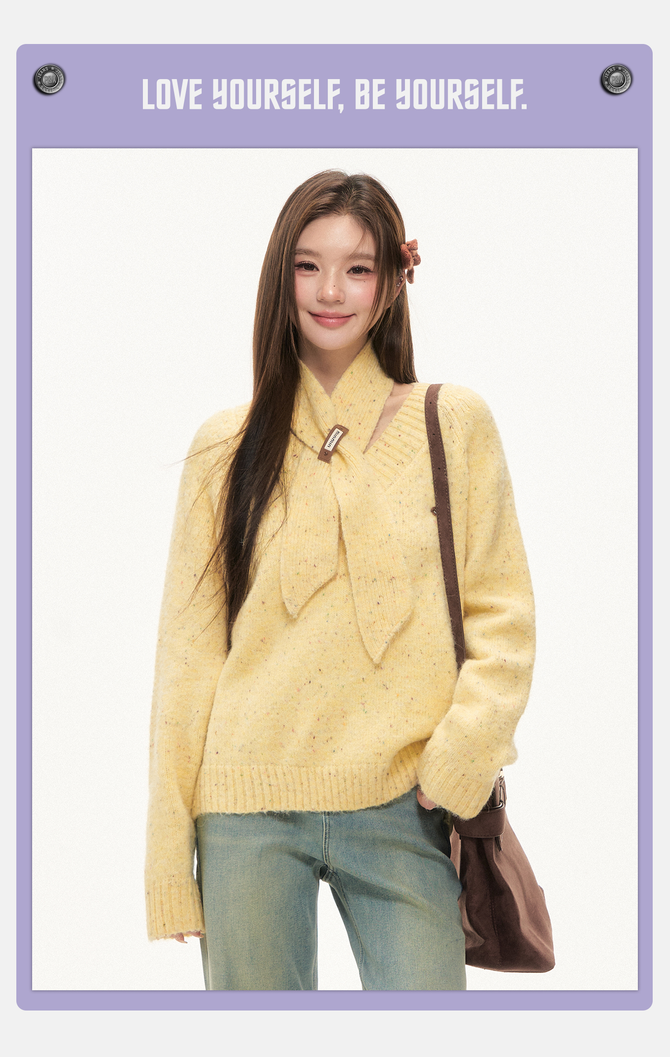 P&X设计师女装2025冬季宽松围脖套头V领短款毛衣825418183 黄色