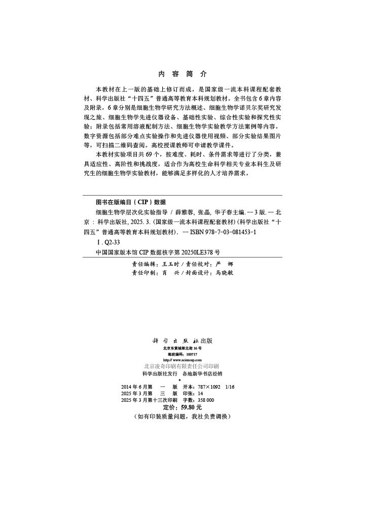 细胞生物学层次化实验指导 第3三版 十四五普通高等教育本科规划教材 本科课程配套教材 薛雅蓉 张晶 华子春 主编 科学出版社