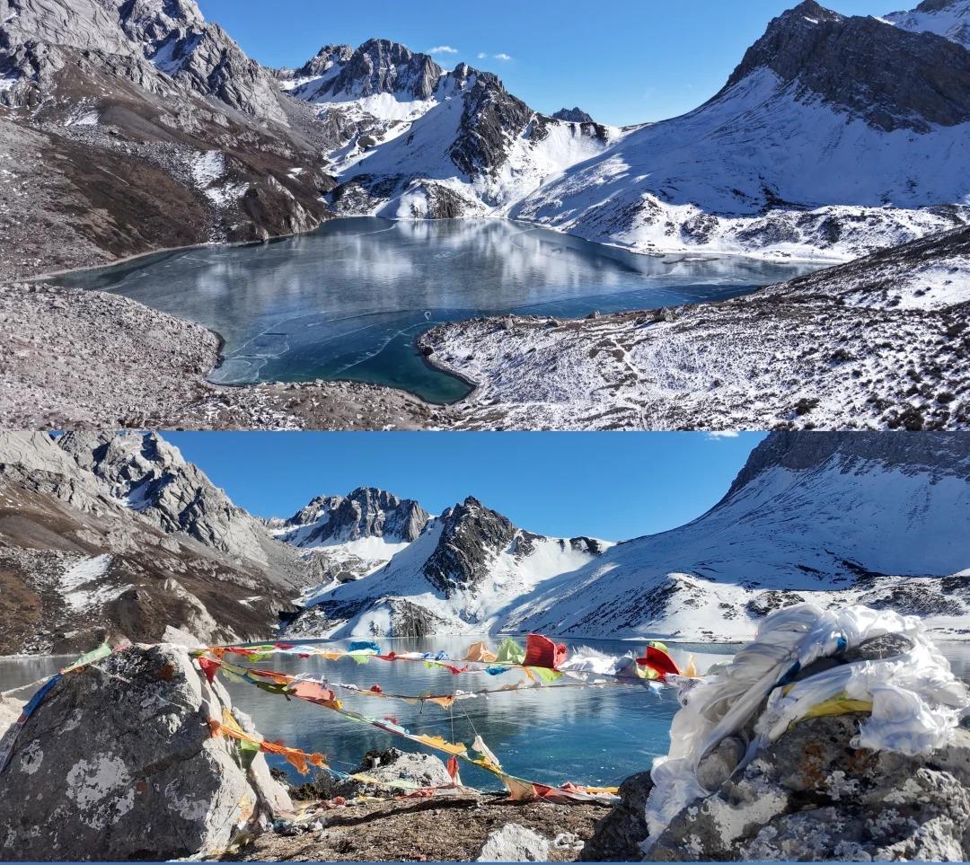 垭口的经幡随风舒展,将藏民的祈愿送往云端,与冰湖、红岩、雪山构成一幅兼具自然壮阔与人文温情的画卷。