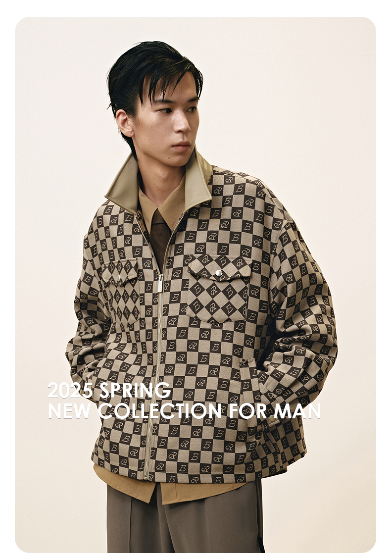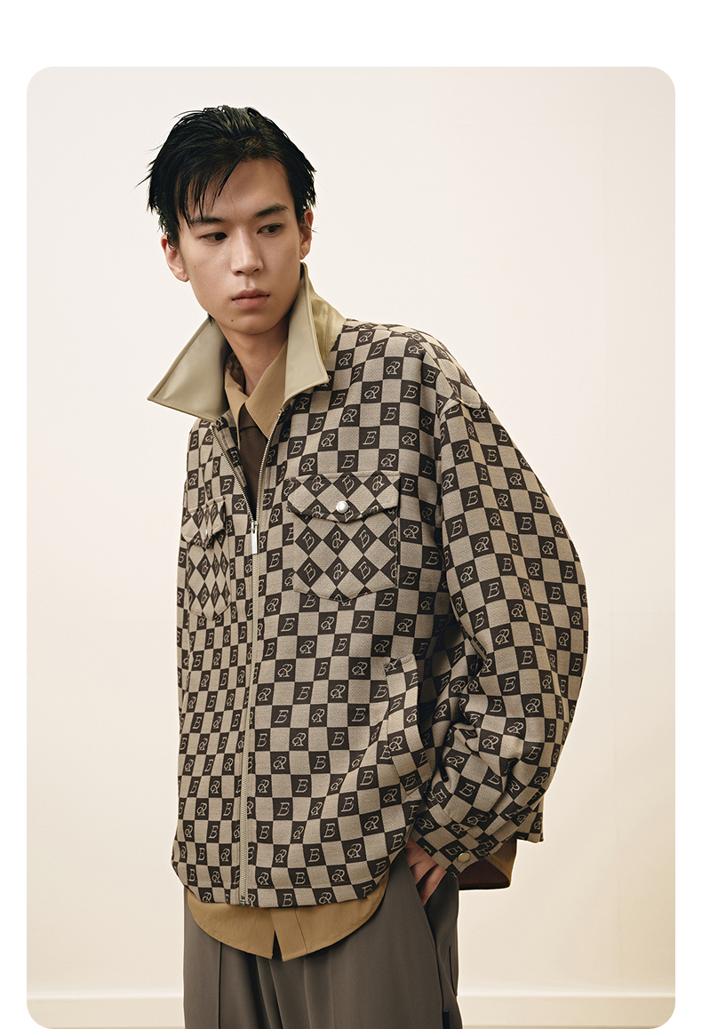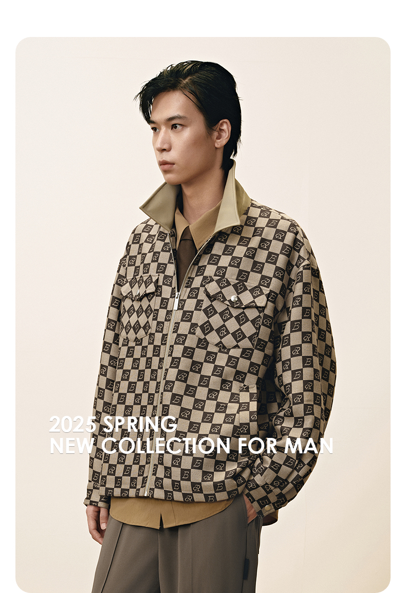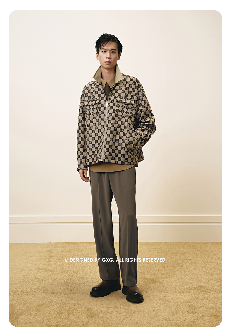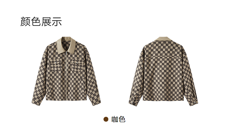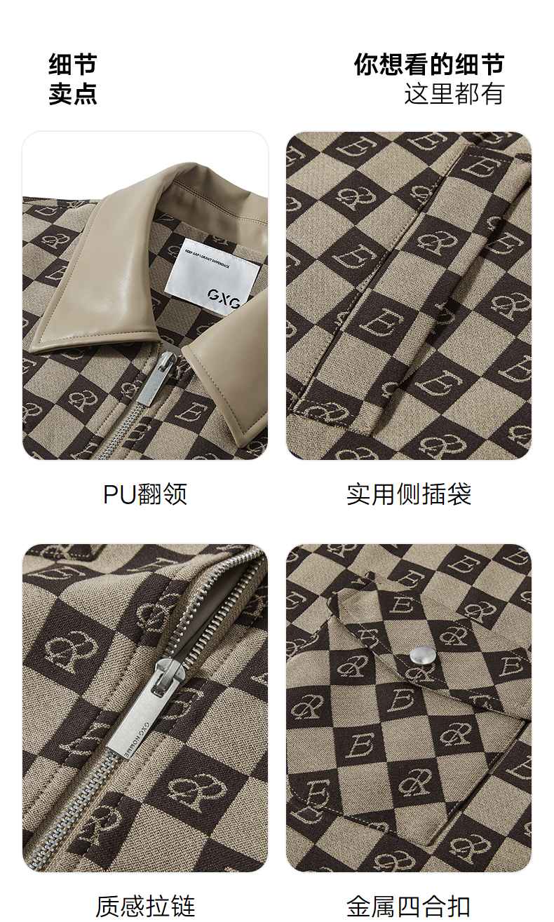 GXG男装 提花棋盘格潮流领口PU翻领通勤简约夹克外套 25年春热卖