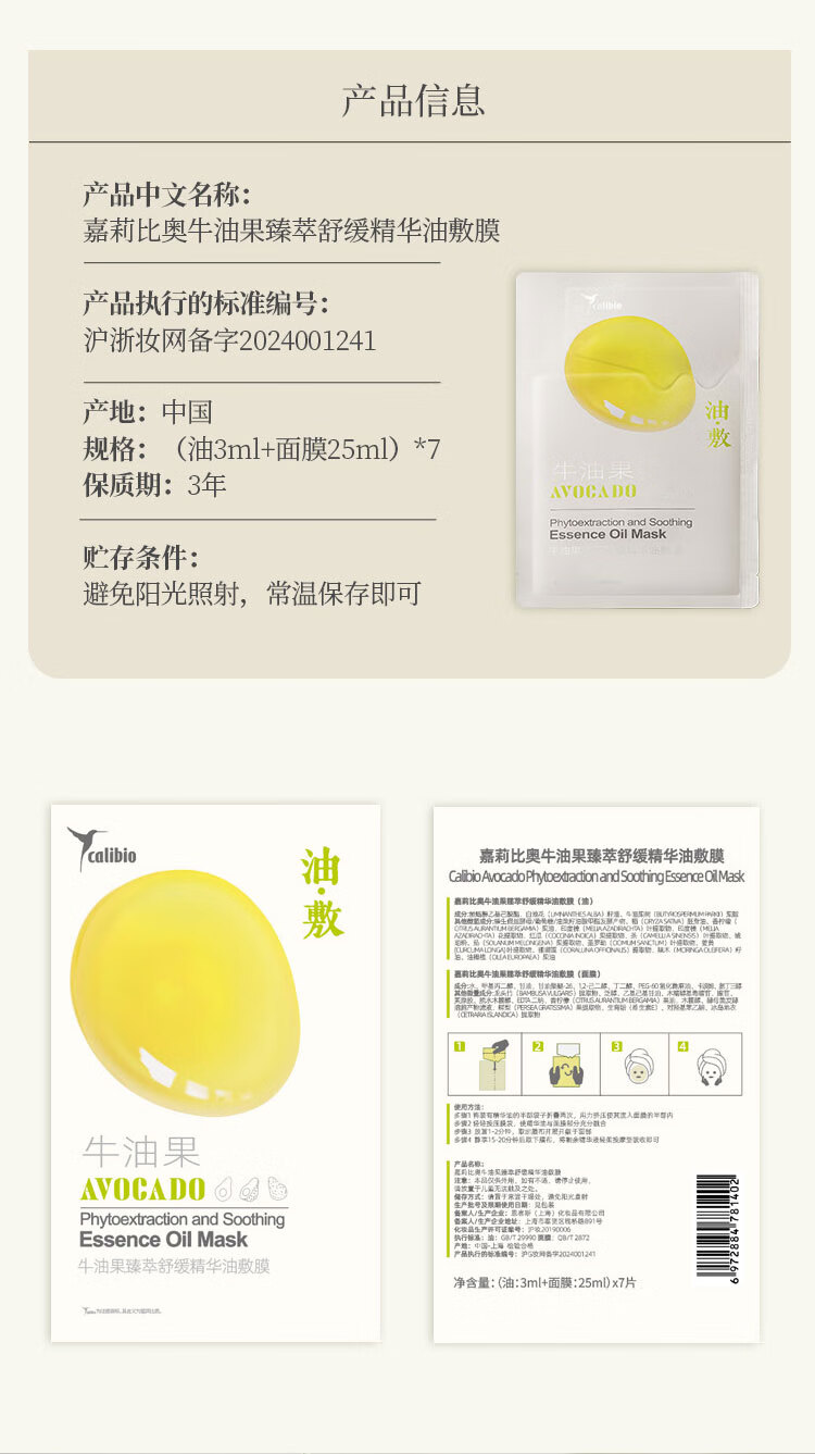 嘉莉比奥牛油果臻萃舒缓精华油敷膜女保湿面膜 7片/盒