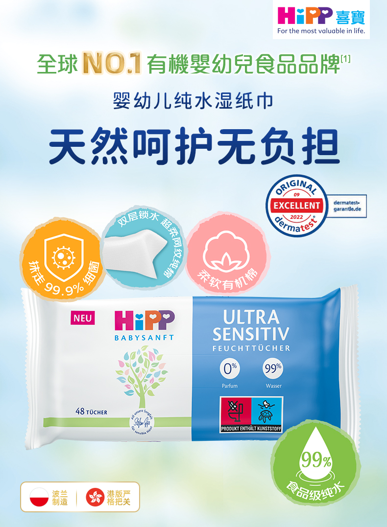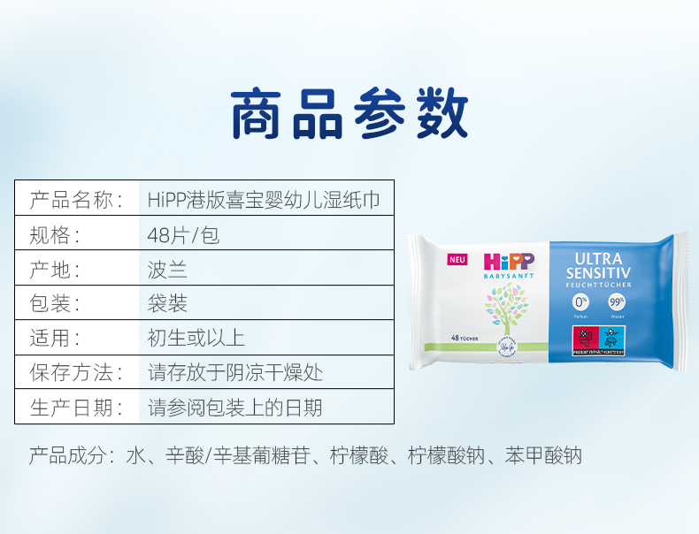 喜宝(HiPP)港版婴儿湿纸巾擦手口清洁屁屁亲肤温和新生儿湿巾 48张*5包/袋