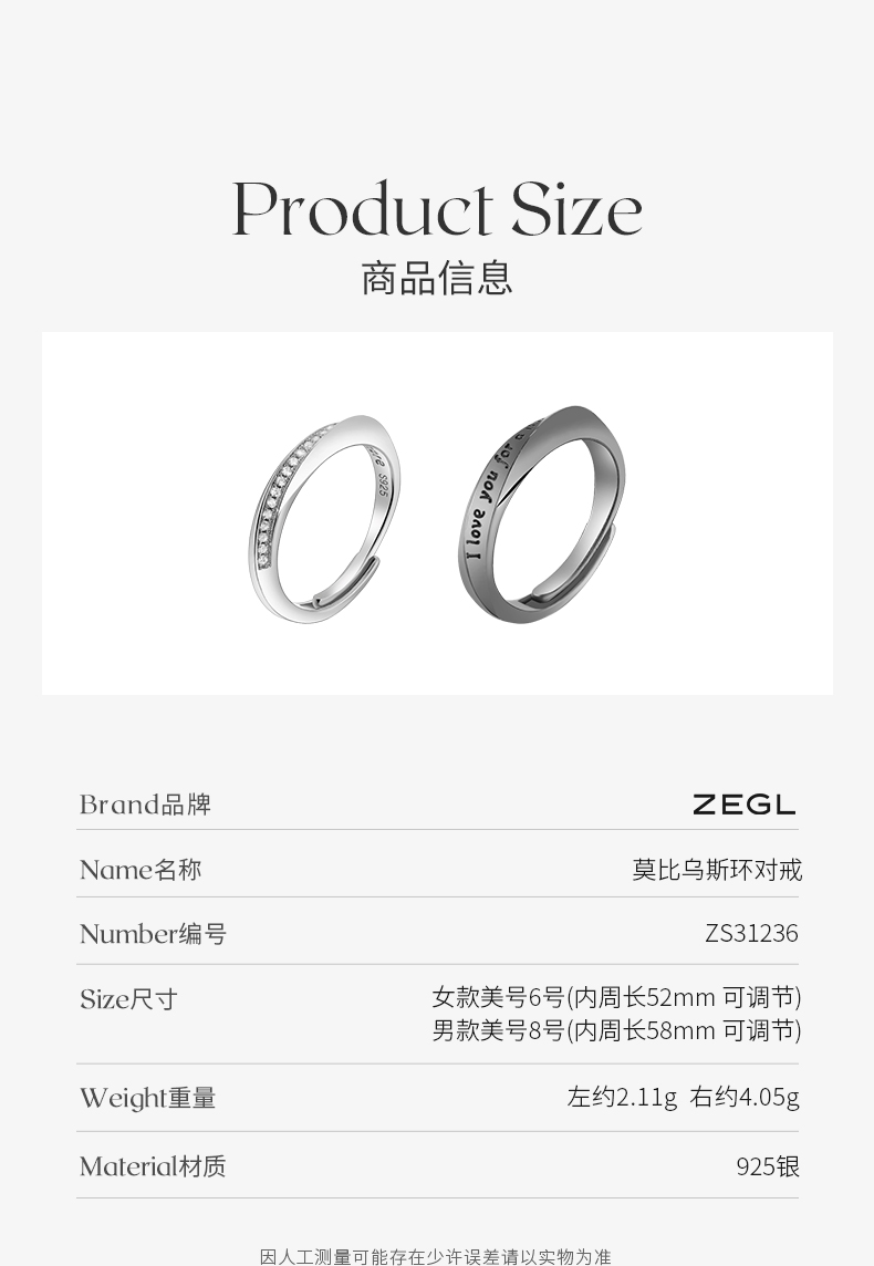 ZEGL设计师925纯银莫比乌斯环情侣戒指开口对戒情人节礼物送女友