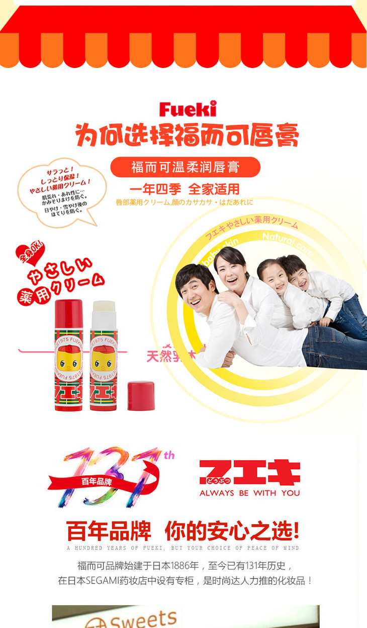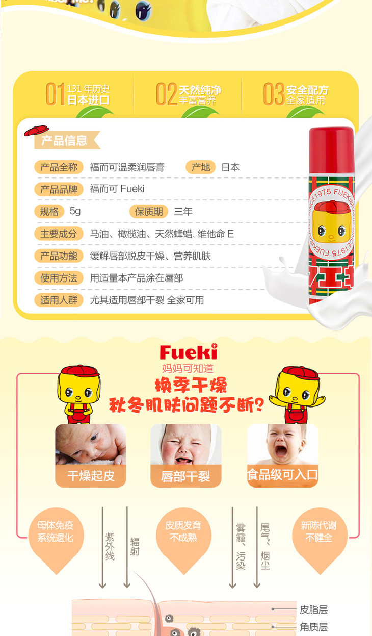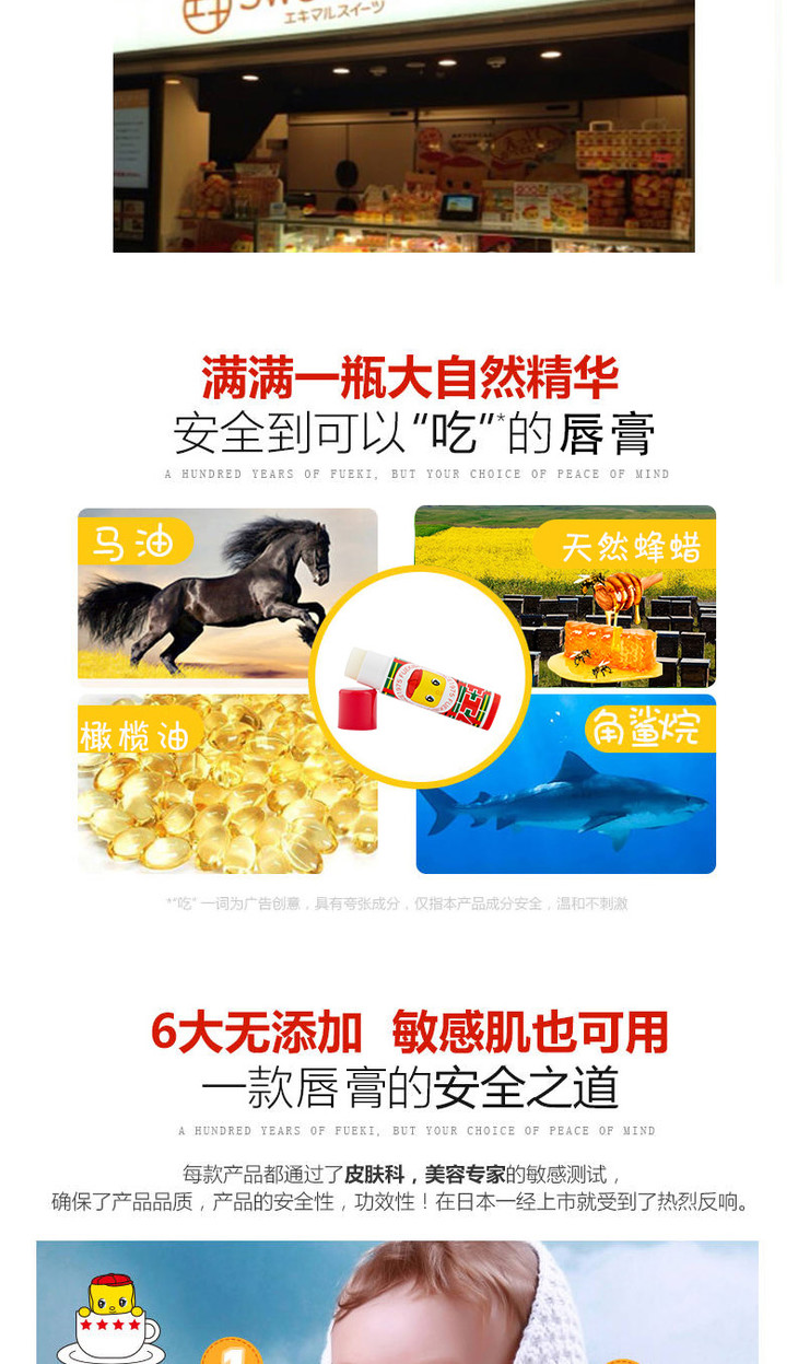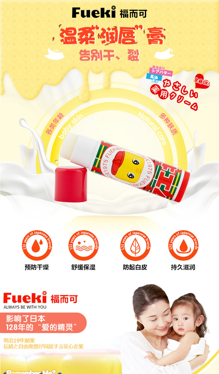 日本Fueki福而可【5g】儿童唇膏天然保湿滋润补水可食用宝宝孕妇婴儿润唇膏