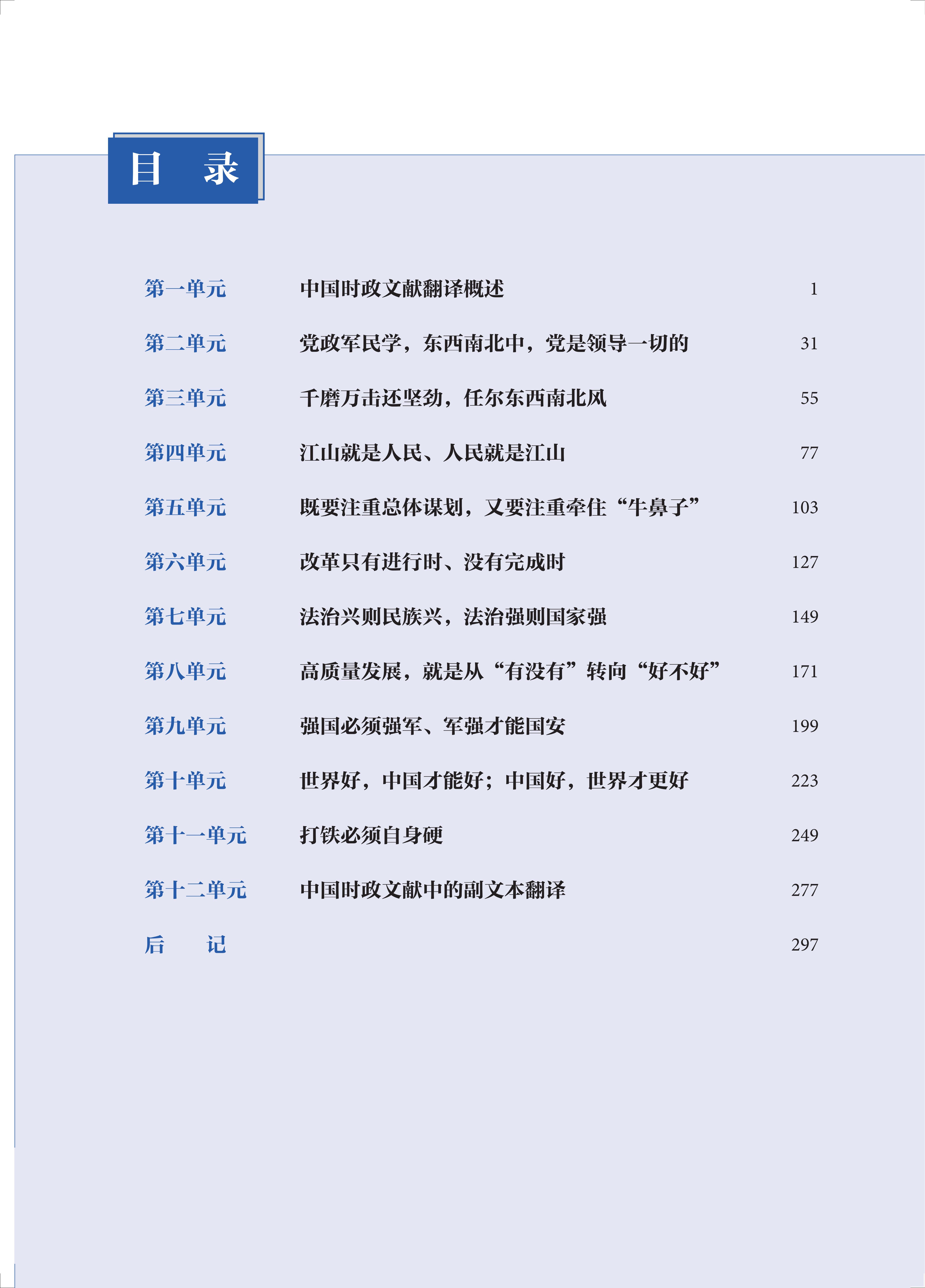 《高级汉英笔译教程》共12 个单元。第一单元概述中国时政文献的基本特点、外译时应遵循的基本原则、常见问题及建议处理办法。第十二单元介绍中国时政文献中的副文本类型及主要翻译方法。第二至第十一单元为主题单元,每个主题单元探讨习近平新时代中国特色社会主义思想的一个重要方面,通过文本试译、译文评析、思考讨论等活动提升学习者的理论素养和翻译能力。教程将习近平新时代中国特色社会主义思想的学习与翻译能力培养有机融合,旨在培养学习者的翻译能力、思辨能力、跨文化交际能力和国际传播能力,是他们成为有家国情怀、全球视野和专业本领的接班人。